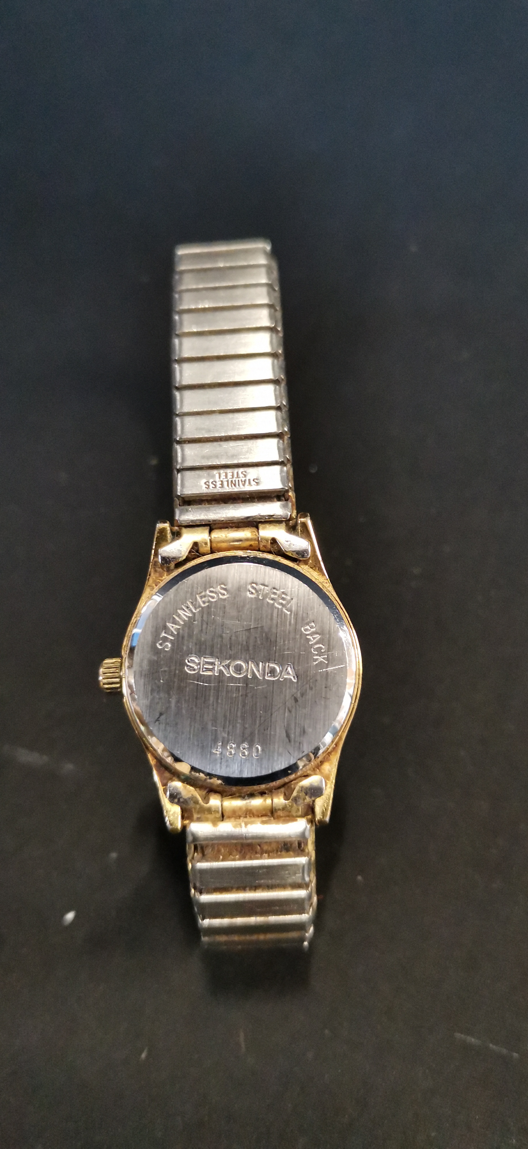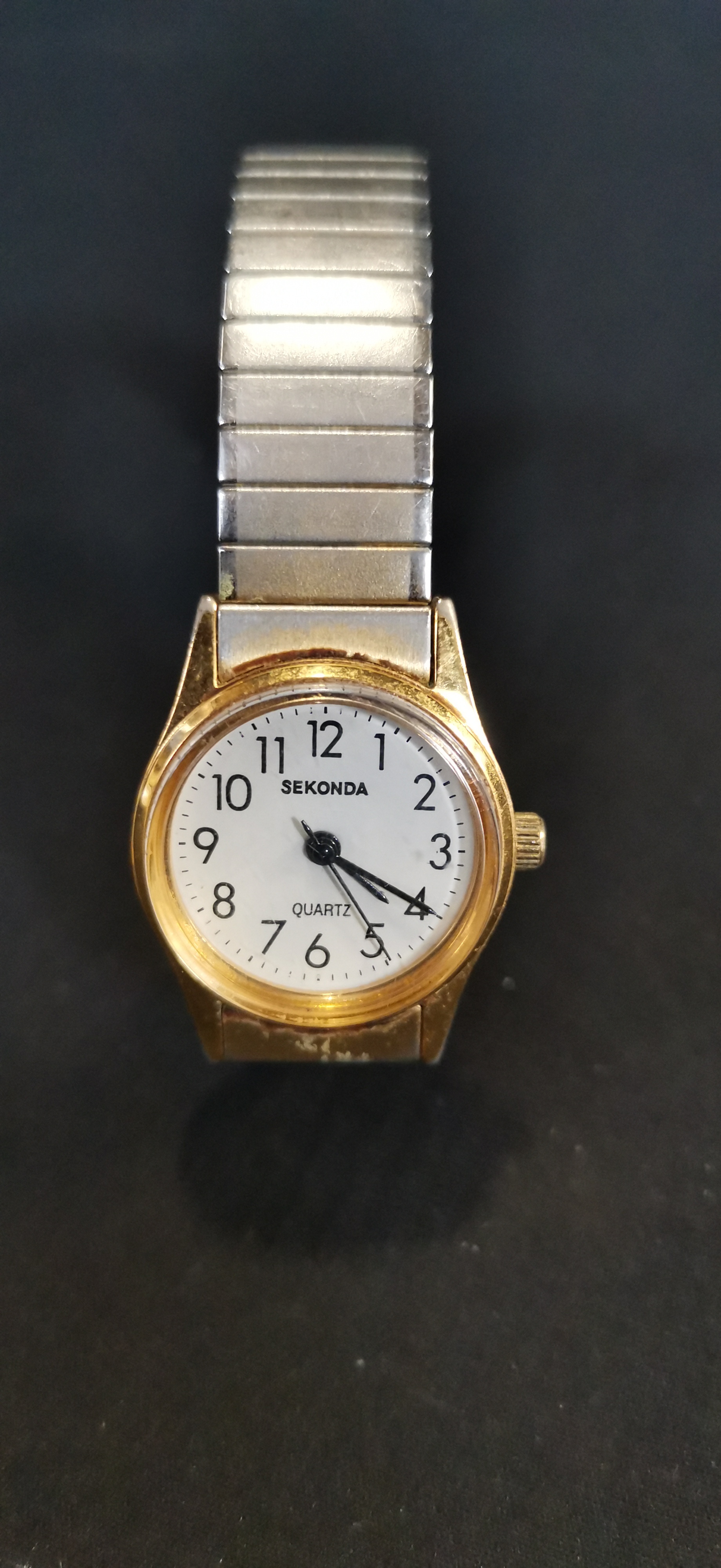 A ladies Sekonda quartz wristwatch featuring a gold-tone case, white dial with Arabic numerals, and a silver-tone stainless steel expander bracelet.