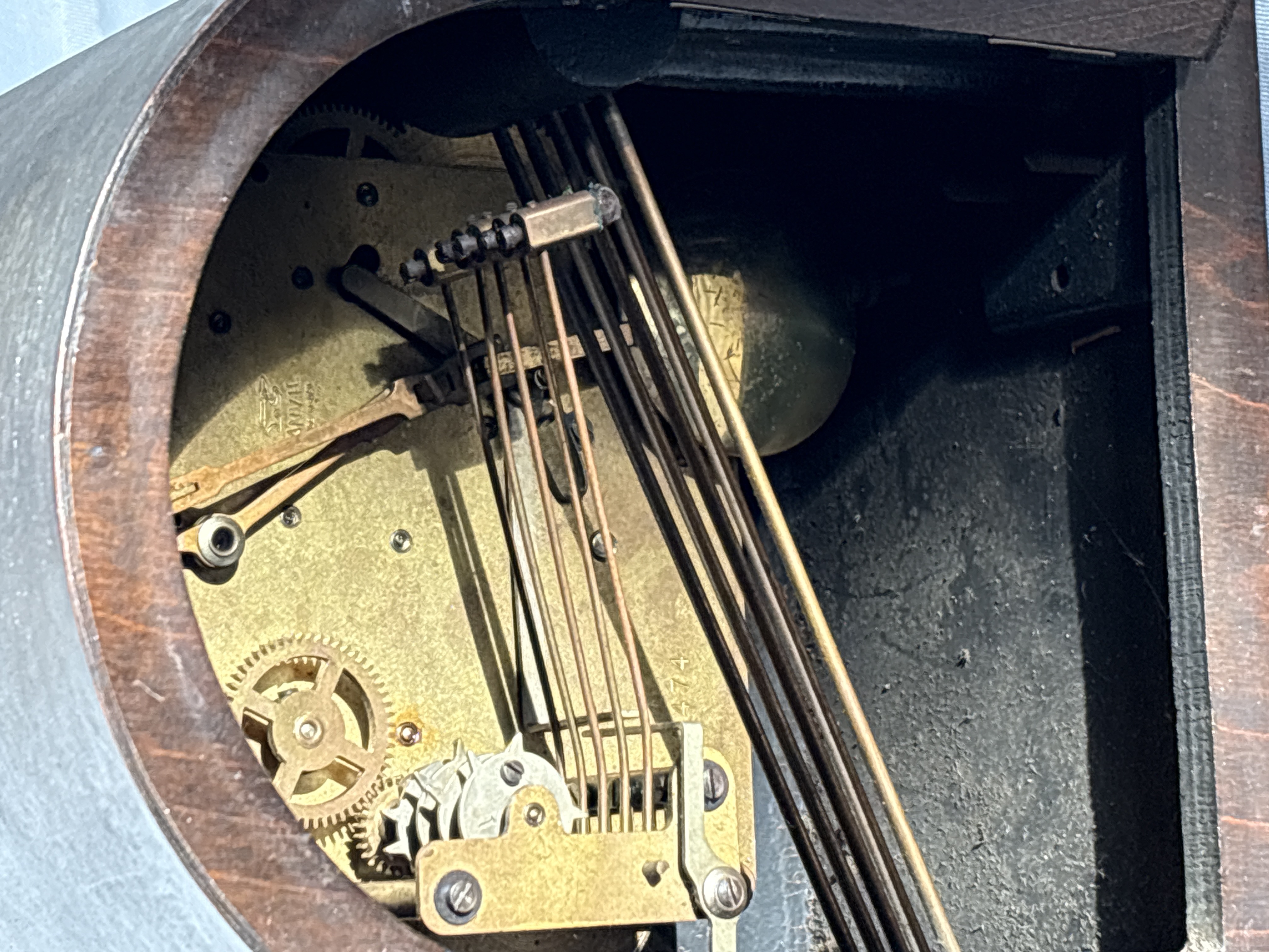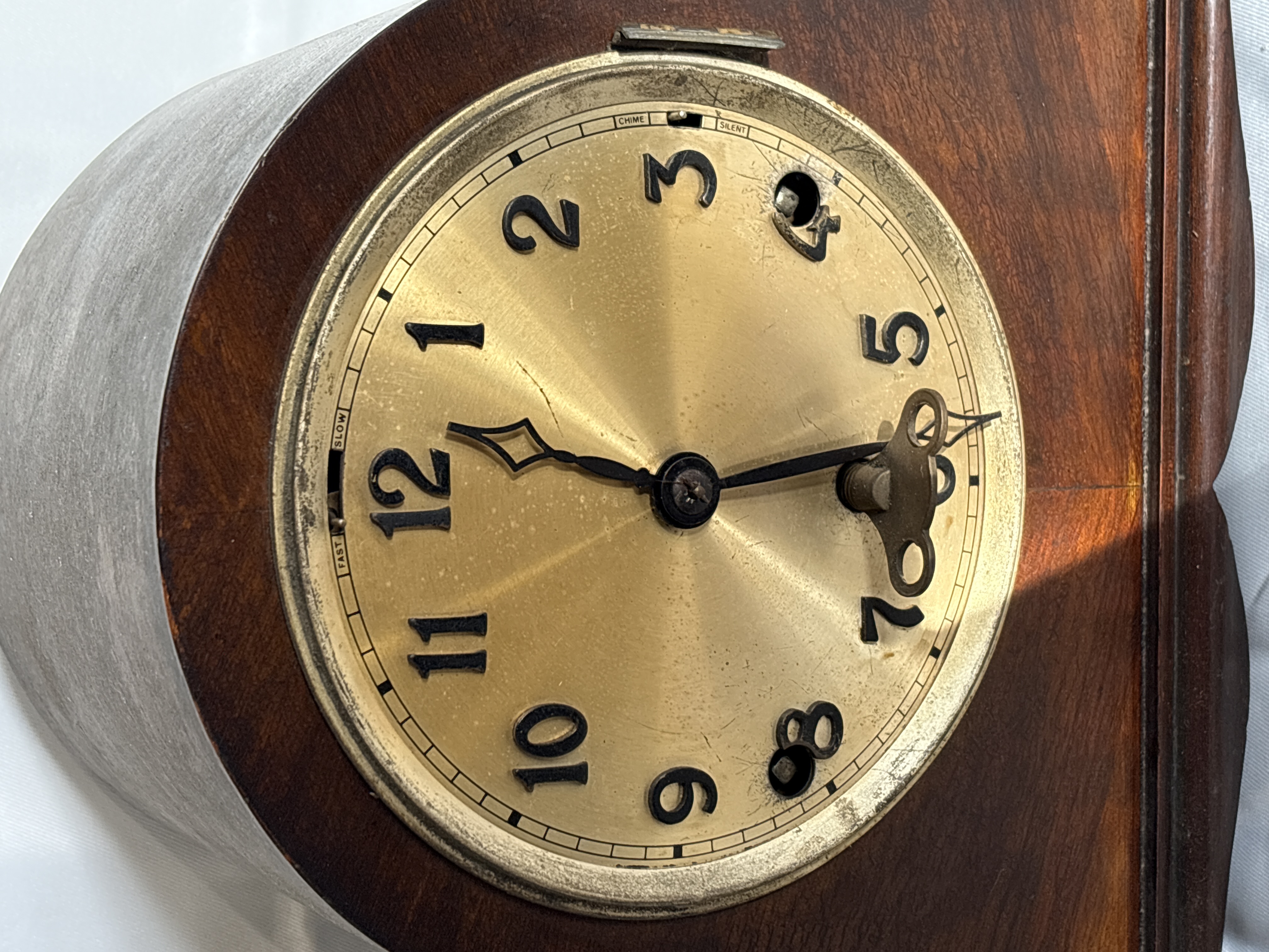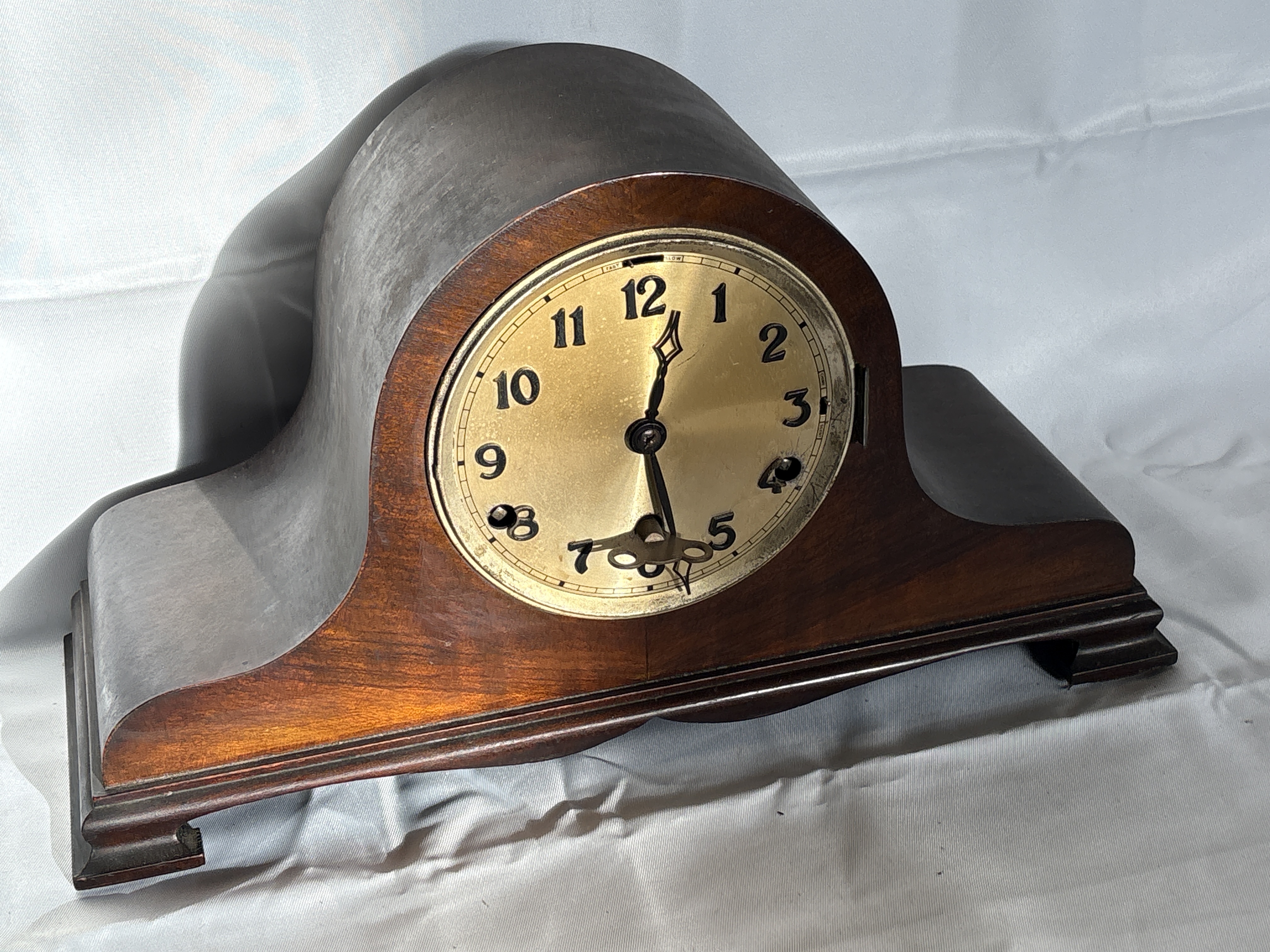 A German mechanical mantle clock in the Napoleon hat or tambour style, manufactured by Anvil. The wooden case features a dark mahogany-toned finish and a moulded plinth base. The circular brass-tone dial is set with applied black Arabic numerals and a matted centre, featuring black spade-style hands. The dial includes a Chime/Silent selector lever at the 12 o’clock position and Fast/Slow adjustment slots for regulation. The eight-day mechanical movement is accessed via the rear and is stamped with the Anvil company mark, featuring an anvil symbol and the text MADE IN GERMANY. The movement is fitted with a five-rod gong chime mechanism and a pendulum. Three winding holes are present on the dial face, and a winding key is included.