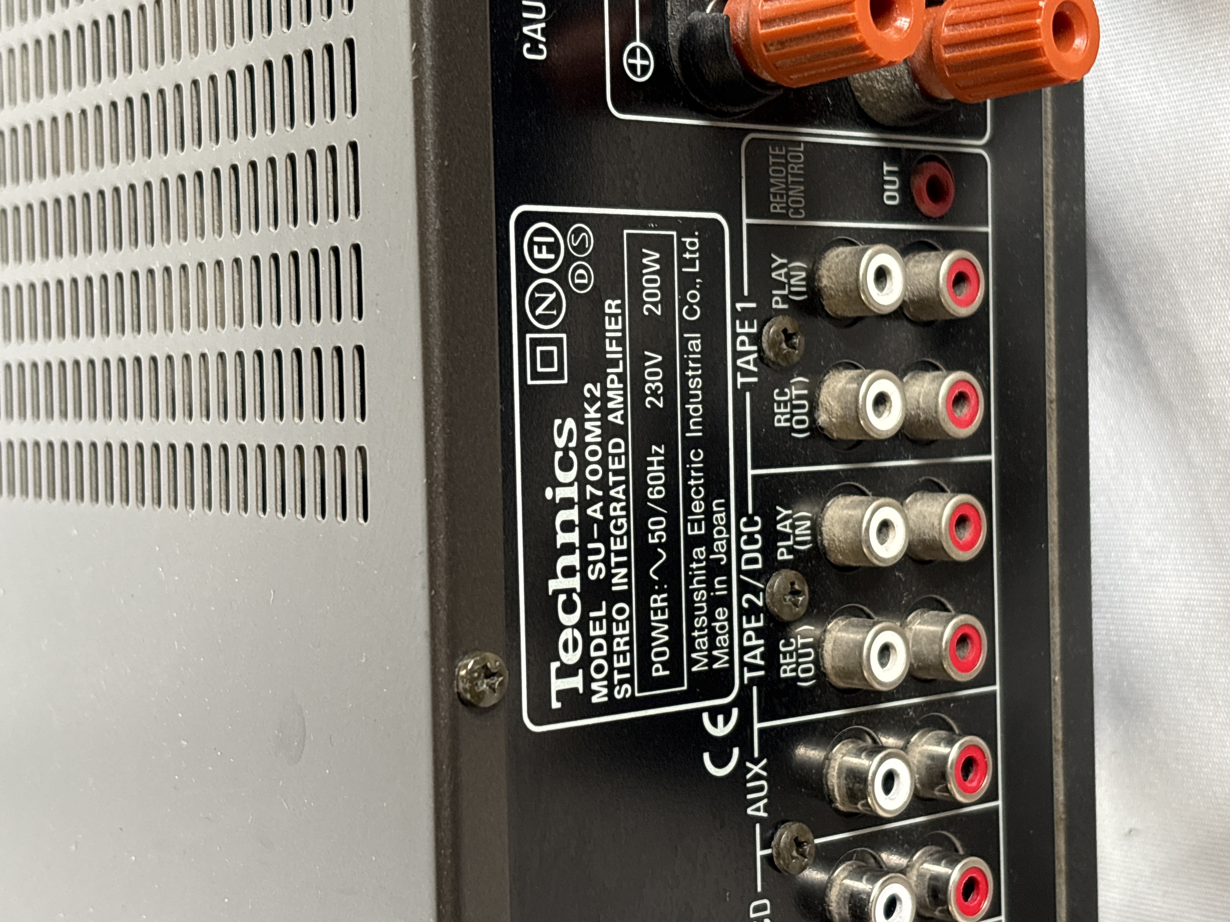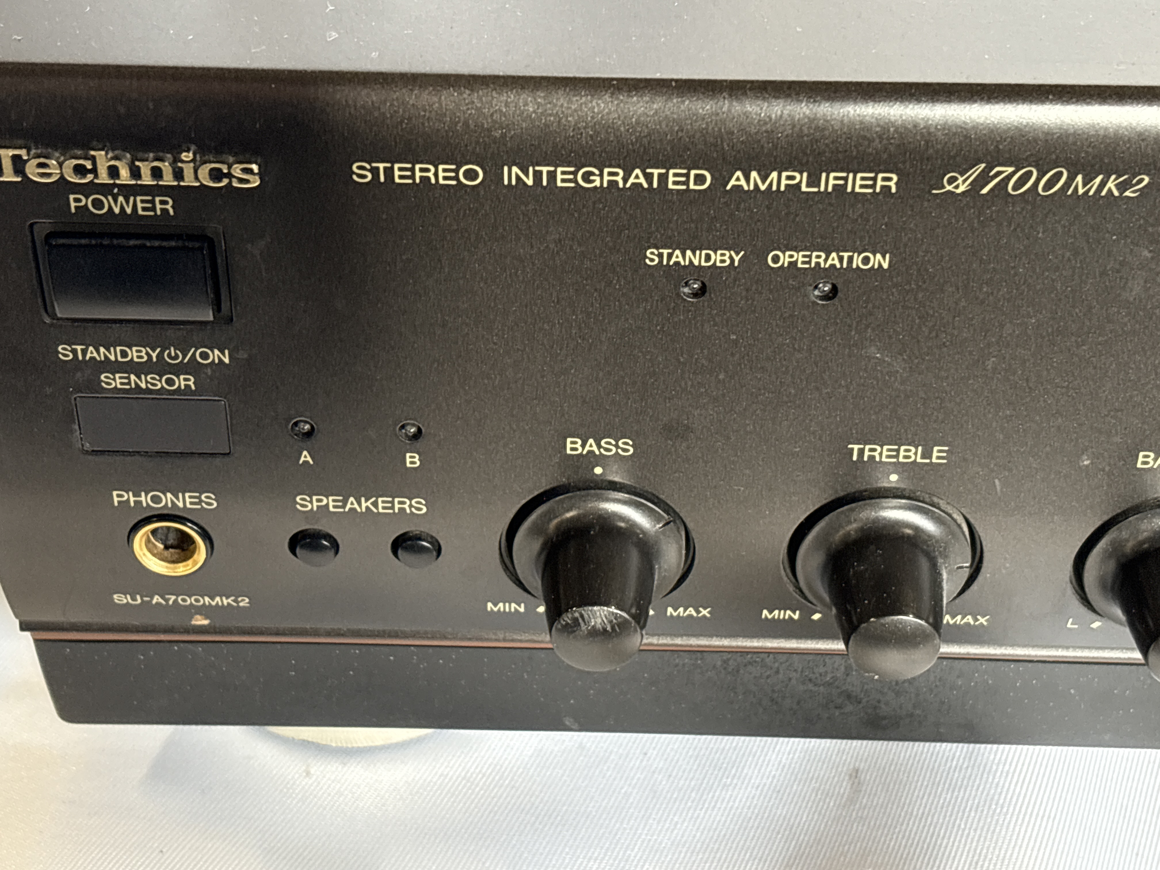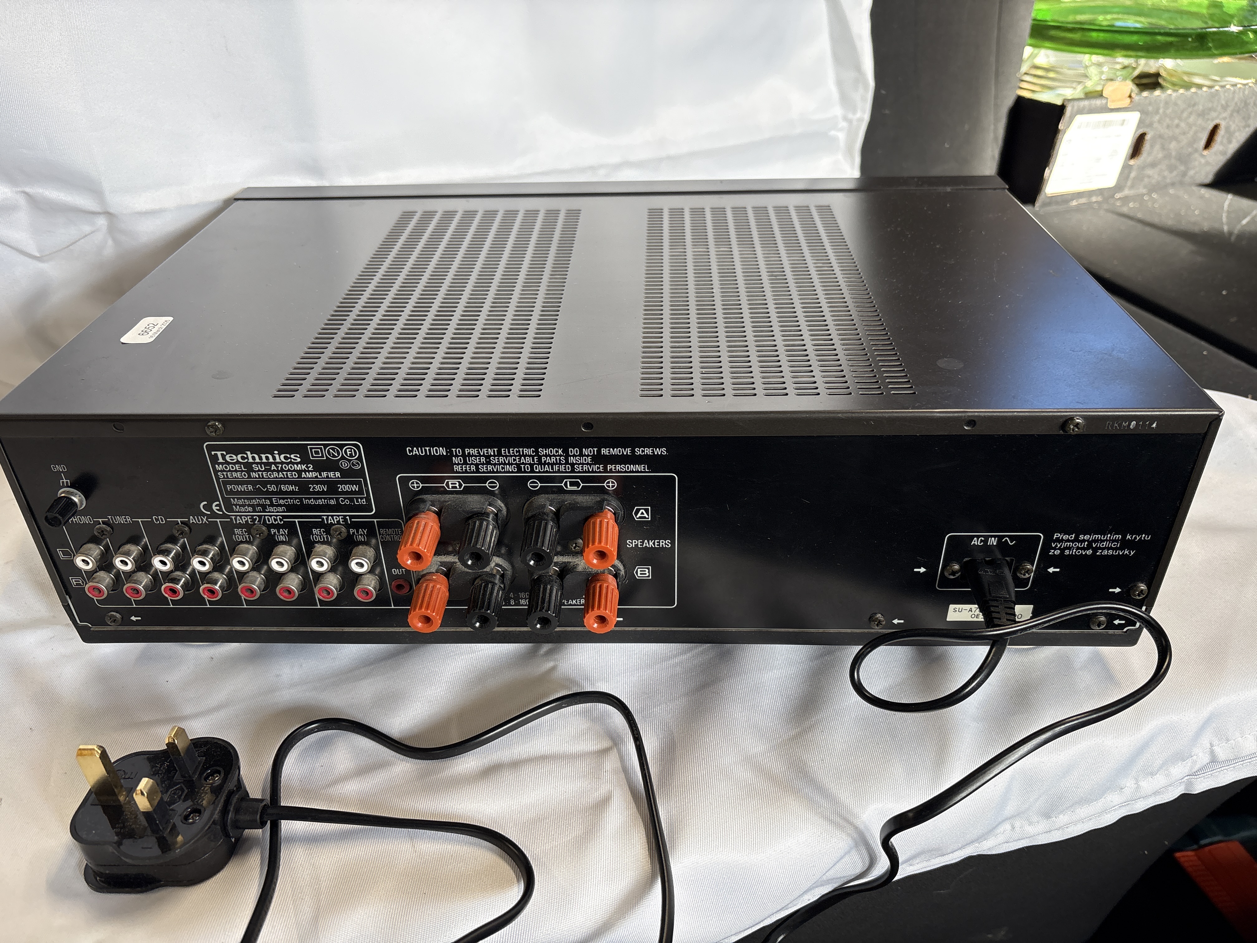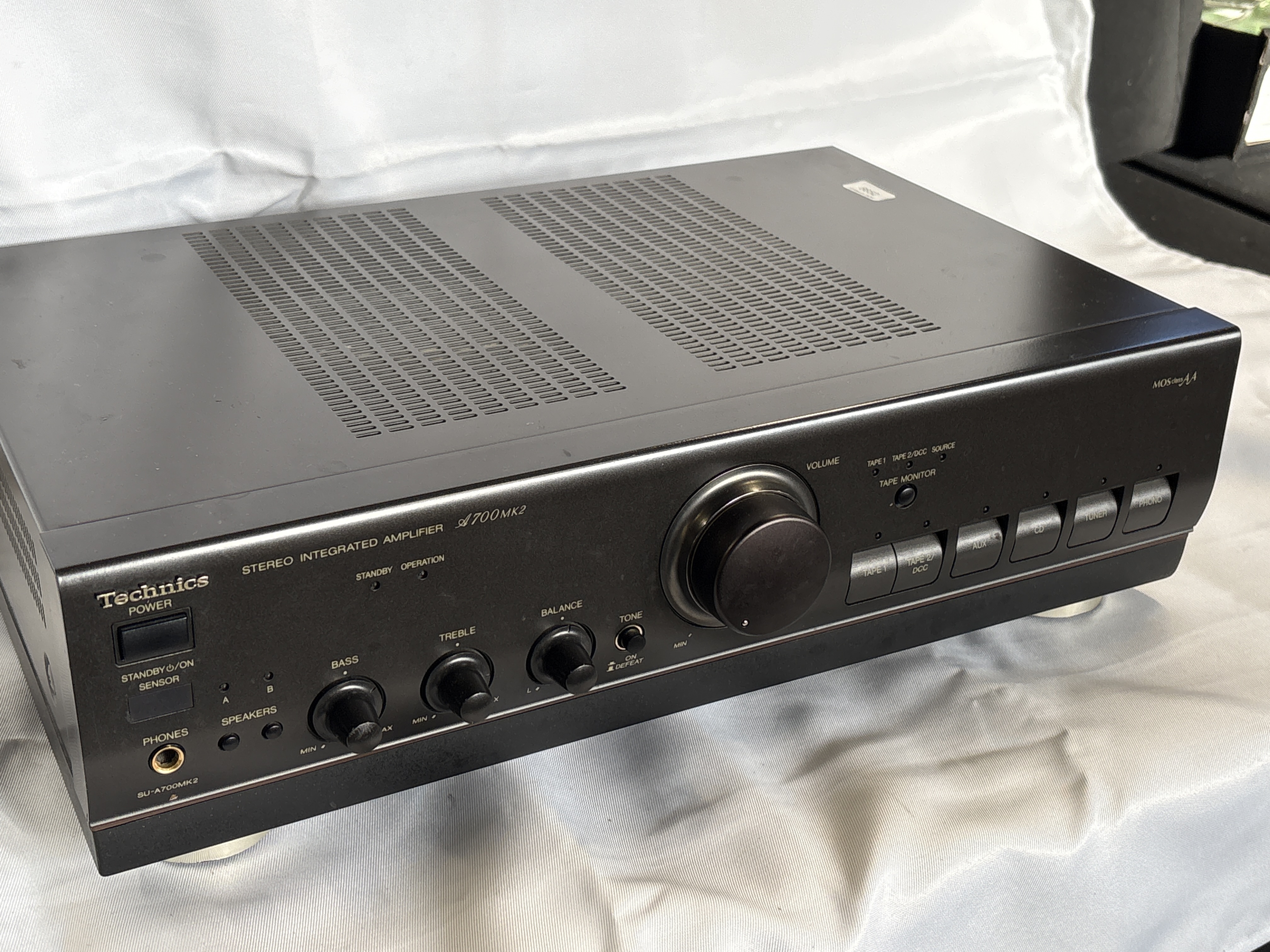 A Technics SU-A700MK2 stereo integrated amplifier manufactured by Matsushita Electric Industrial Co., Ltd. in Japan. The unit is constructed with a black metal chassis and a plastic front fascia. The front control panel features a large central rotary volume control, smaller rotary controls for bass, treble, and balance, and push-button selectors for power, speaker sets A and B, tone defeat, and input sources. Input selections include Phono, Tuner, CD, Aux, Tape 1, and Tape 2/DCC. The fascia includes a 6.35mm headphones jack and is marked with the MOS class AA circuit designation. The rear panel contains RCA input and output jacks for various audio sources, a ground terminal, a remote control jack, and two sets of speaker binding posts. The specification plate indicates the unit is designed for 230V, 50/60Hz power supply with a 200W consumption rating. The device is fitted with a standard UK three-pin power plug.