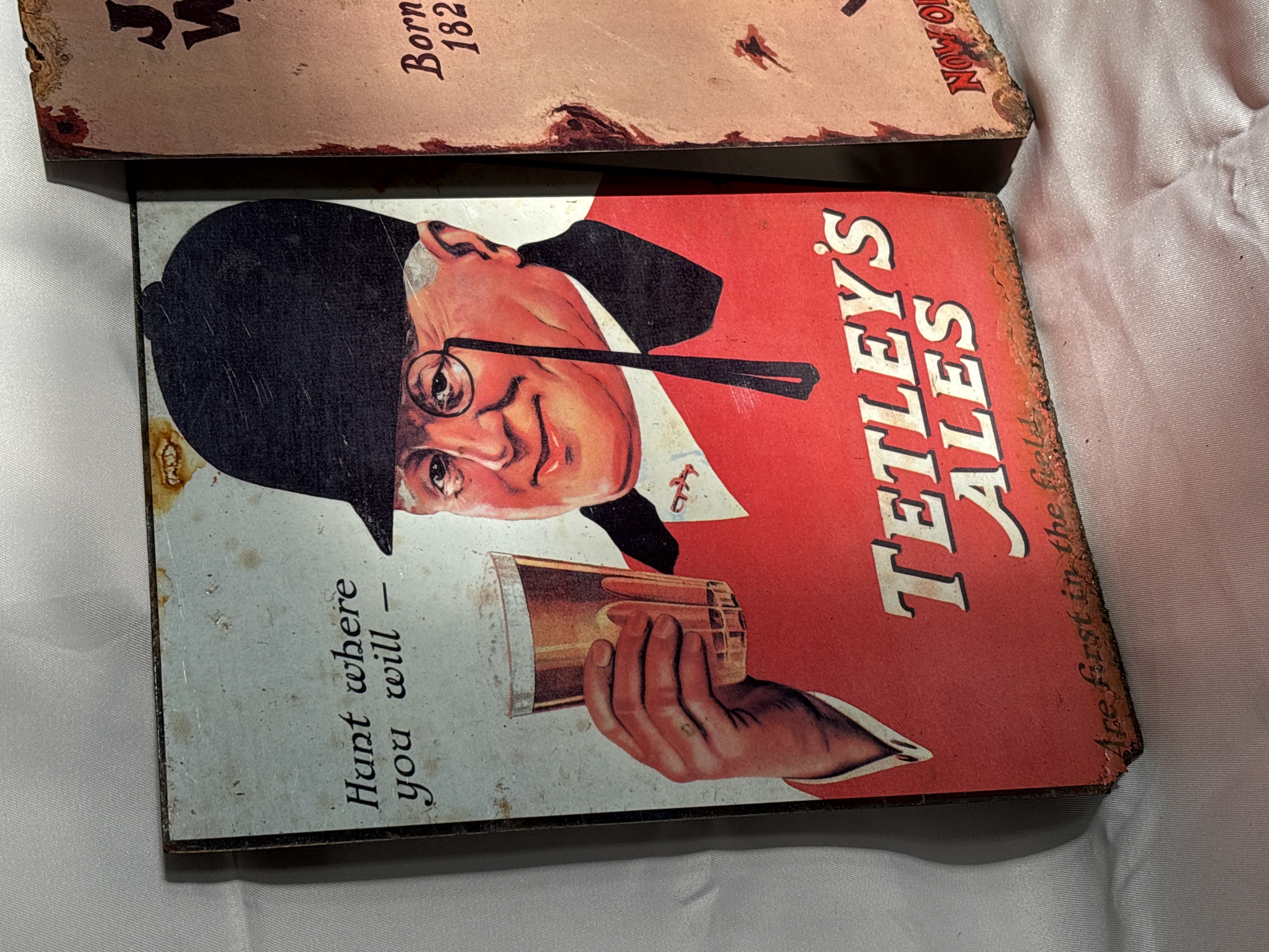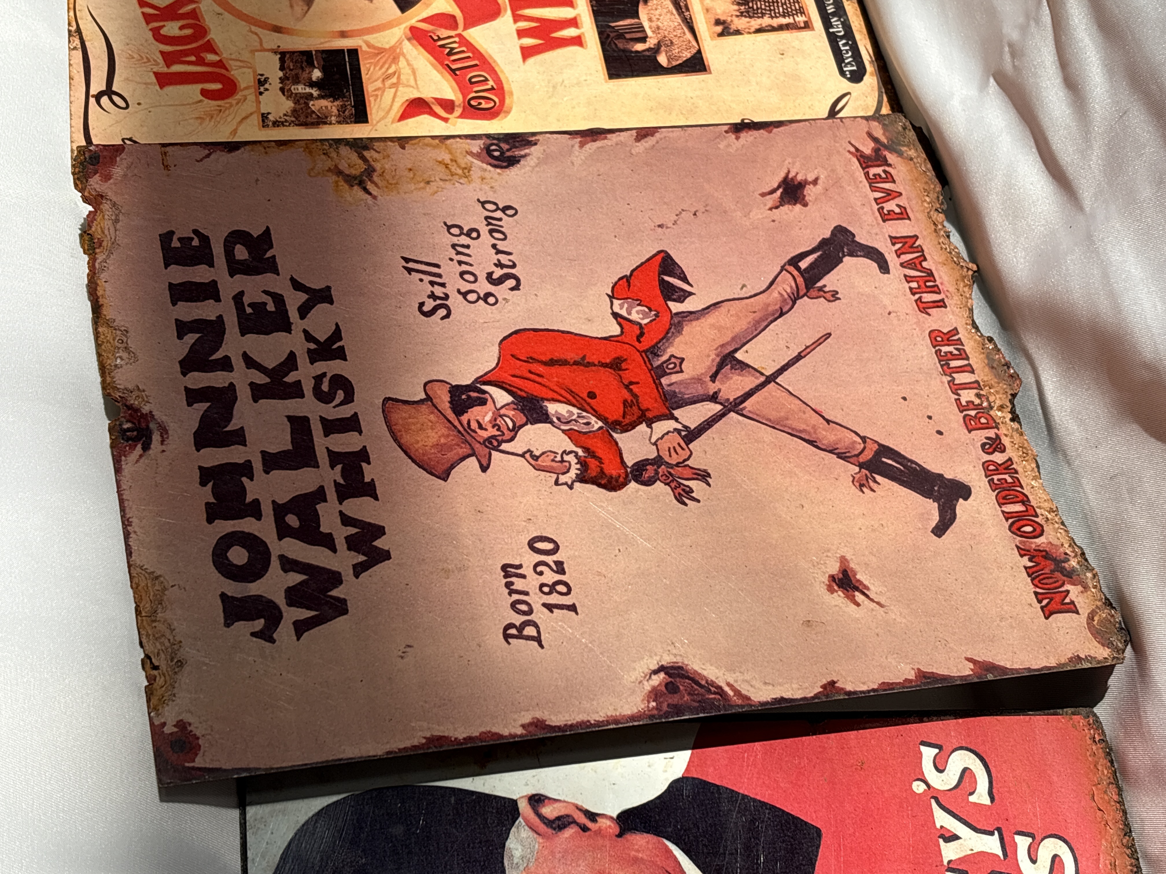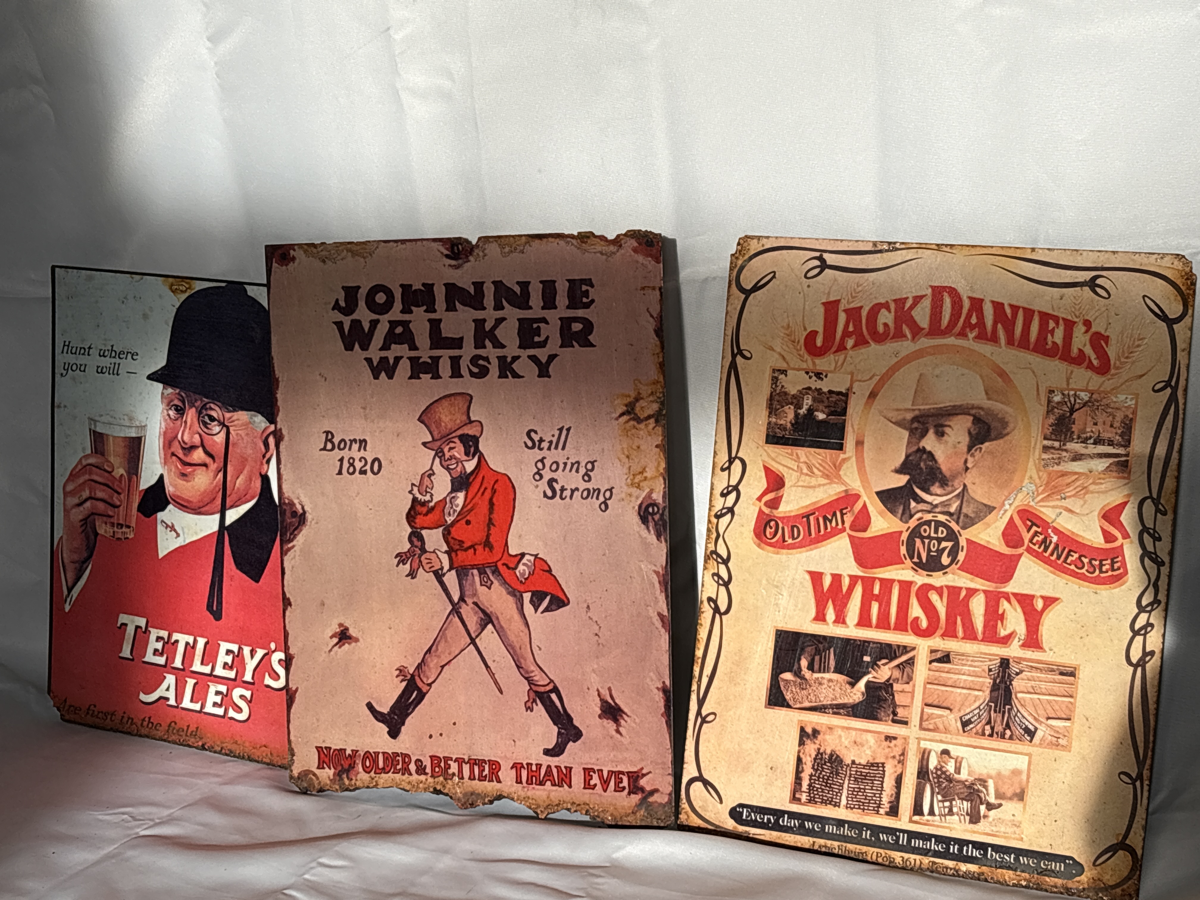 This lot comprises three reproduction advertising pics produced as decorative wall signs. The signs are manufactured from metal or a rigid composite material and feature printed graphic designs in the style of vintage advertisements. The first sign depicts Tetley’s Ales with a fox hunter motif and the slogan Hunt where you will — Tetley’s Ales are first in the field. The second sign features the Johnnie Walker Striding Man logo with the text Born 1820 Still going Strong and Now Older & Better Than Ever. The third sign is a collage-style advertisement for Jack Daniel’s Old No 7 Tennessee Whiskey, featuring a central portrait of Jack Daniel alongside archival distillery imagery and the text Lynchburg (Pop. 361) Tenn. Each piece incorporates simulated distressing, including printed rust, pitting, and weathered edges, to mimic an aged appearance.