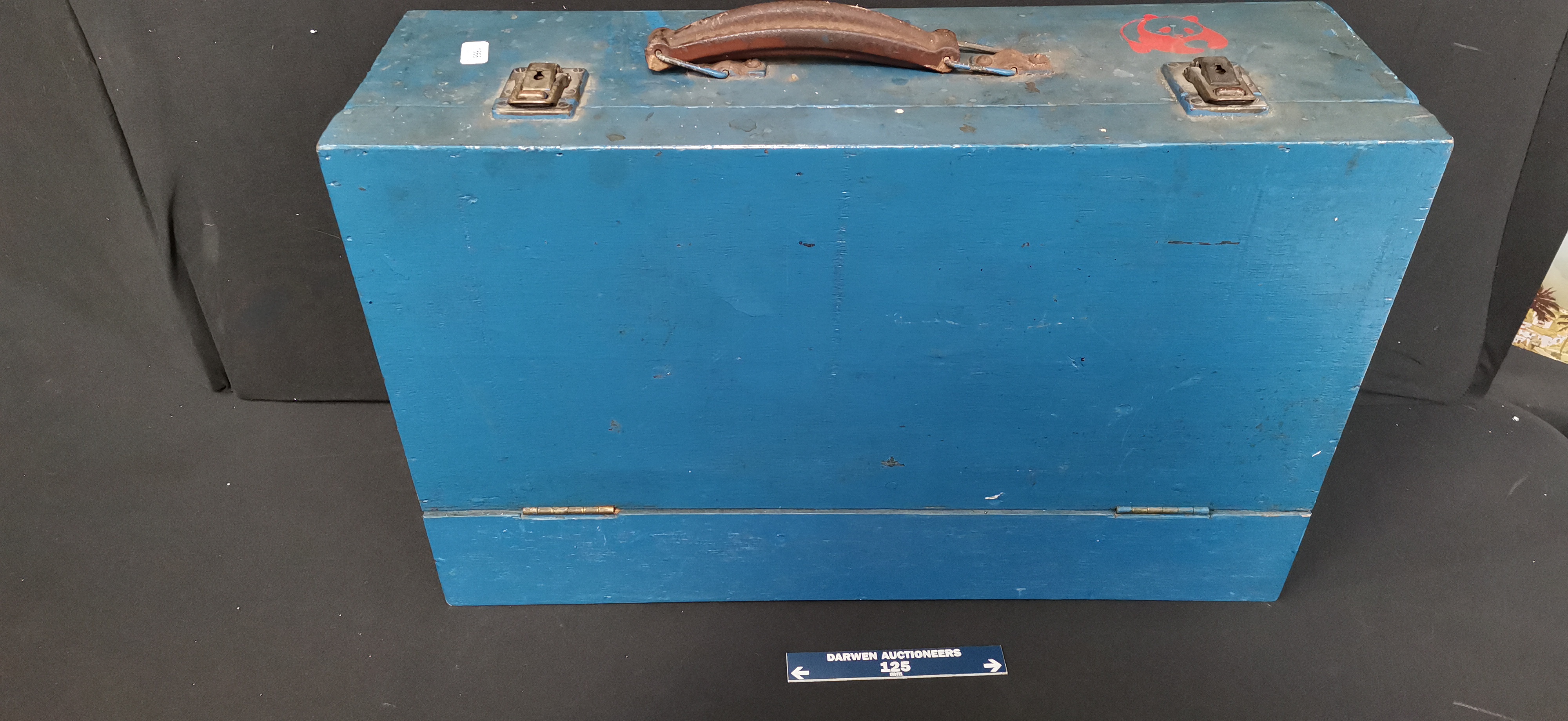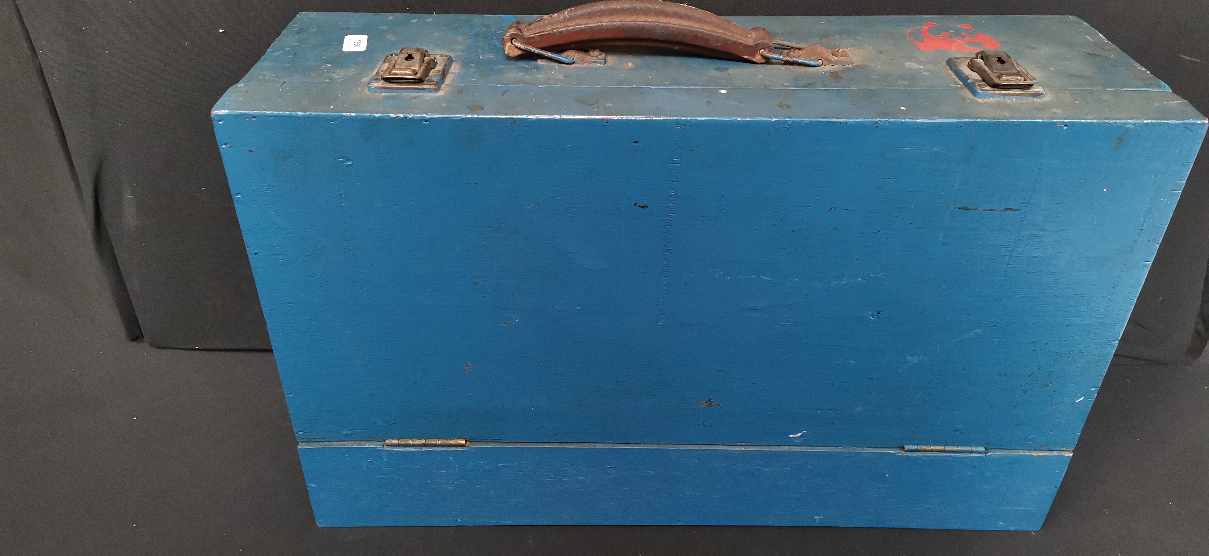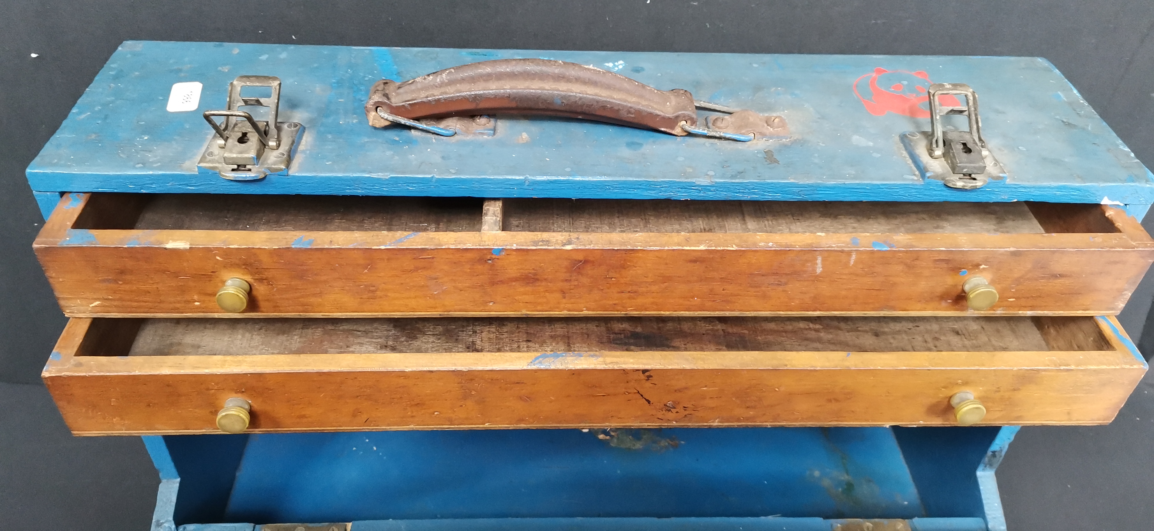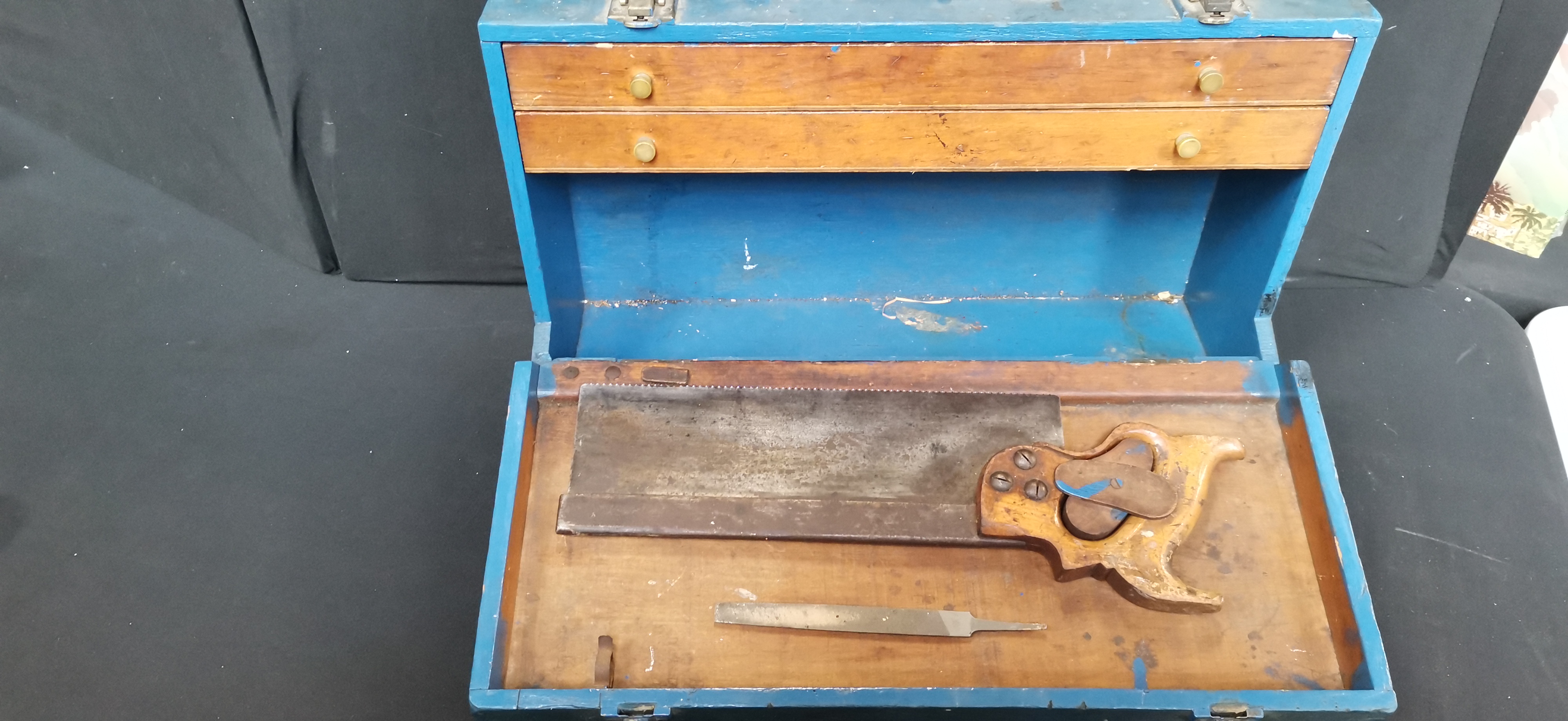 A blue wooden toolbox featuring a red WWF panda logo on its lid and containing a hand saw and a metal file inside its unpainted wood drawers and interior compartment.
