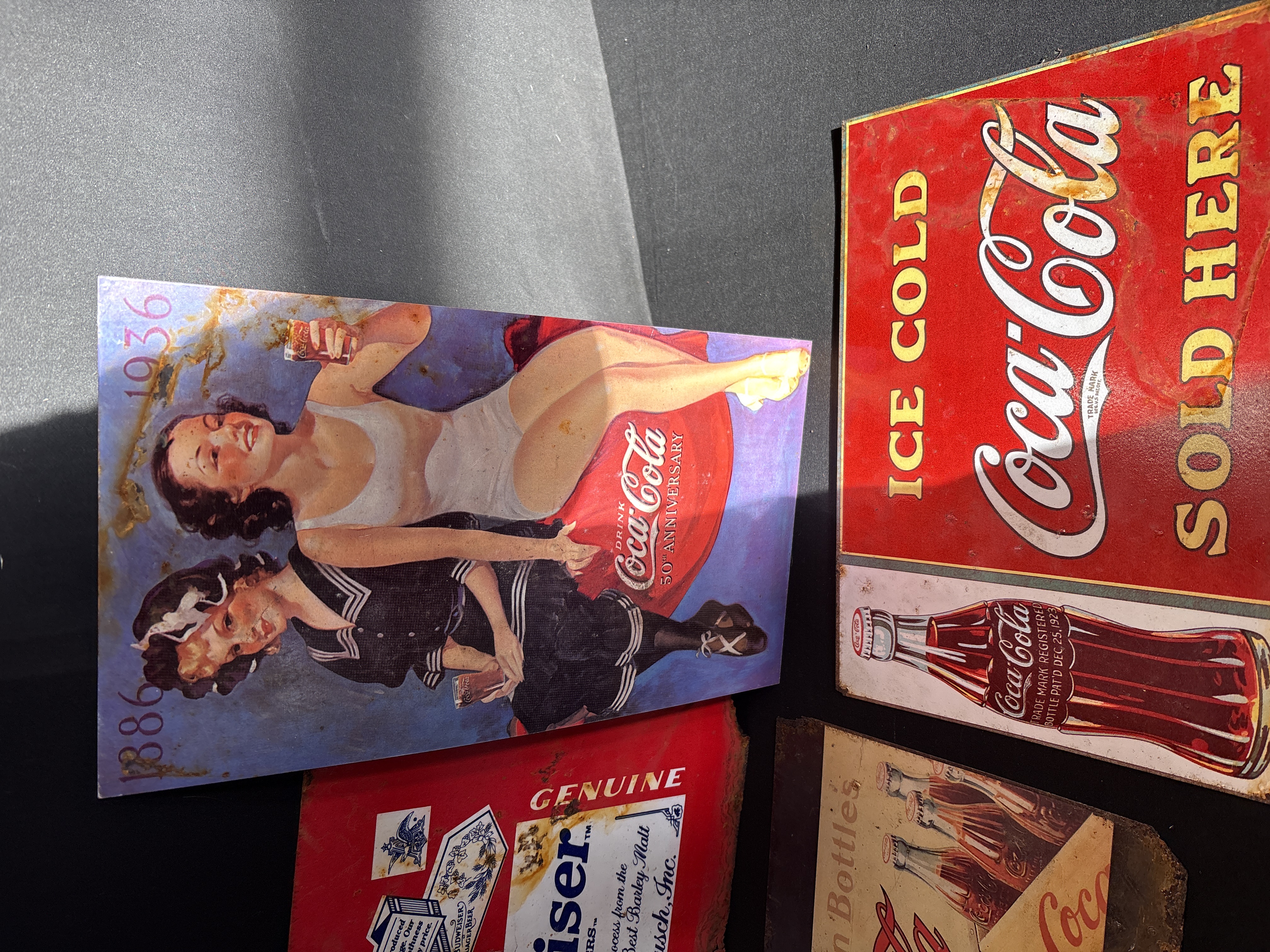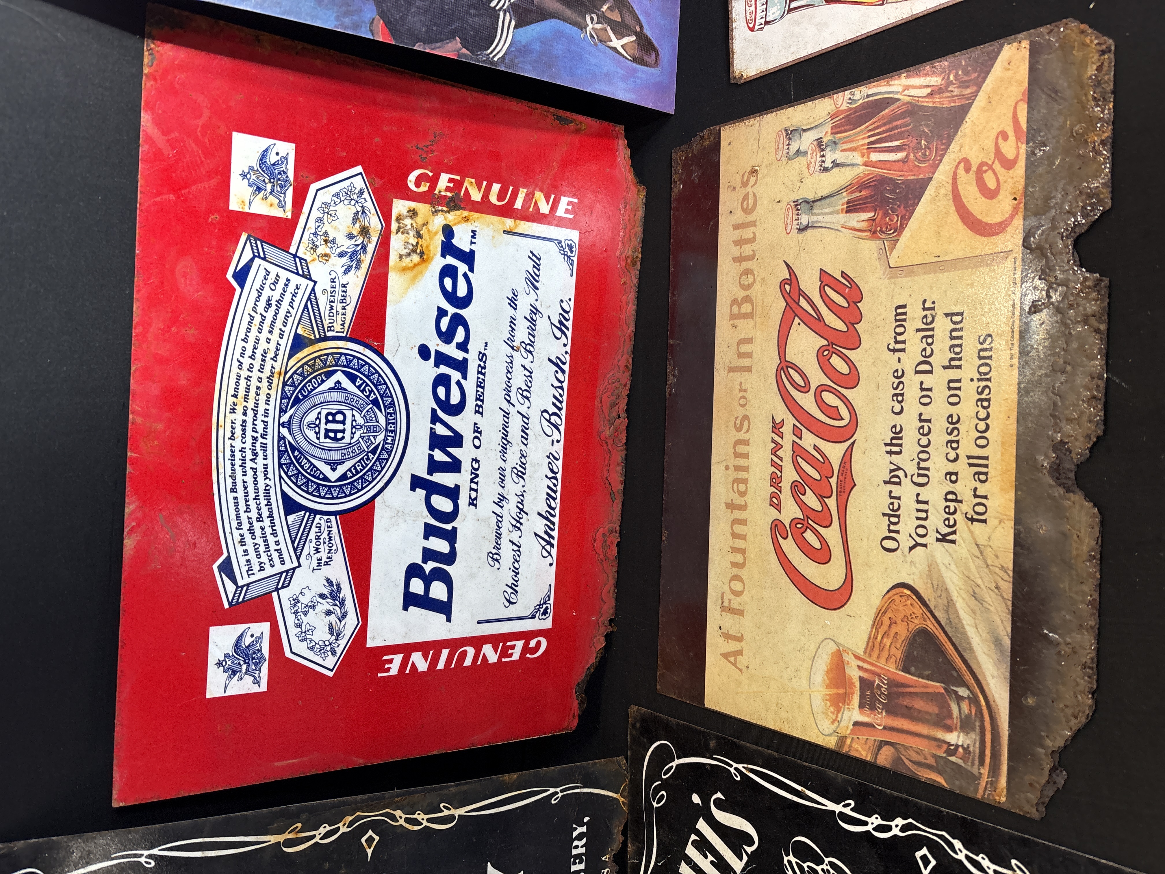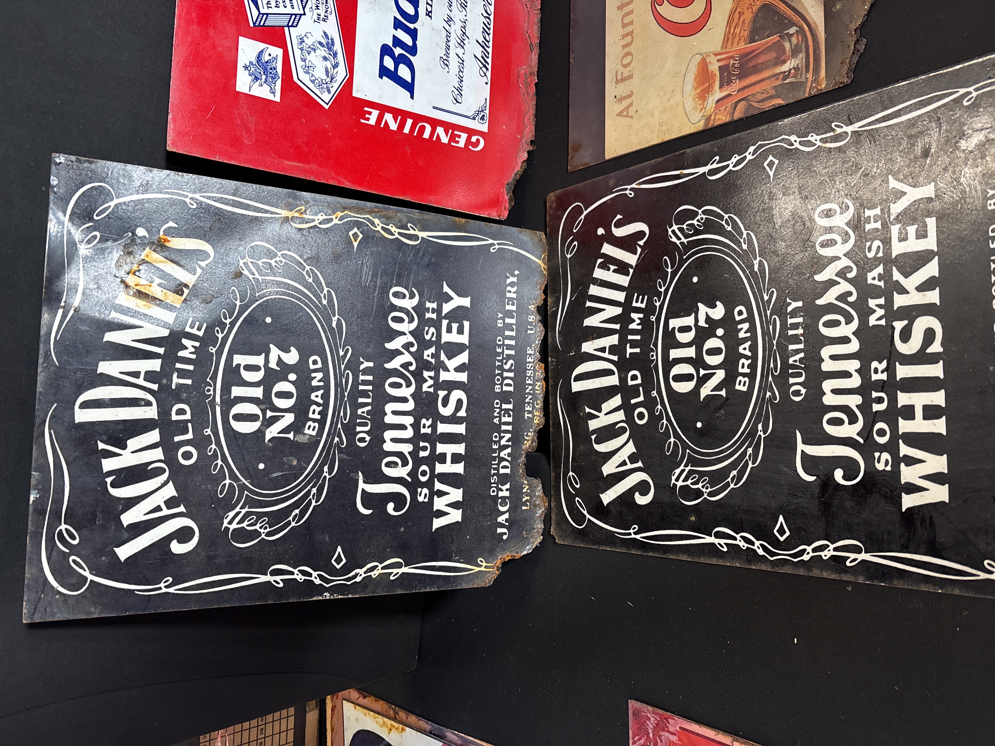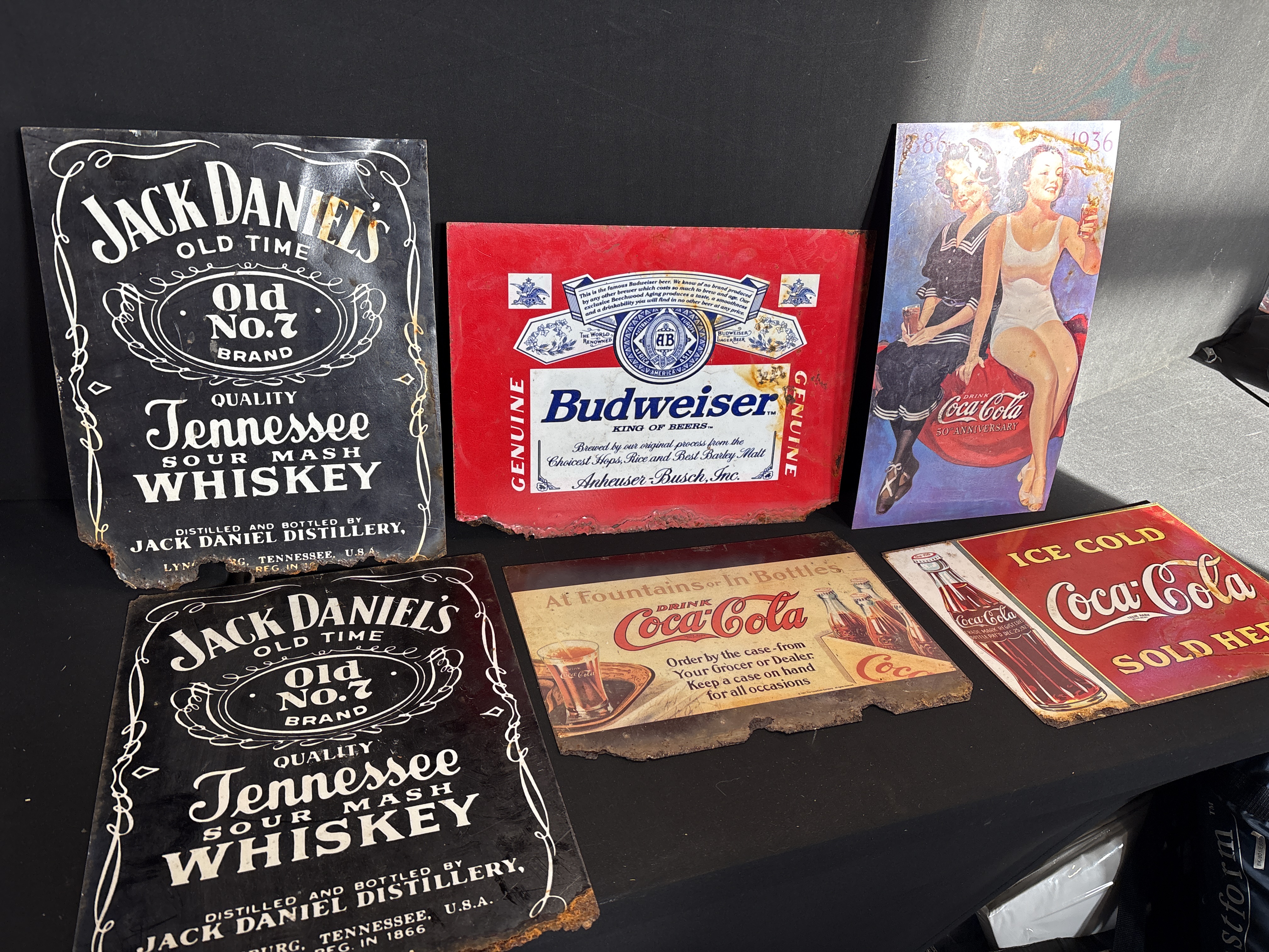 A collection of six metal advertising signs featuring American beverage branding. The lot includes two Jack Daniel’s Tennessee Whiskey signs with black grounds and white lettering; one Budweiser sign featuring the brand’s label and eagle crest; and three Coca-Cola signs. The Coca-Cola signs consist of a vertical 50th Anniversary design (1886-1936) depicting two women in period swimwear and sailor-style dress, a horizontal sign titled At Fountains or In Bottles, and a red Ice Cold sign featuring a bottle with a 1923 patent date. Each sign is manufactured from printed metal and features irregular, jagged edges designed to simulate age.
