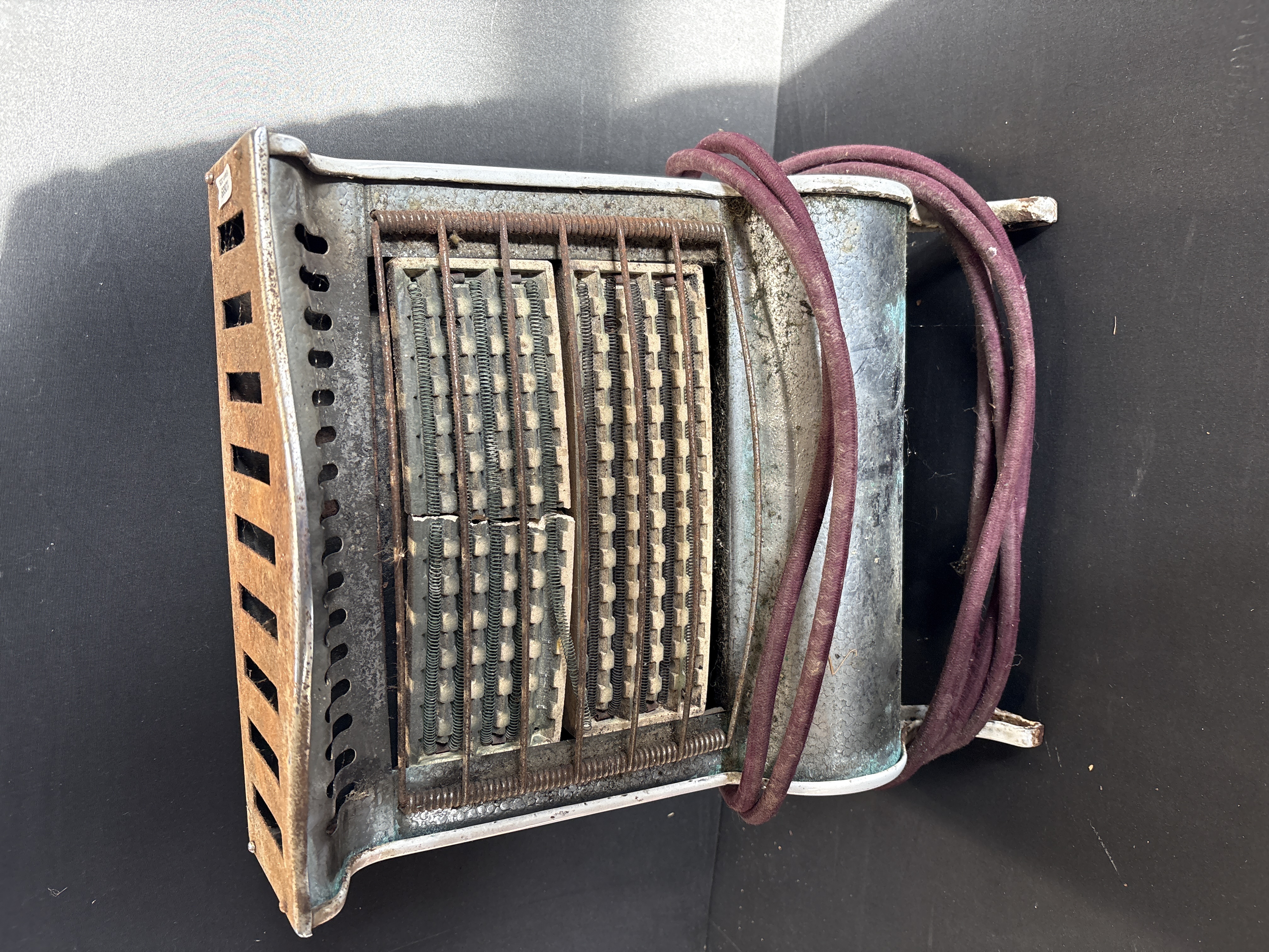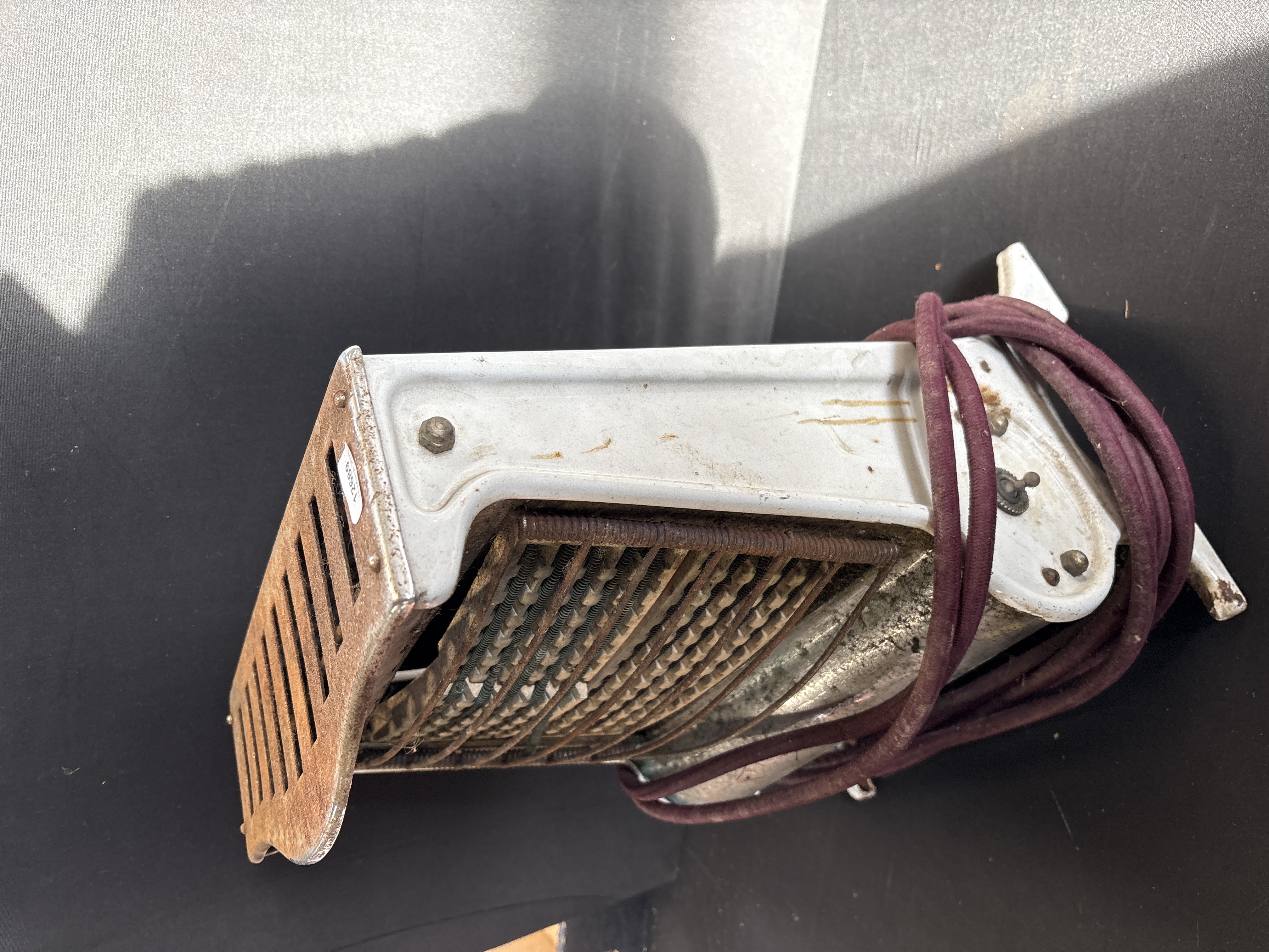 A vintage electric fire, attributed to Belling and likely the Bungalow model, dating from the mid-20th century. The heater is constructed with a metal body featuring white enamelled side sections and a curved reflector with a silver-toned hammer-effect finish. The unit contains twin ceramic heating bars with exposed wire coils, protected by a horizontal metal wire grille. The side of the casing features a series of ventilation slats. It is fitted with a maroon fabric-covered power cord.