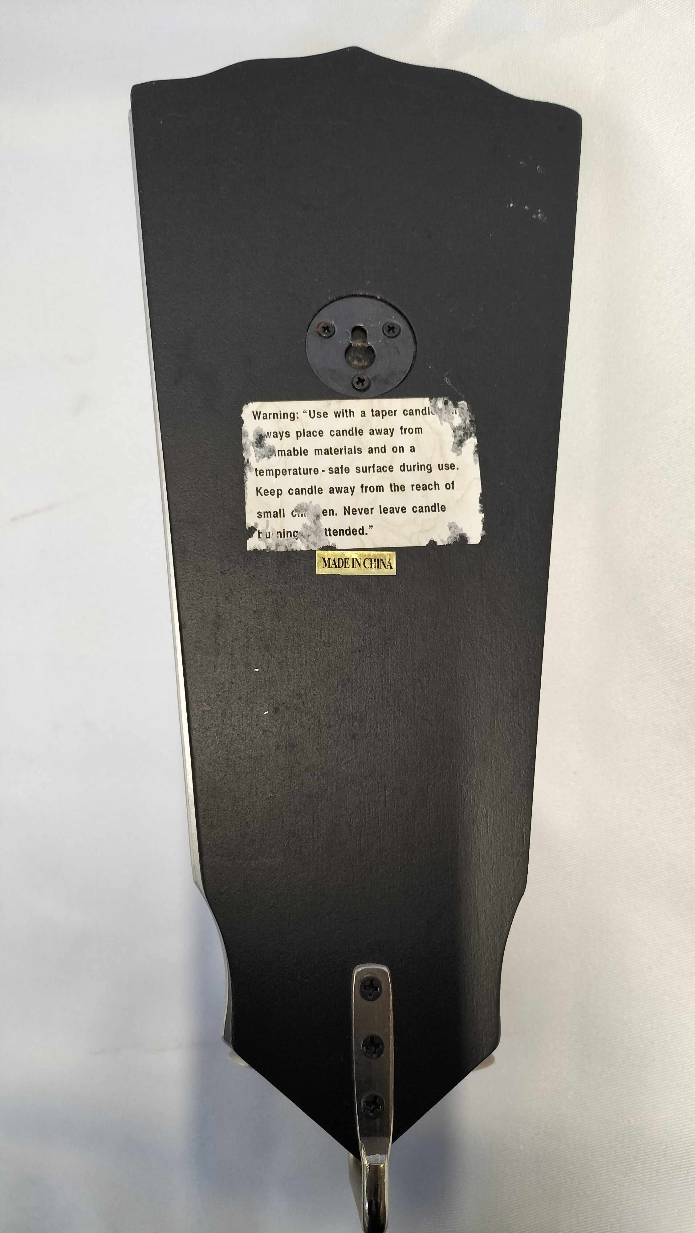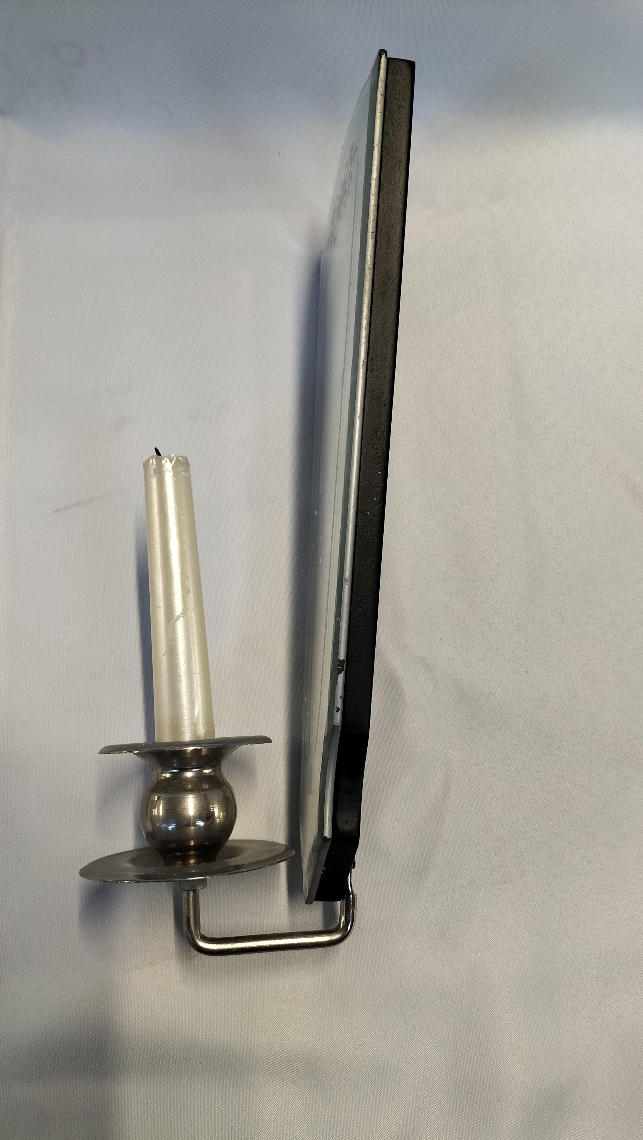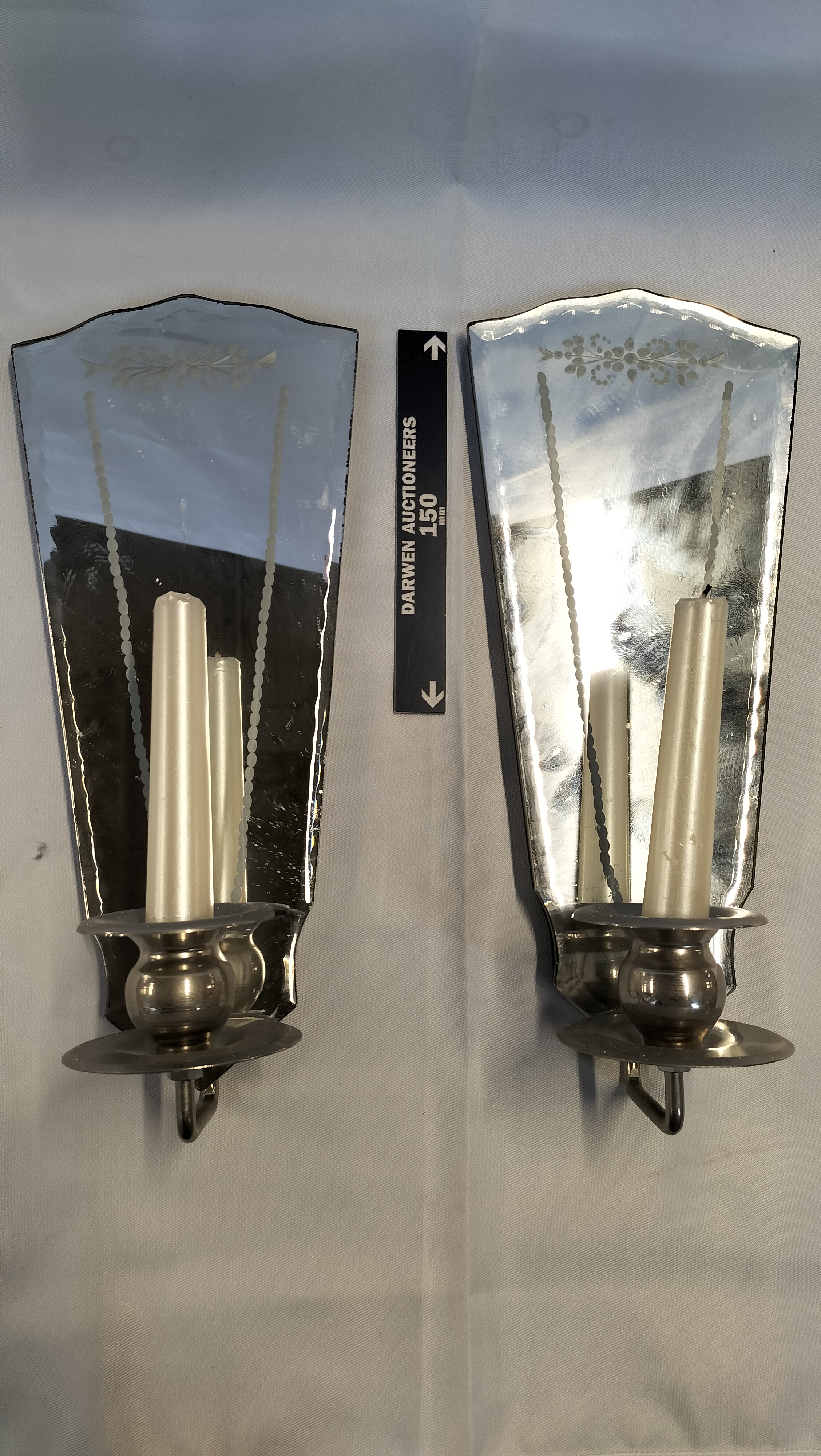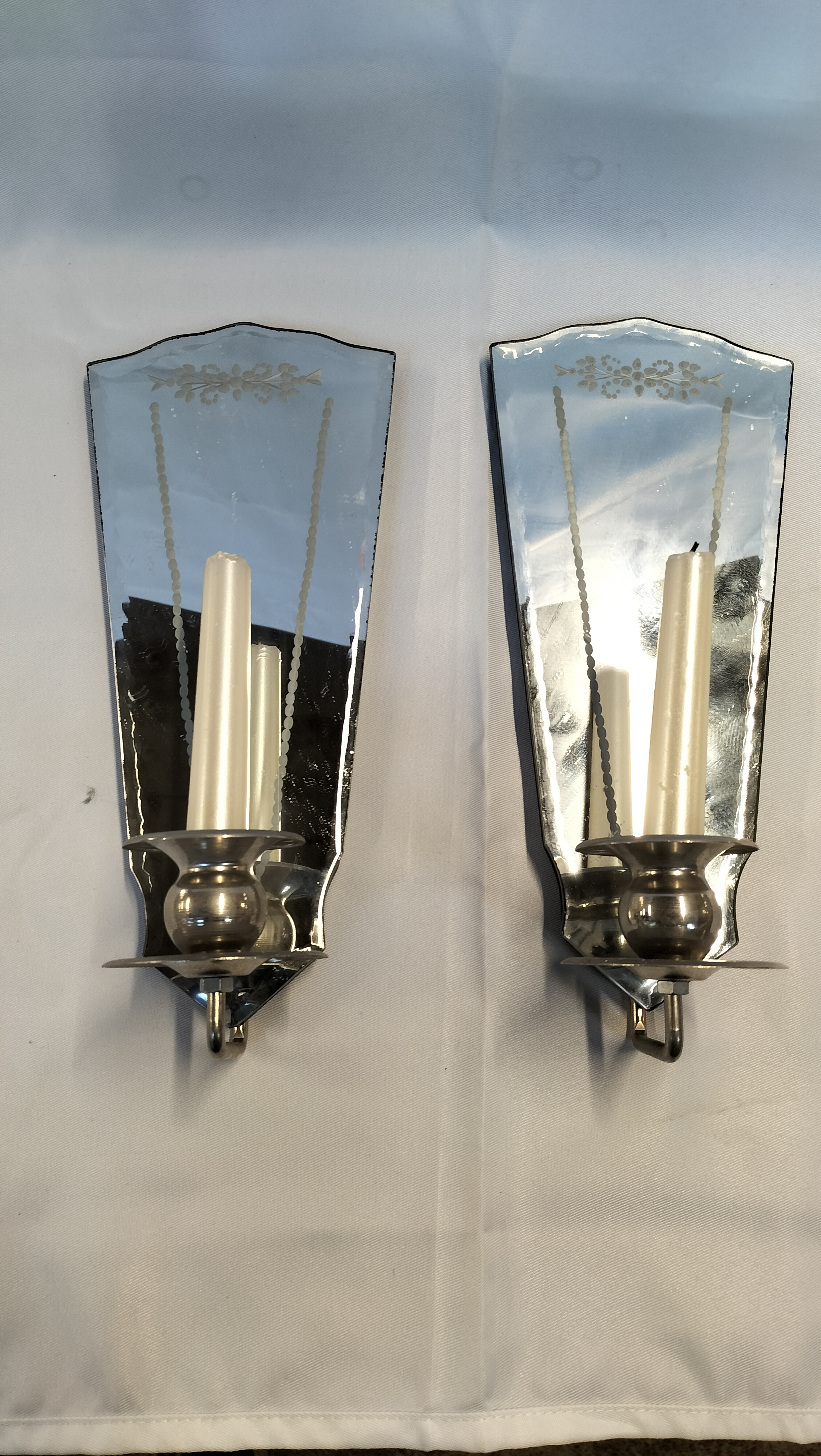 A pair of mirrored wall sconces of tapering fan-shaped form. Each mirror features etched floral and geometric borders at the top. The mirrors are mounted on black-painted composite backboards with attached brushed-metal arms and candle nozzles. Each sconce is currently holding a white taper candle. The reverse of one sconce bears a small gold foil label with the printed text MADE IN CHINA. A partially damaged white warning label is also present on the backboard.
