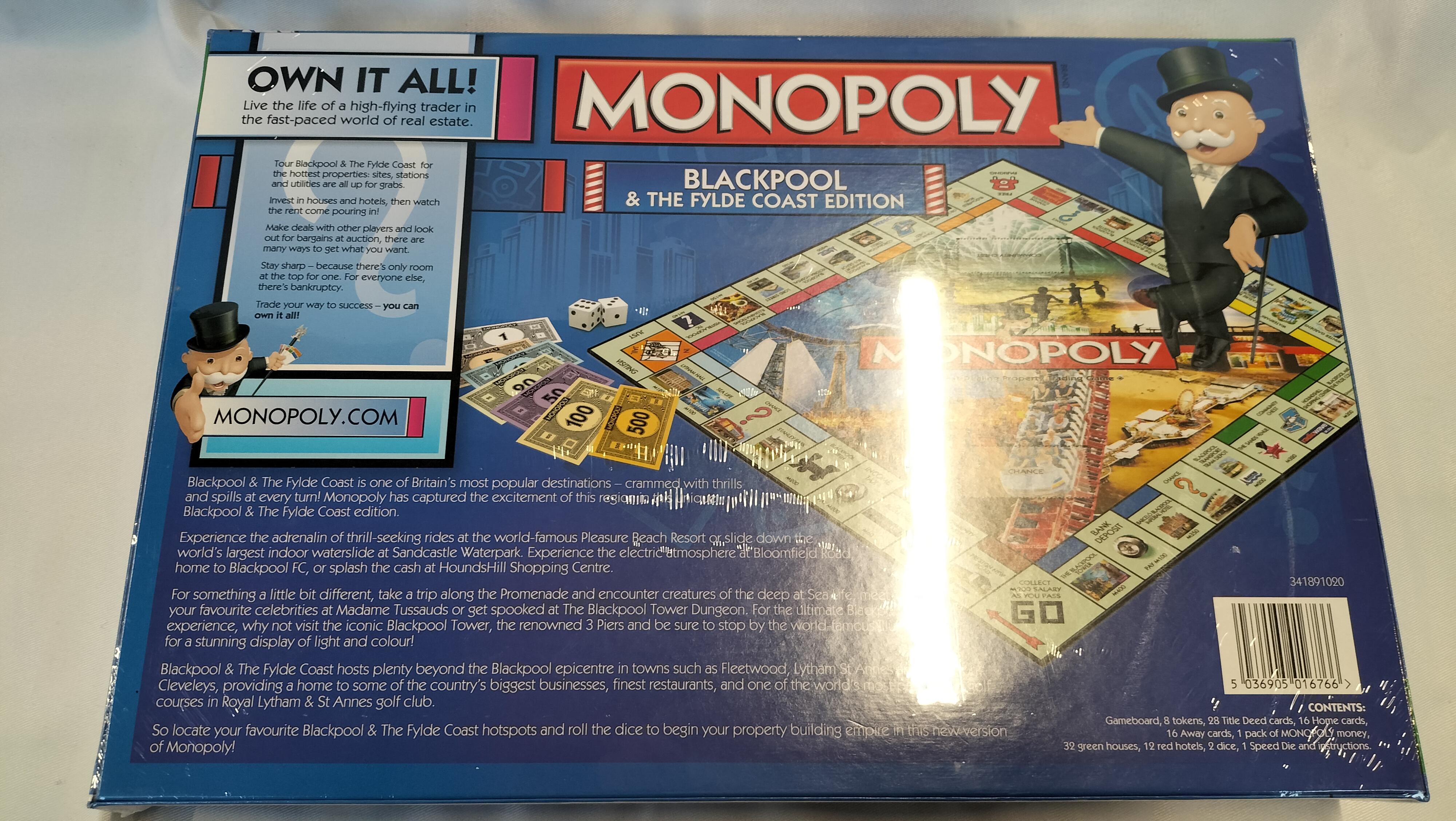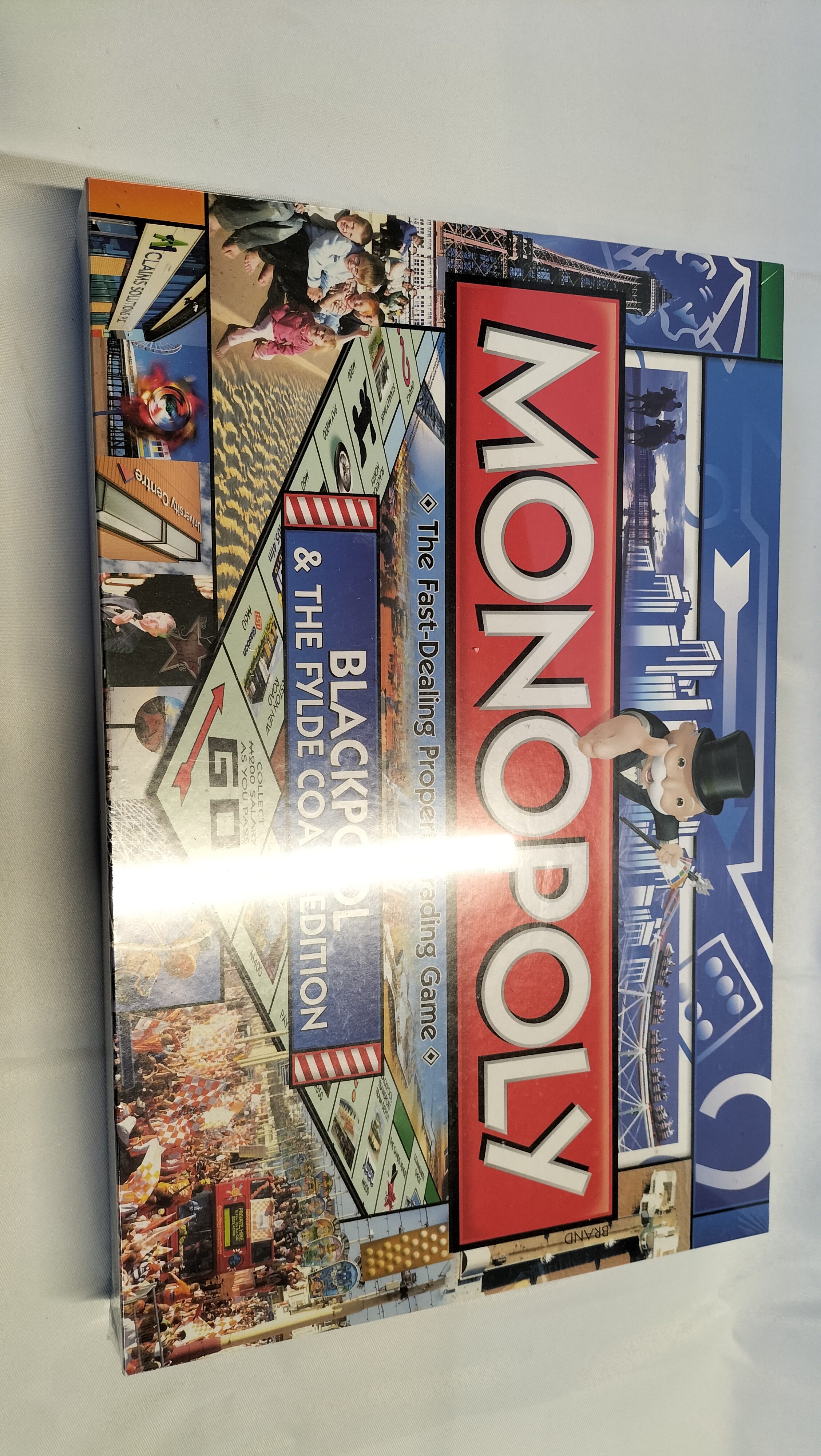 A regional UK edition of the Monopoly property trading board game, specifically themed around Blackpool and the Fylde Coast. This edition was produced by Winning Moves under licence from Hasbro. The box lid features a collage of photographic vignettes depicting local landmarks such as the Blackpool Tower, the Pleasure Beach Resort, and the Promenade. The reverse of the packaging provides a detailed list of featured locations including Sandcastle Waterpark, Bloomfield Road, Madame Tussauds, and the towns of Fleetwood and Lytham St Annes. According to the box, the contents include a gameboard, eight tokens, 28 Title Deed cards, 16 Home cards, 16 Away cards, a pack of Monopoly money, 32 green houses, 12 red hotels, two dice, one Speed Die, and instructions. The item is constructed from printed cardboard with paper and plastic components.