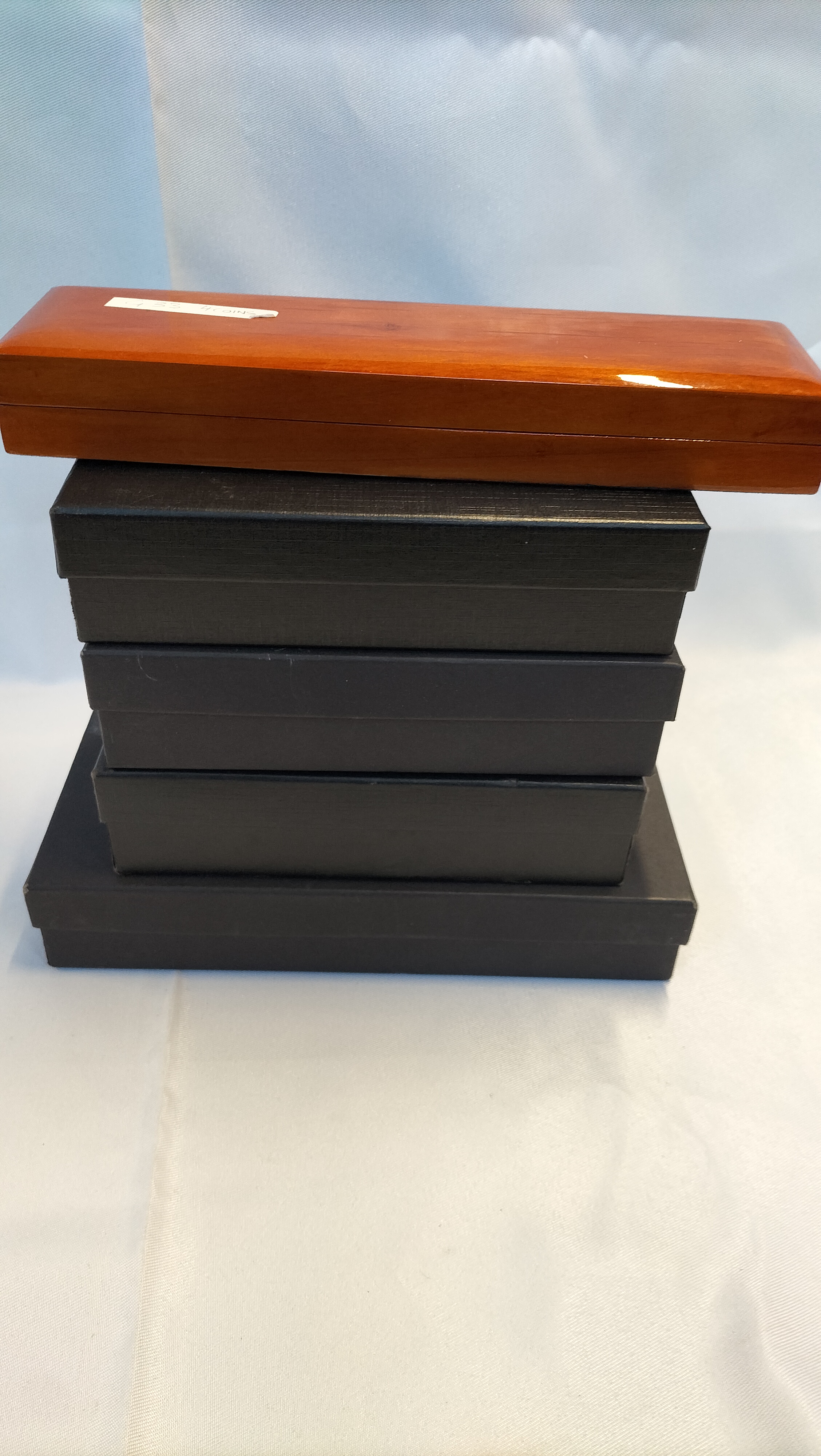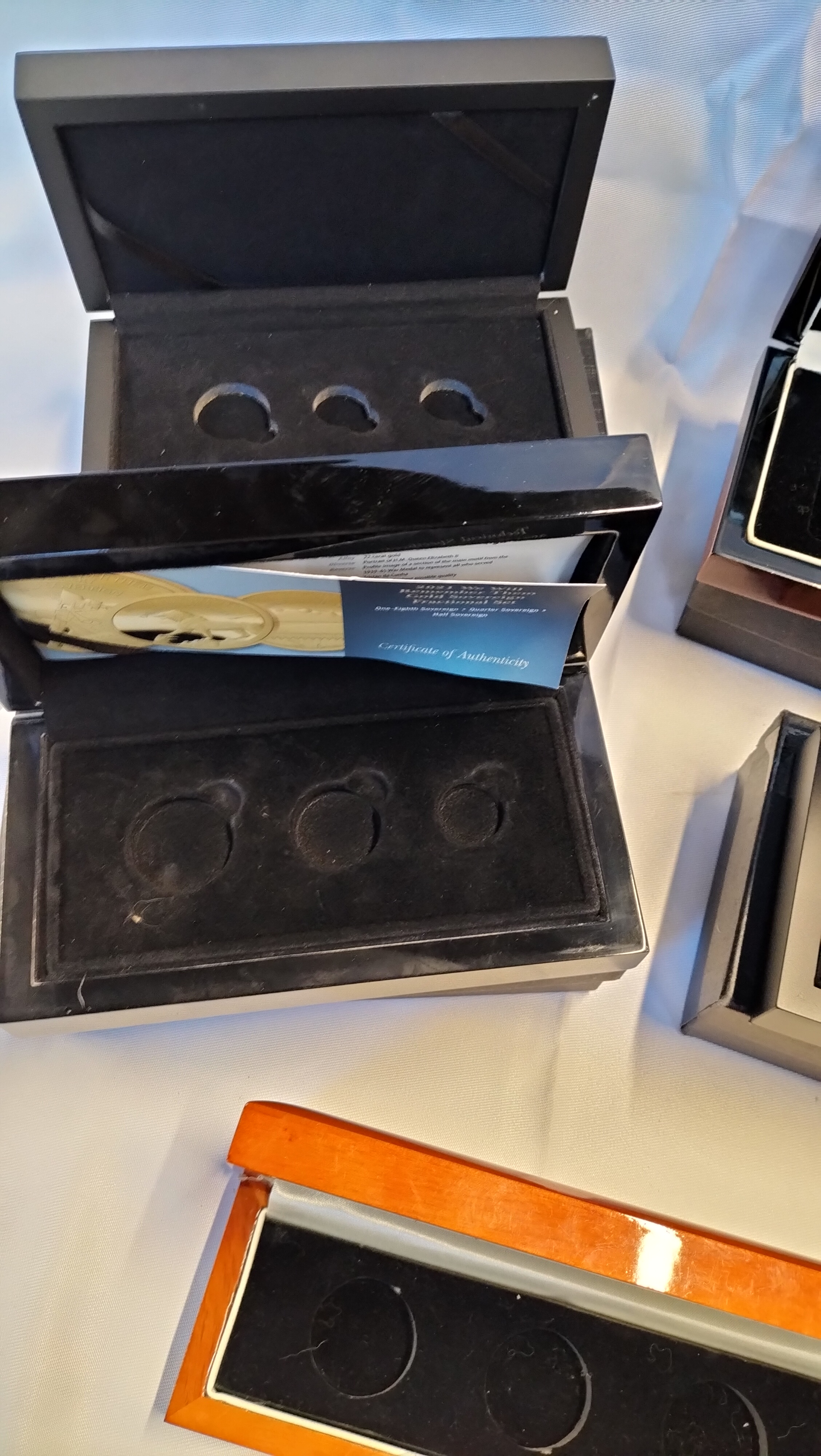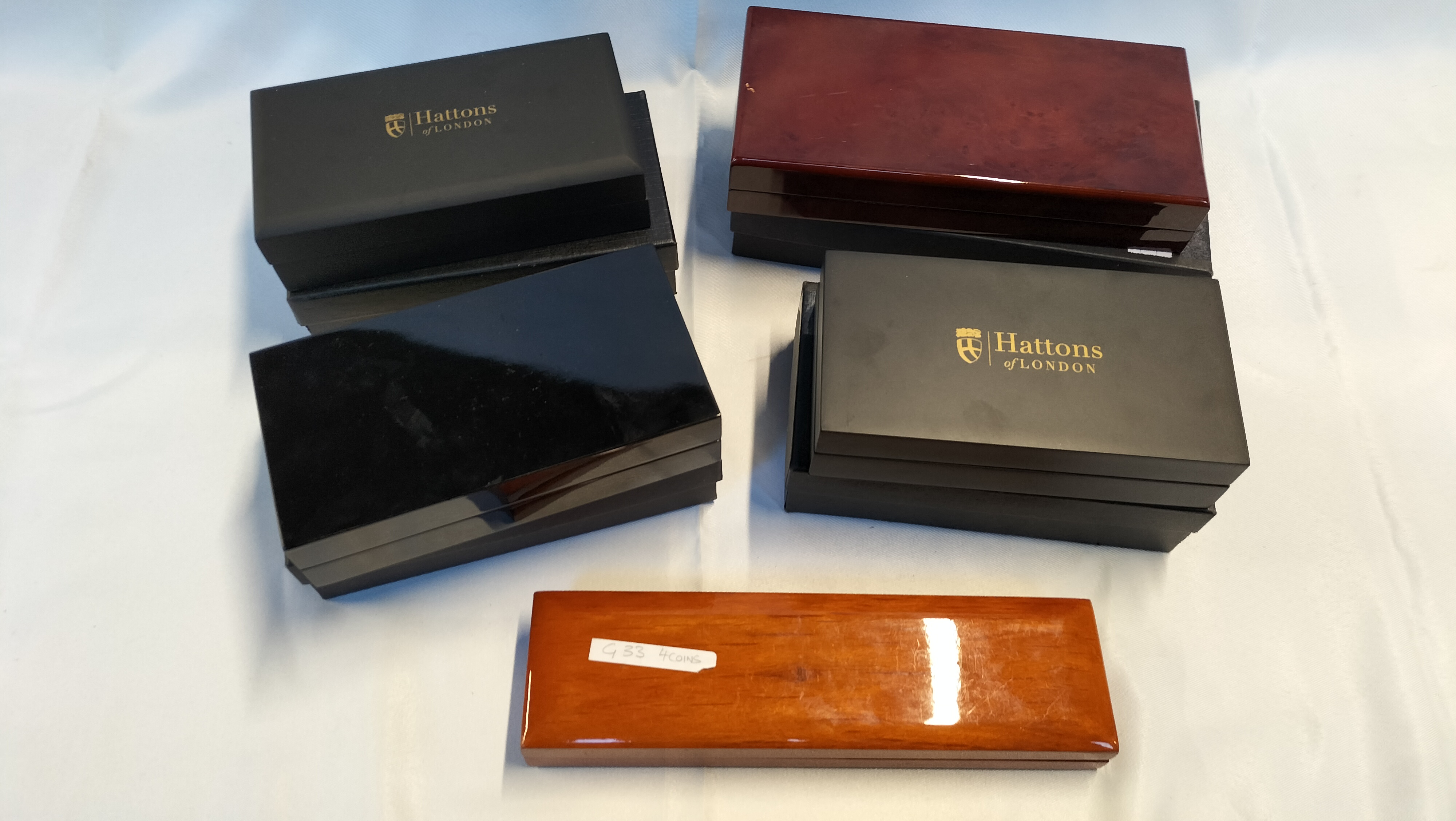 A collection of numismatic presentation cases and associated certificates of authenticity issued by Hattons of London. The group includes multiple matte black cases, glossy black wooden boxes, and polished wood-finished cases. The interiors are recessed and lined with black velvet, designed to house specific gold sovereign sets. Included certificates identify the 2021 We Will Remember Them Gold Sovereign Fractional Set, intended for one-eighth, quarter, and half sovereign denominations, and the 2019 Britannia Four-Sided Gold Sovereign Prestige Set, intended for quarter, half, and full sovereign denominations. Several boxes feature the Hattons of London crest and name printed in gold-tone lettering on the lids. One polished wood box bears a white adhesive label marked G33 4COINS. Please note that no coins are included in this lot.