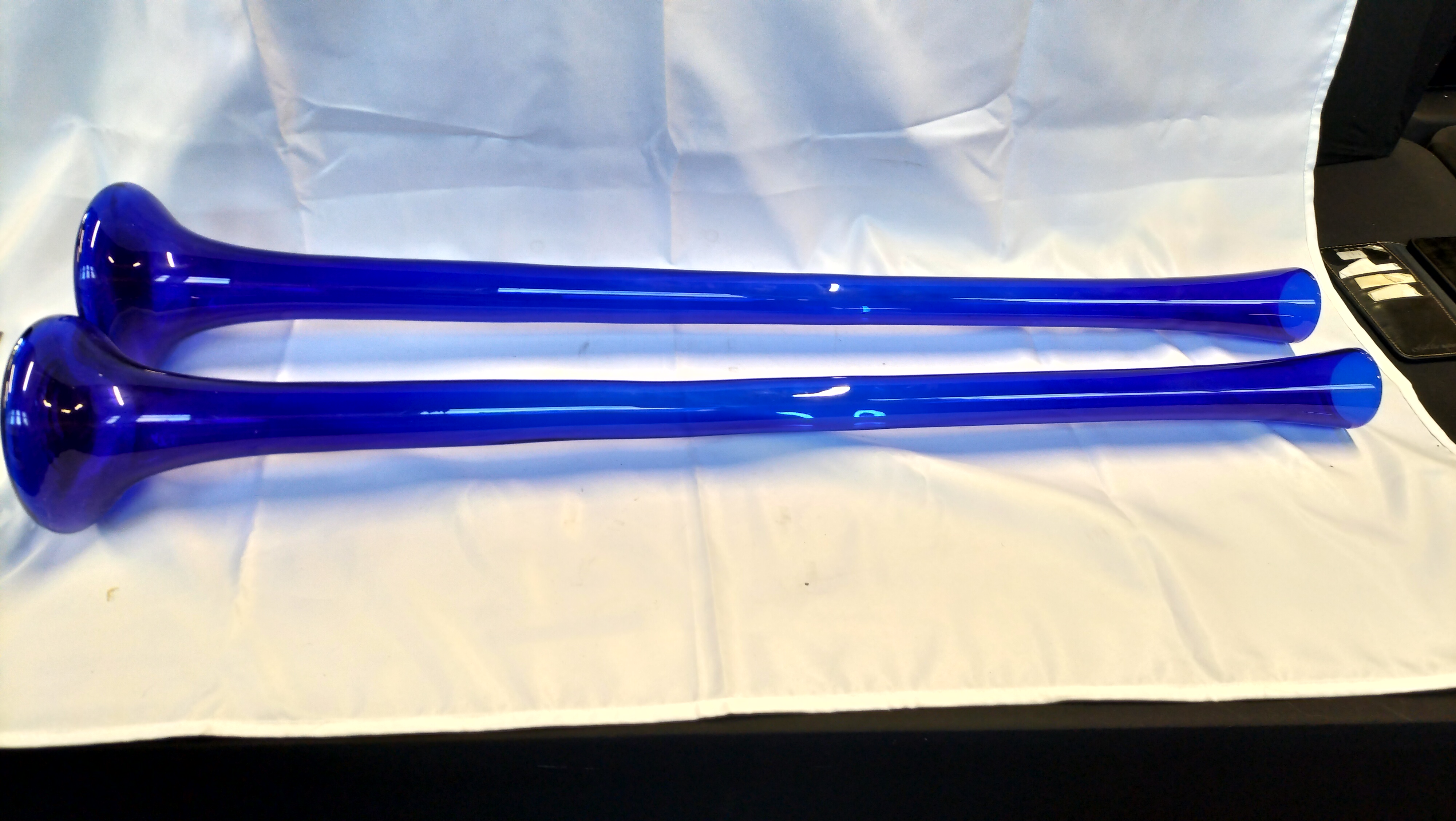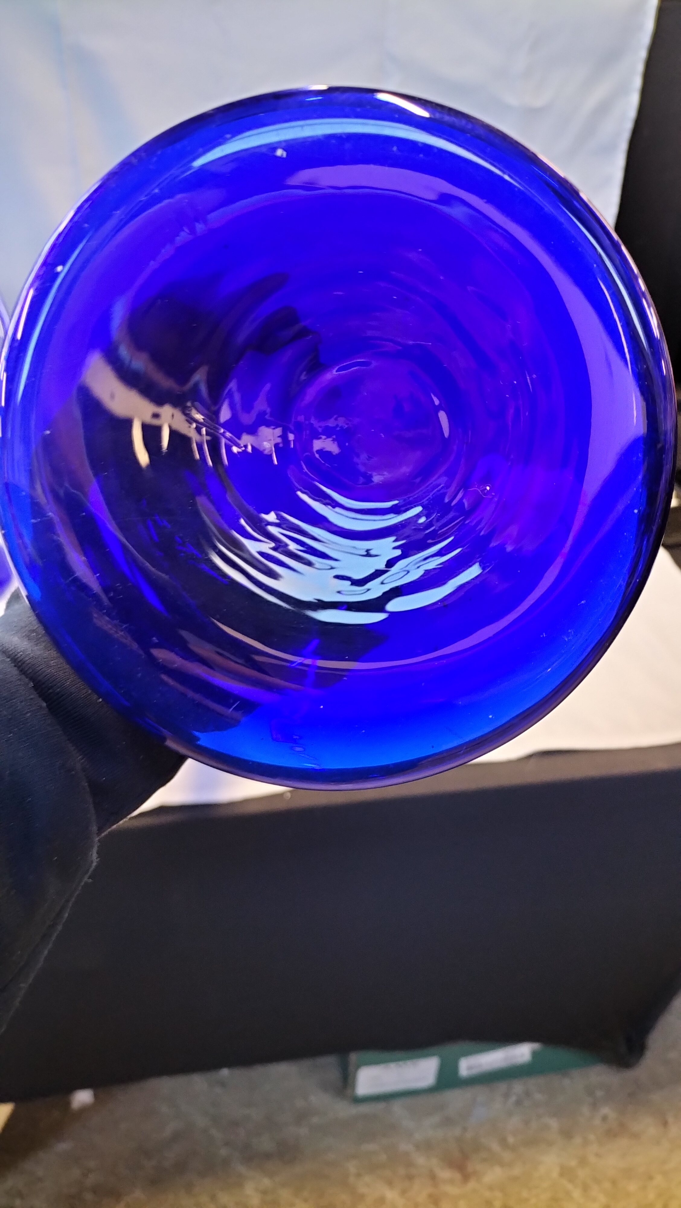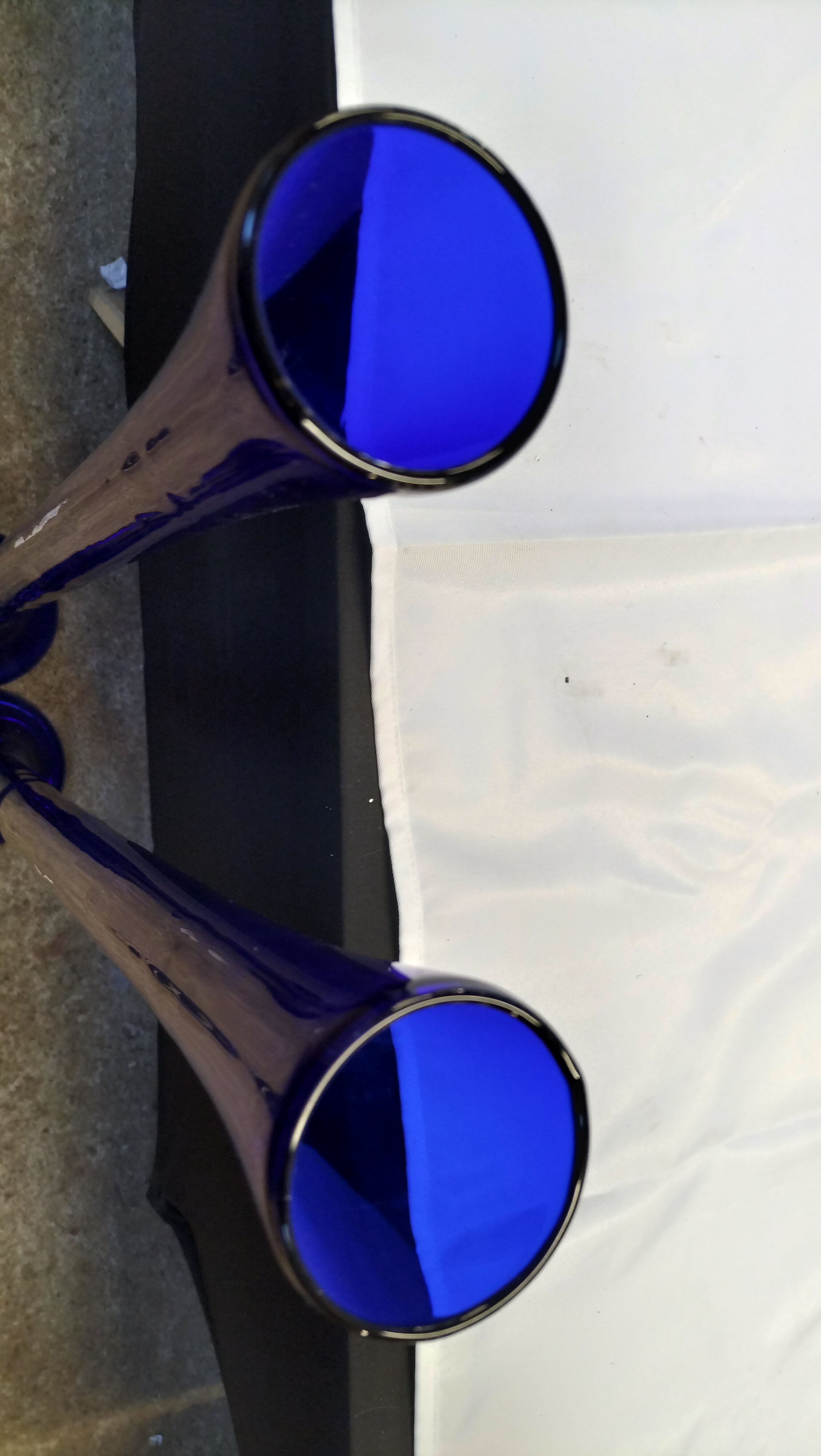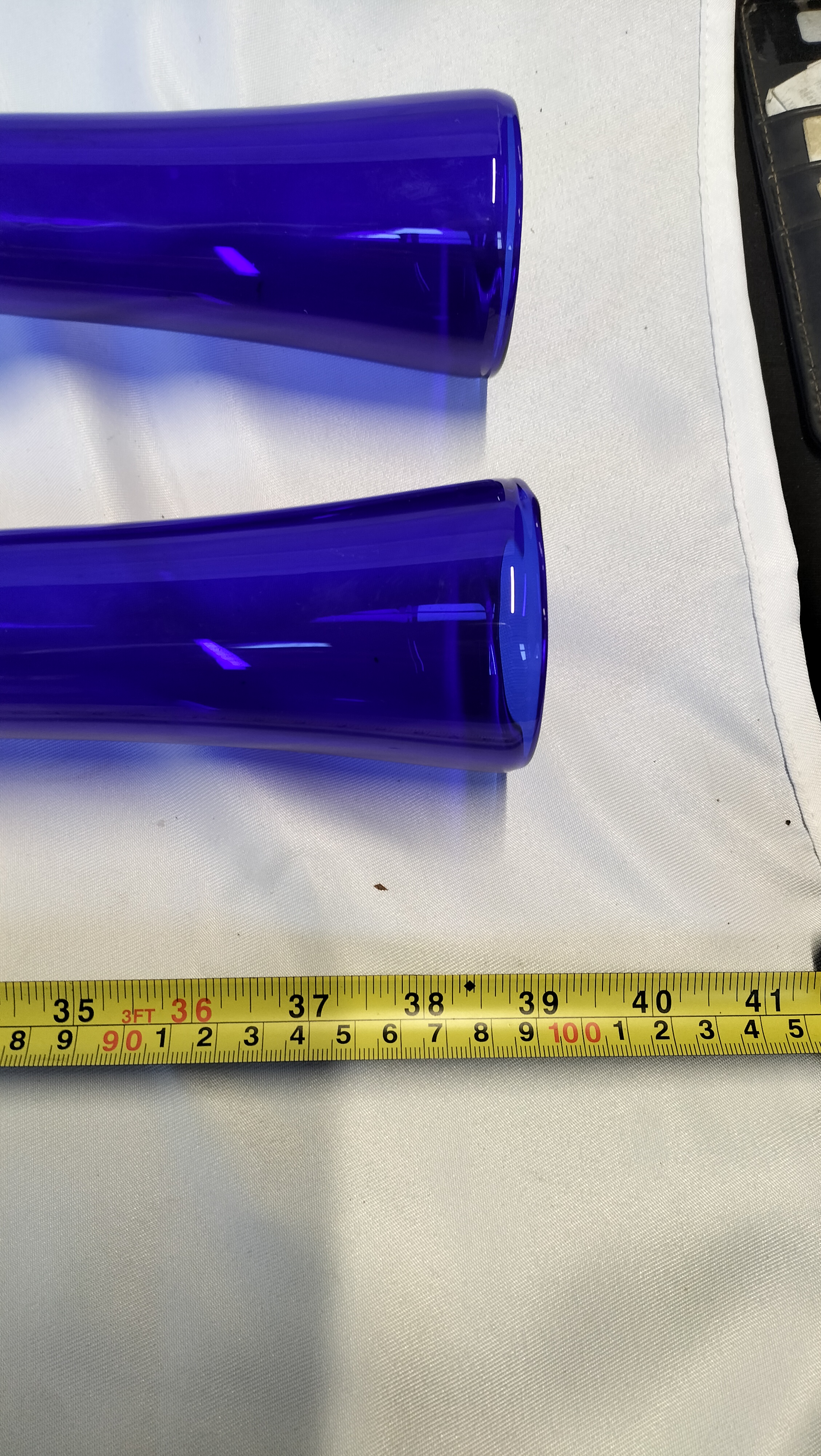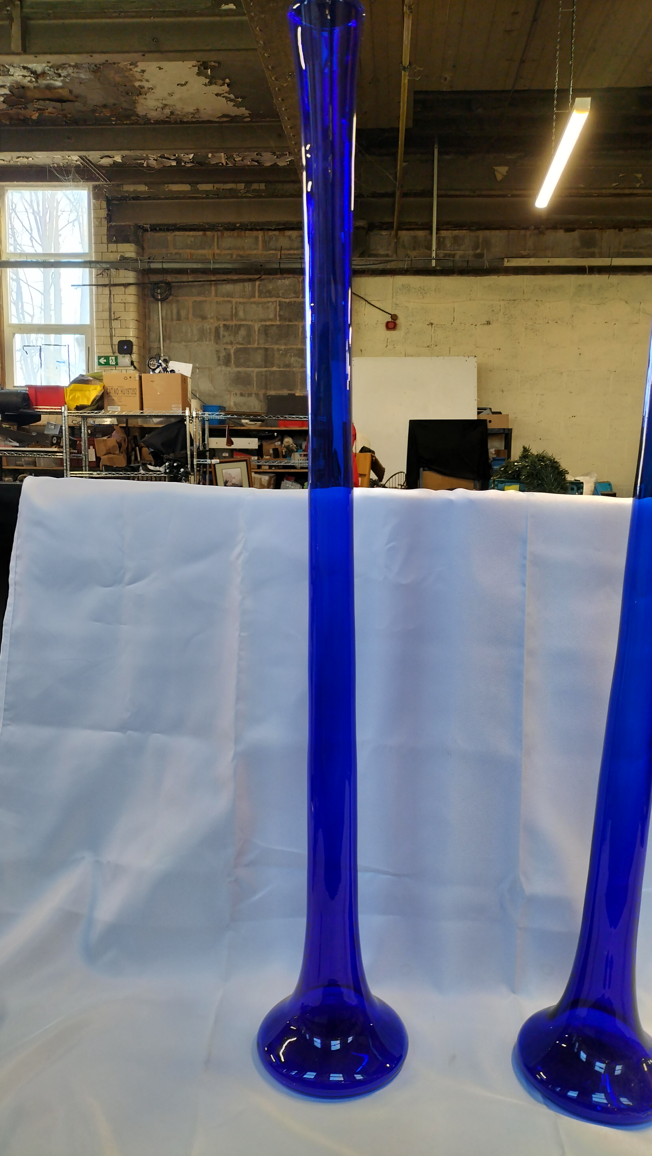A pair of mid-century style floor vases of elongated, slender swung form. Each vase is crafted from deep cobalt blue glass, tapering from a simple circular rim down to a wide, flared base. The circular bases are polished and do not bear any maker’s marks, characters, or symbols. The glass displays a uniform colour and is characterised by manufacturing ripples inherent to the production process.