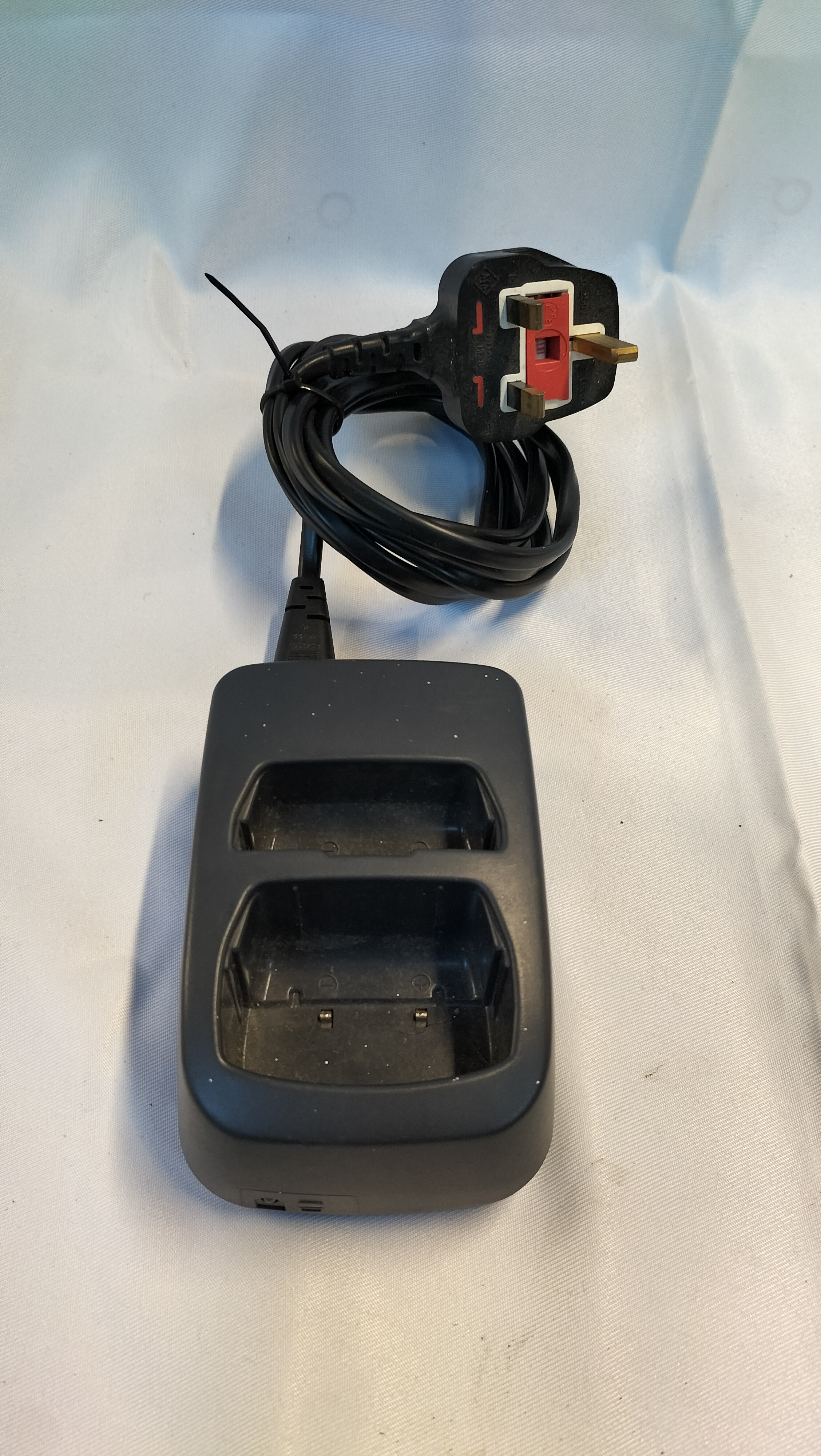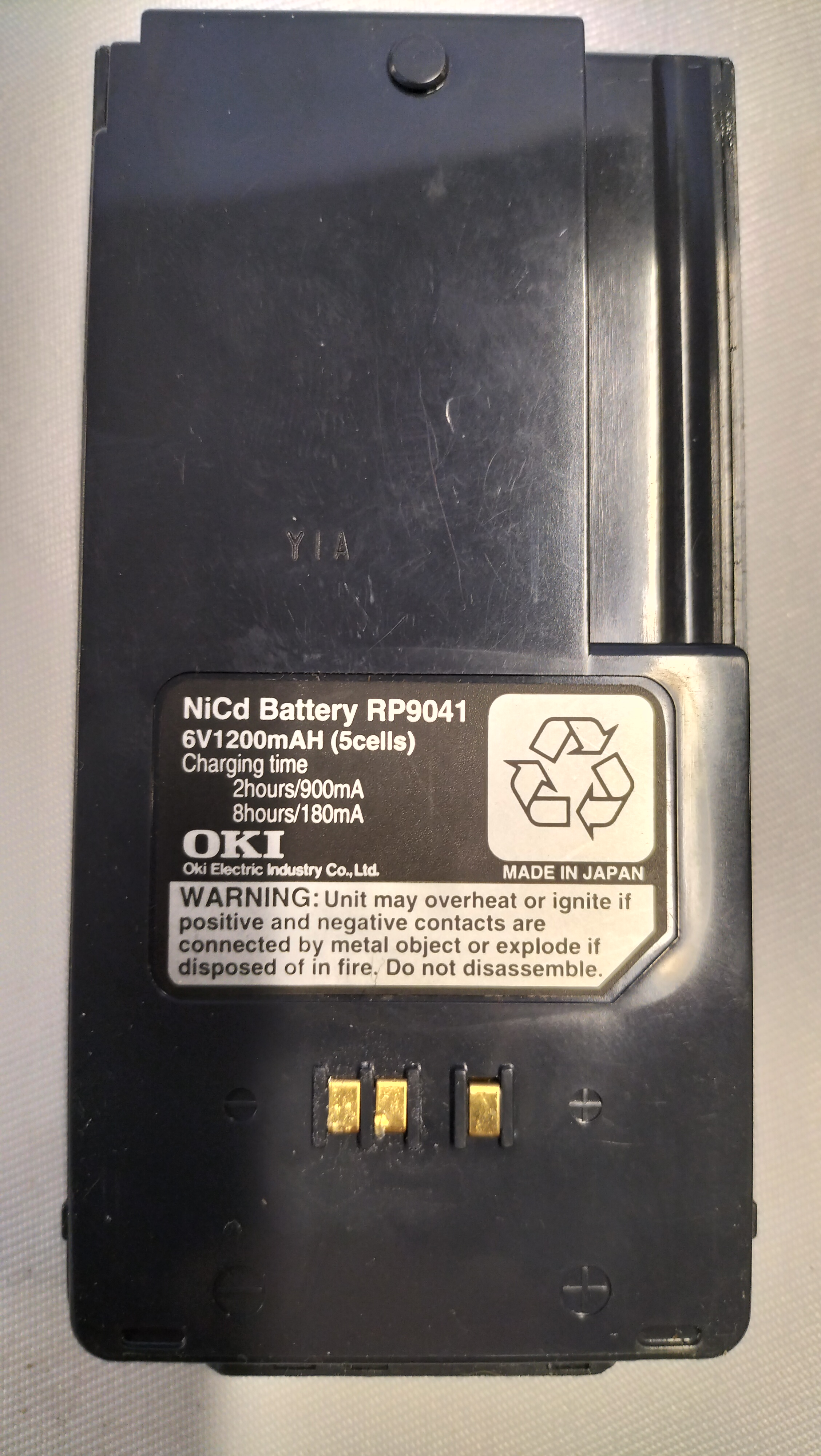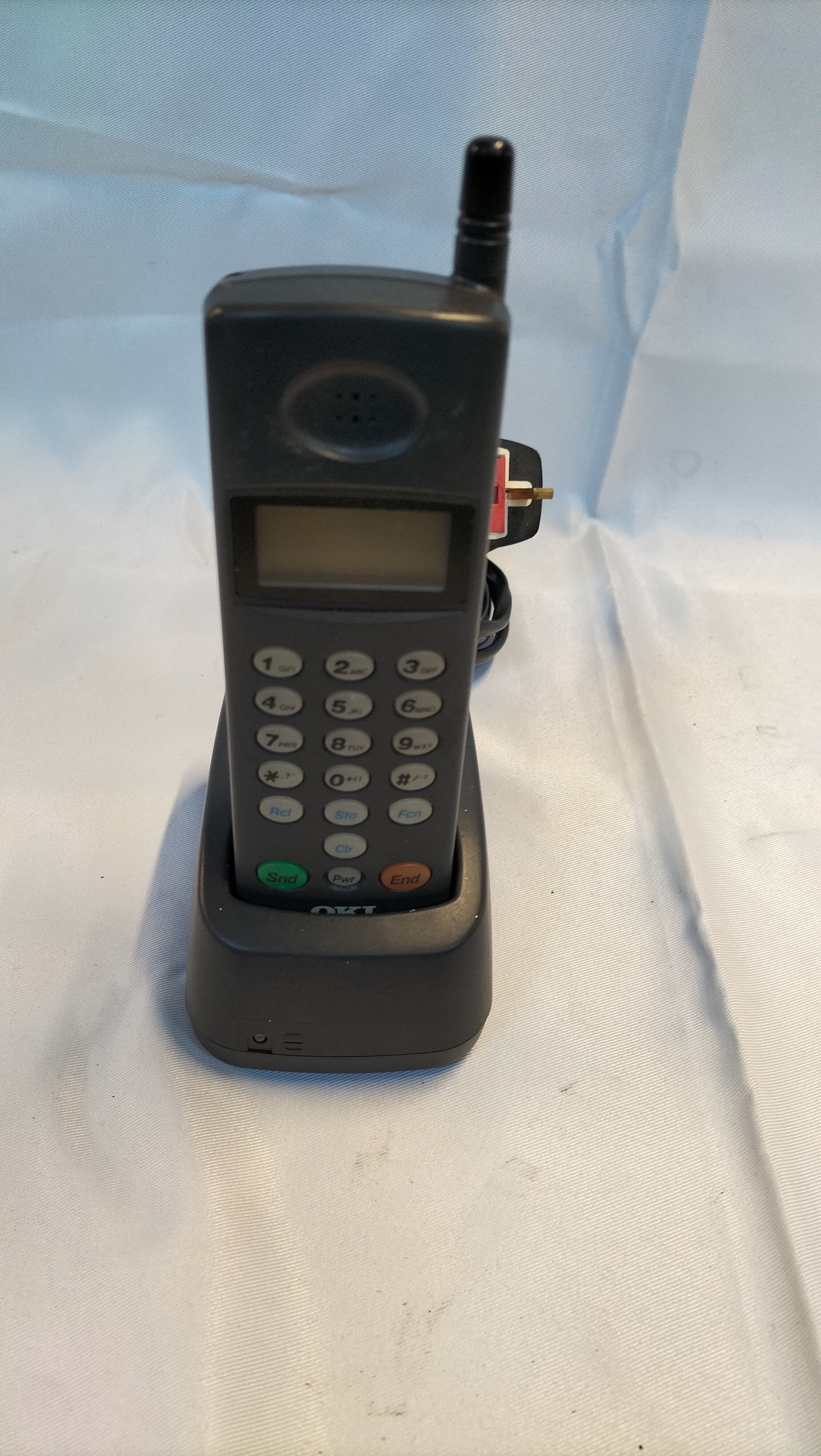An OKI 1130E UM9042A cellular mobile telephone manufactured by Oki Electric Industry Co., Ltd. The handset is constructed from dark grey plastic and features an integrated fixed aerial, a monochrome LCD screen, and a push-button keypad. The keypad includes standard numerical keys alongside functional buttons labelled Snd, Pwr, End, Rcl, Sto, Fcn, and Clr. The reverse of the handset bears a white label printed with OKI PHONES 1130E, UM9042A Class 4, and the serial number S/3276/4/P/502879. It is marked MADE IN JAPAN. The interior compartment is marked with ESN: 18/18/00/13352. The unit is accompanied by a dual-slot desktop charging cradle marked OKI, fitted with a black power cable and a UK BS 1363 3-pin mains plug. One NiCd Battery RP9041 6V 1200mAh is included, which is also marked Oki Electric Industry Co., Ltd. and MADE IN JAPAN.