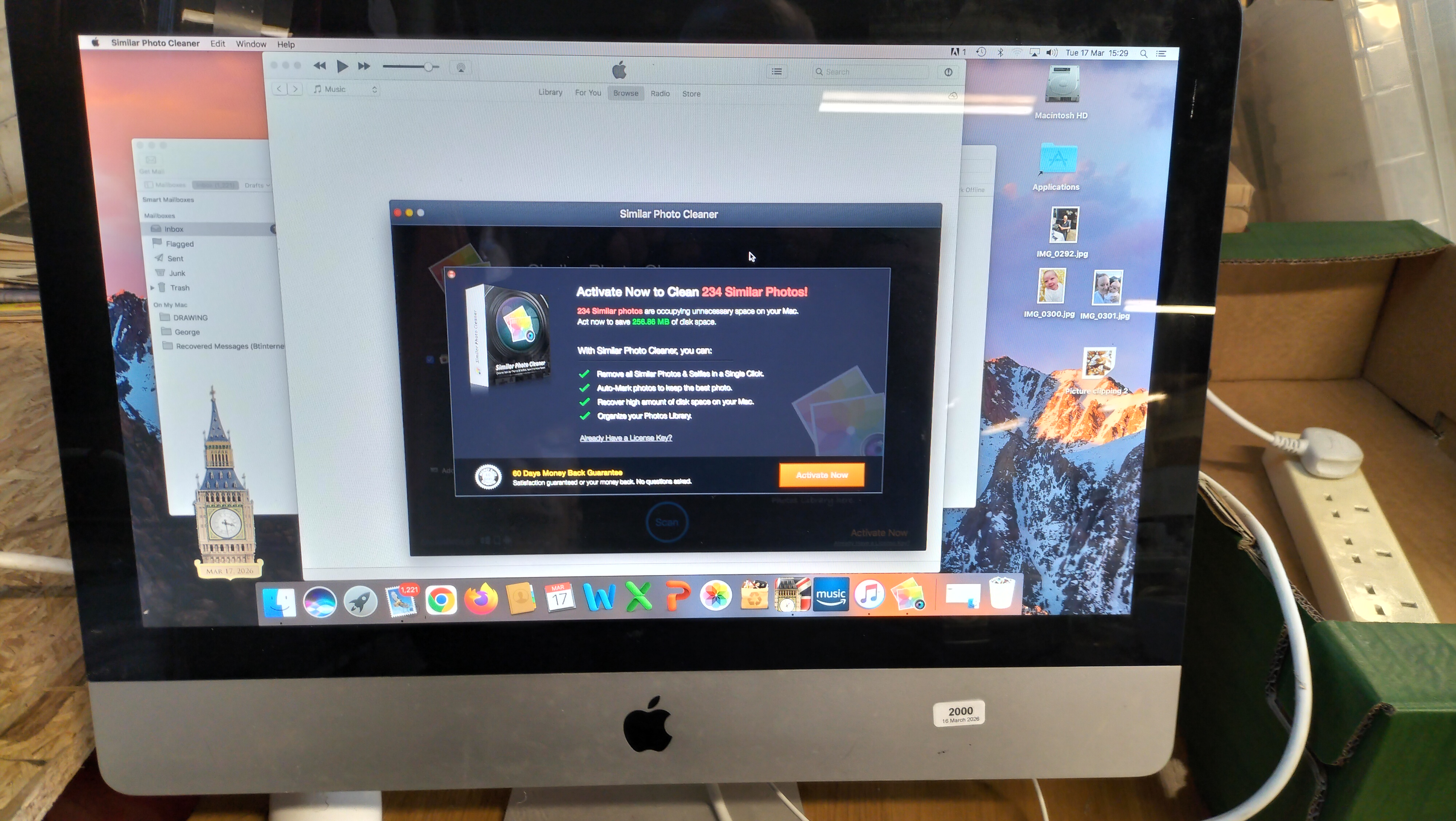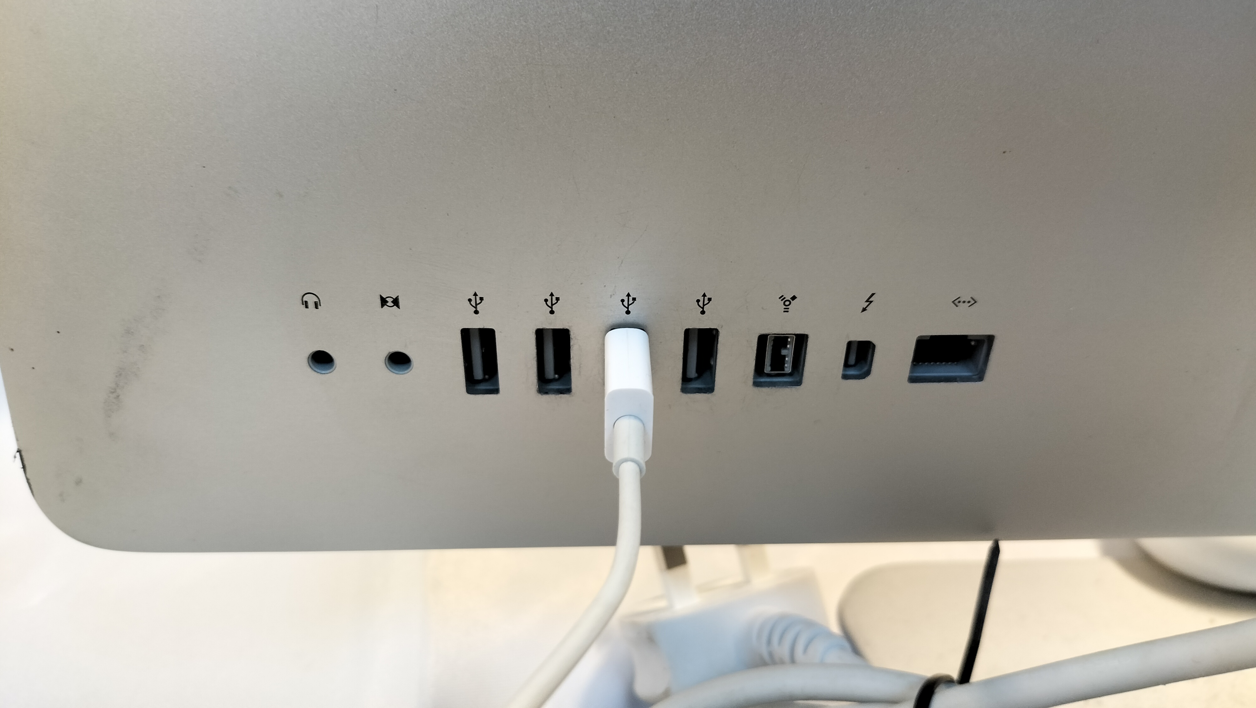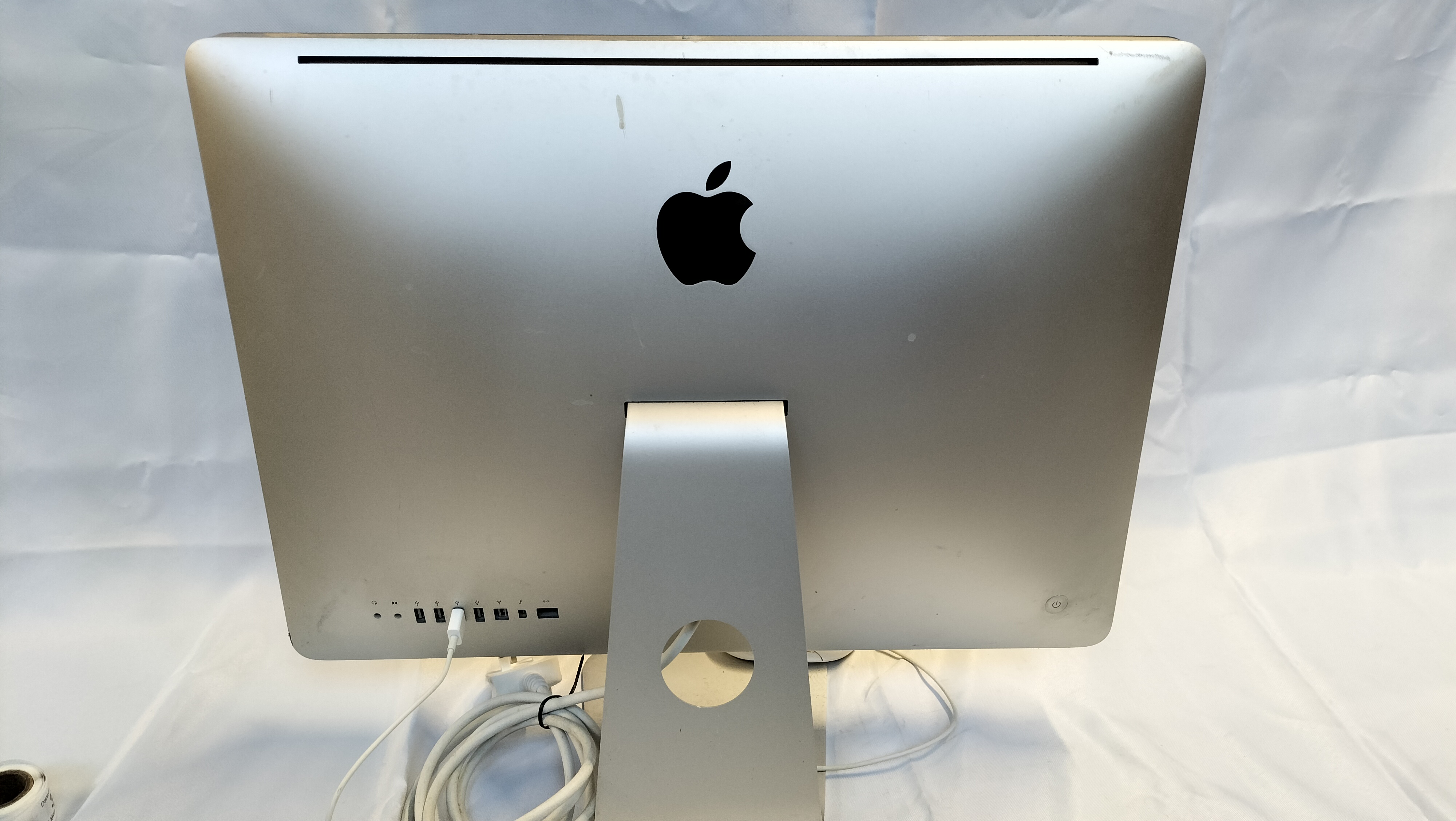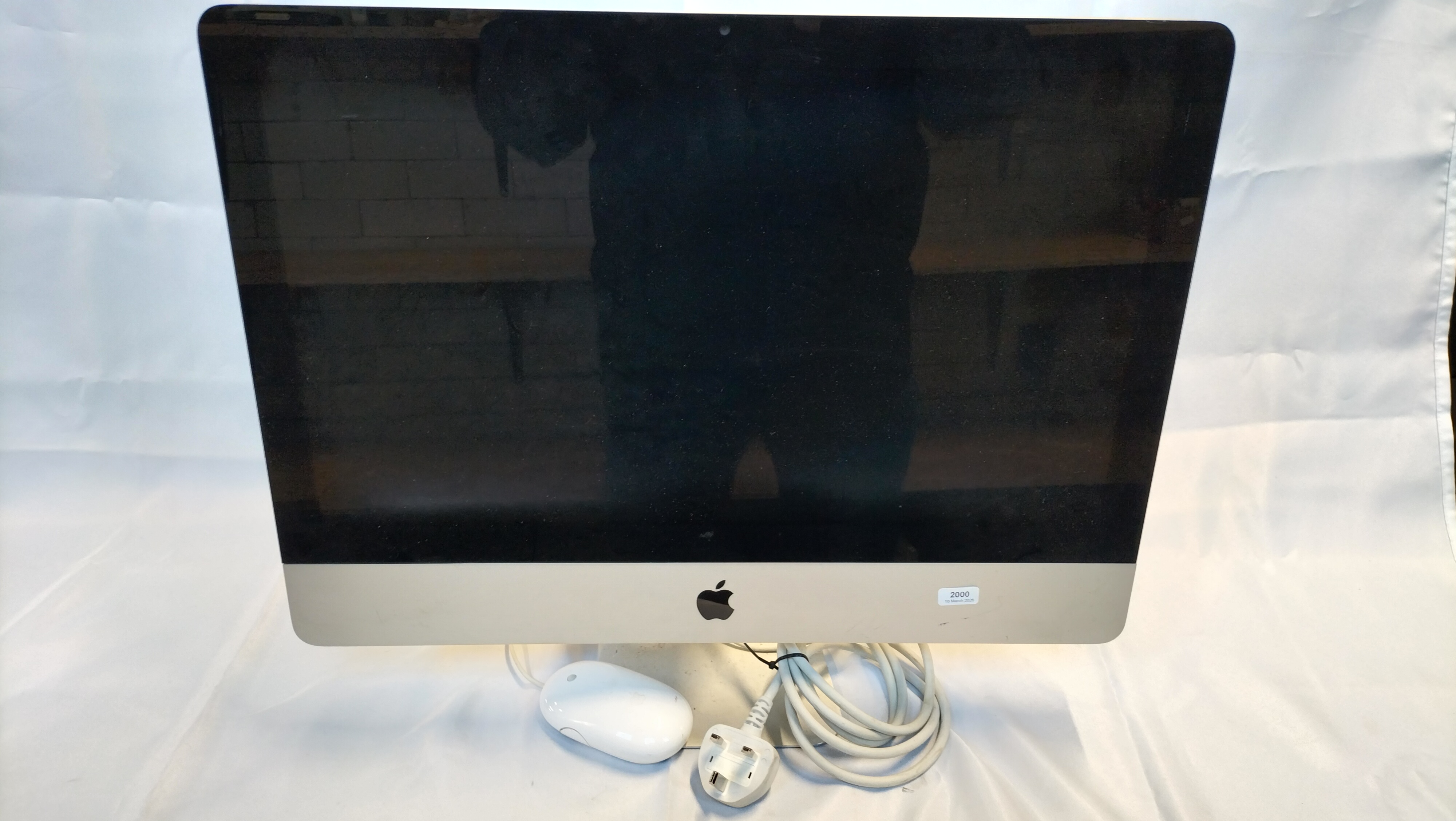 An Apple iMac all-in-one desktop computer featuring an approximately 21.5-inch display. The unit is constructed with a silver-tone aluminium casing and a glass-fronted screen. The rear connectivity panel is equipped with four USB 2.0 ports, one FireWire 800 port, one Thunderbolt port, an Ethernet port, and audio in/out jacks. The computer is shown in a powered-on state running the macOS operating system. Included with the lot is a white Apple Magic Mouse and a power cable with a UK three-pin plug. No keyboard is present.