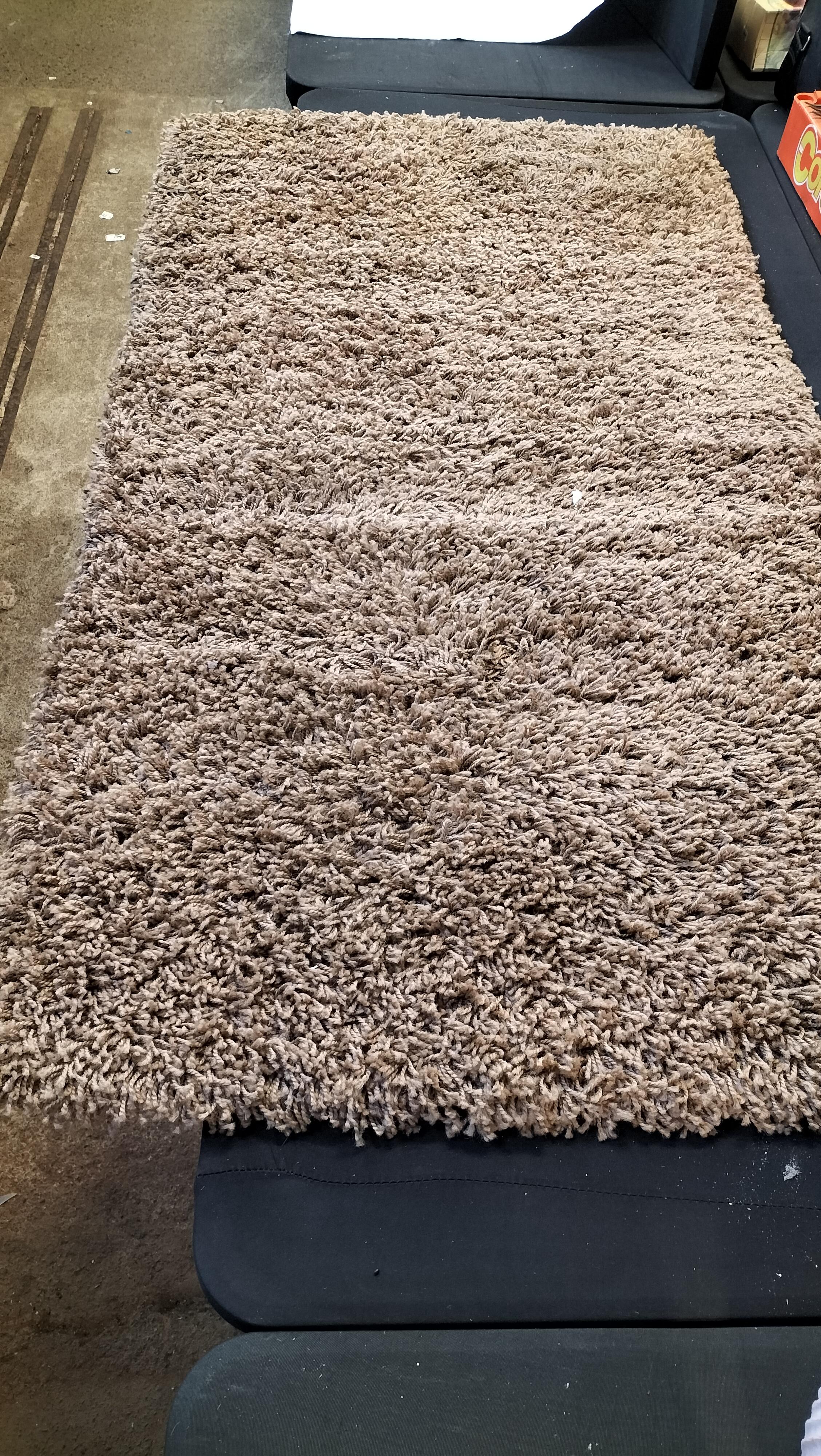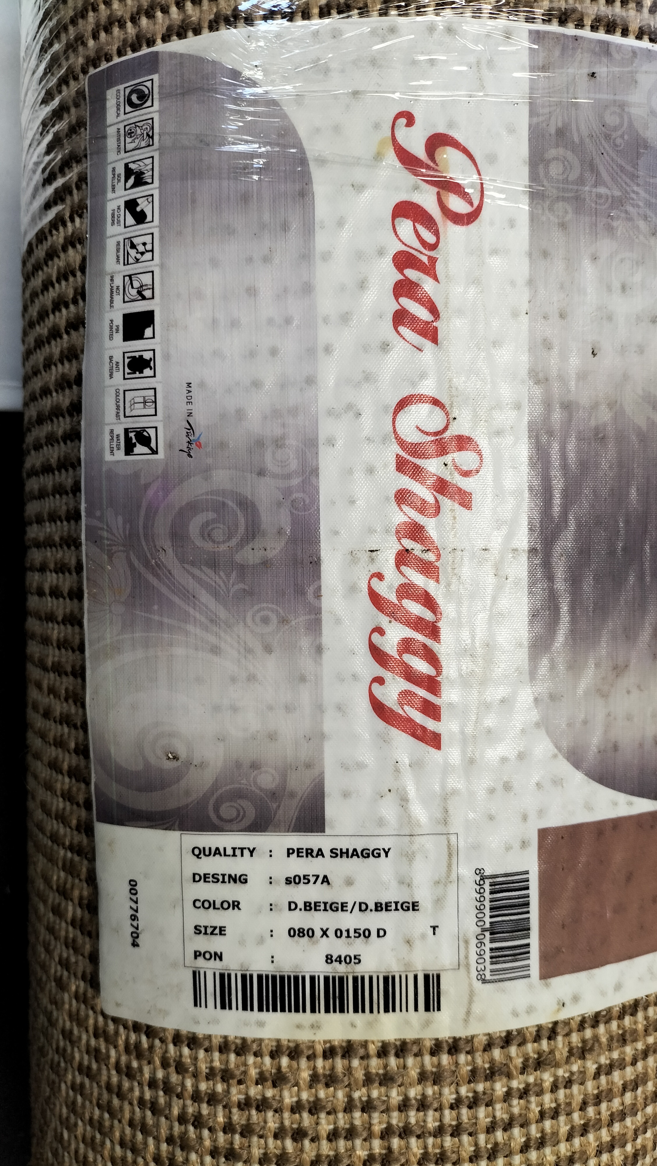 A dark beige high pile shaggy rug made in Türkiye, measuring approximately 80cm by 150cm.
