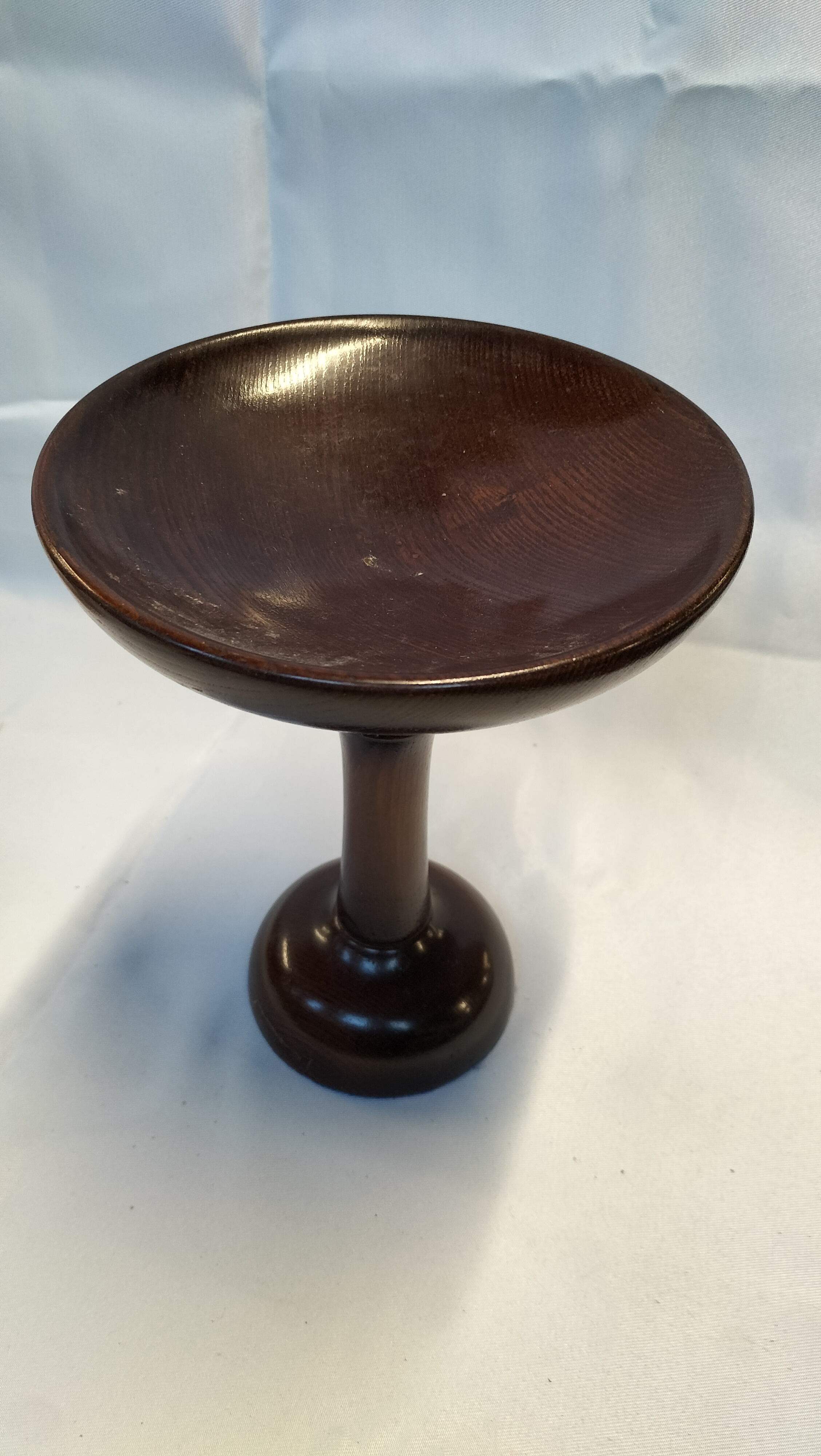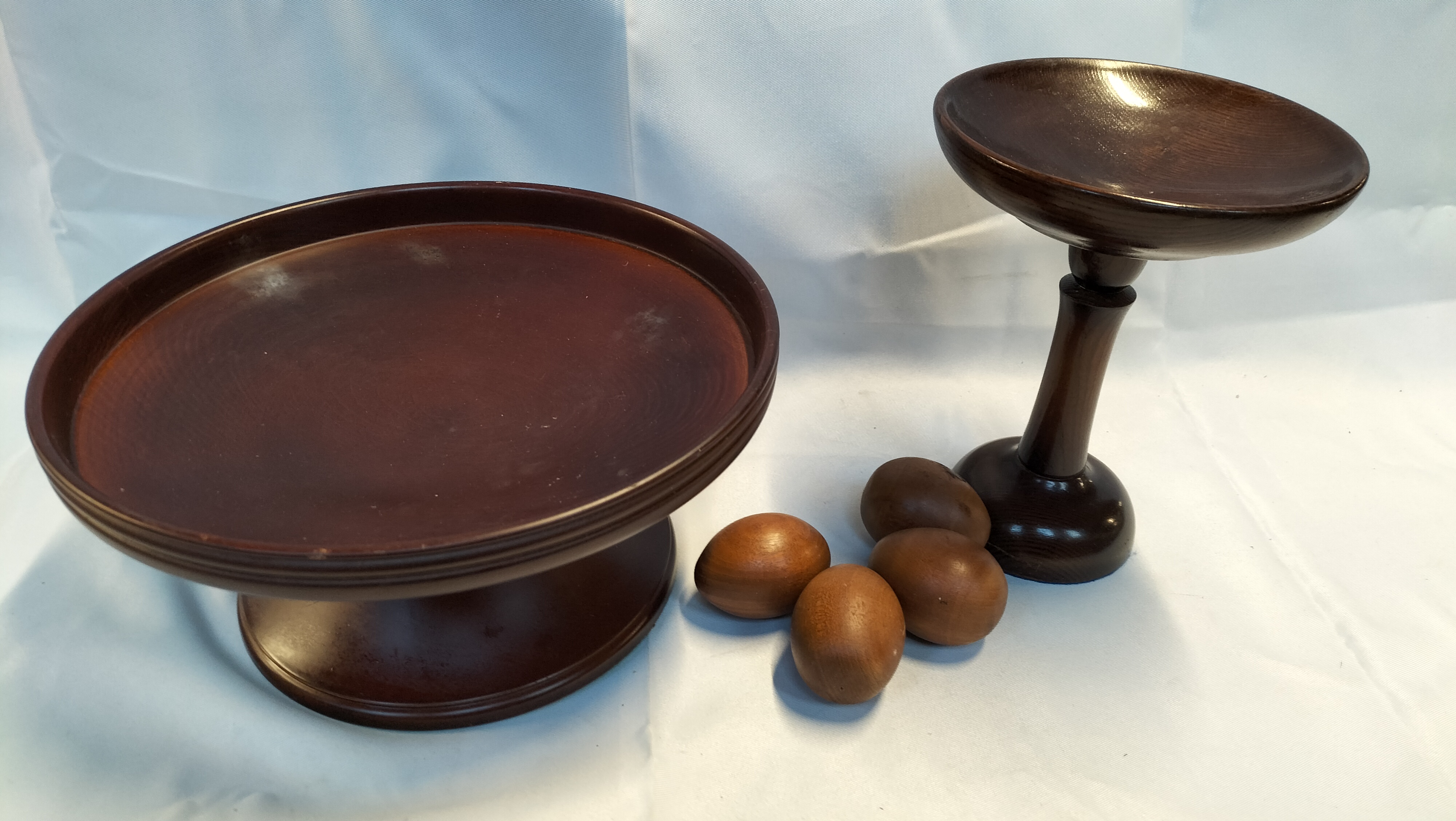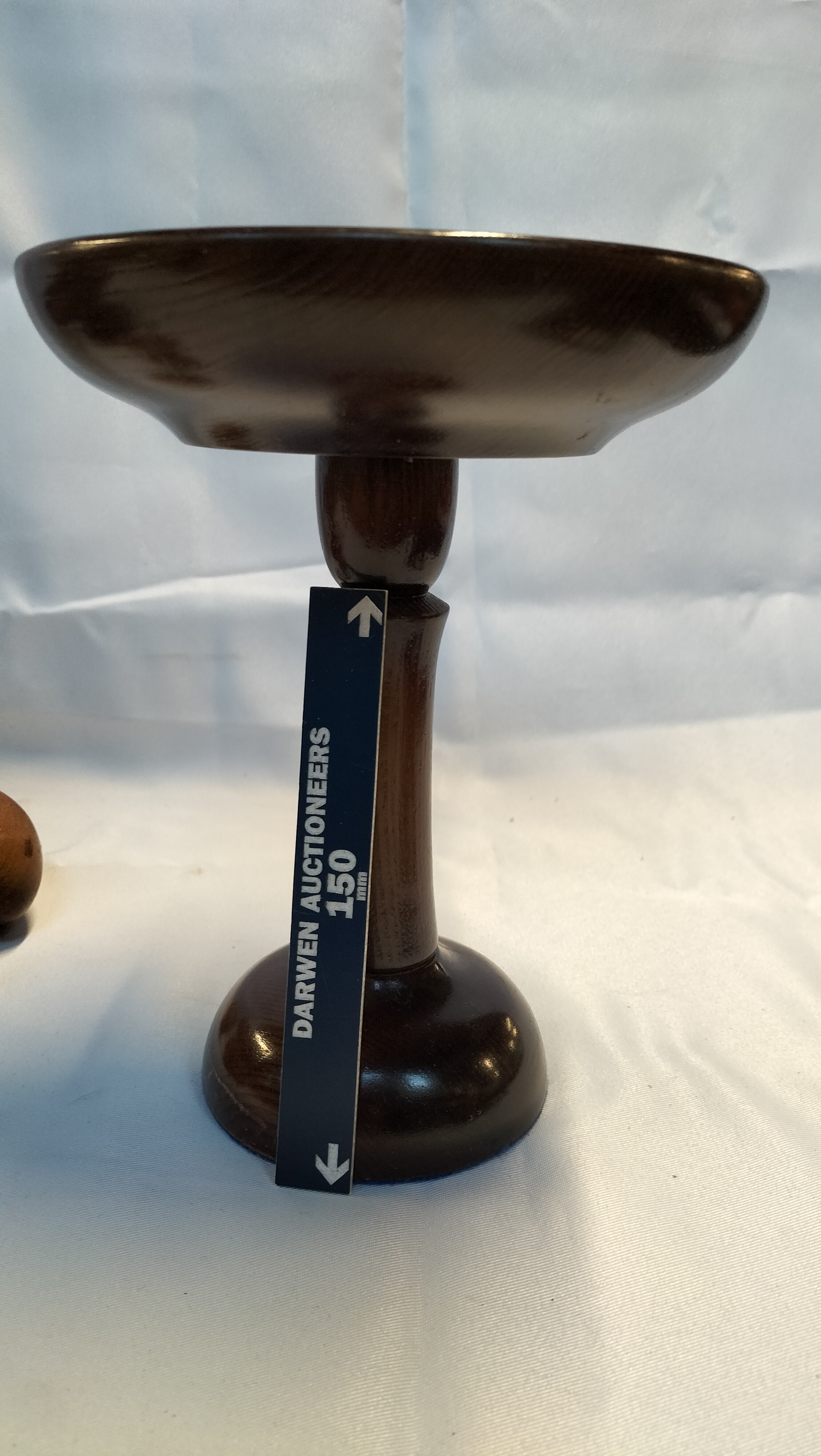 A collection of turned wood decorative and functional items. The group includes a revolving pedestal tray, commonly known as a Lazy Susan, featuring a wide, shallow dish with a moulded rim on a spreading conical base. Accompanying this is a taller pedestal bowl with a circular dish atop a baluster-turned stem and domed foot. The group also contains several turned wood eggs, possibly for darning or decorative use, showing a range of natural grain patterns and a polished, mahogany-toned finish. All items are lathe-turned with a smooth, lacquered surface. No maker’s marks are visible.