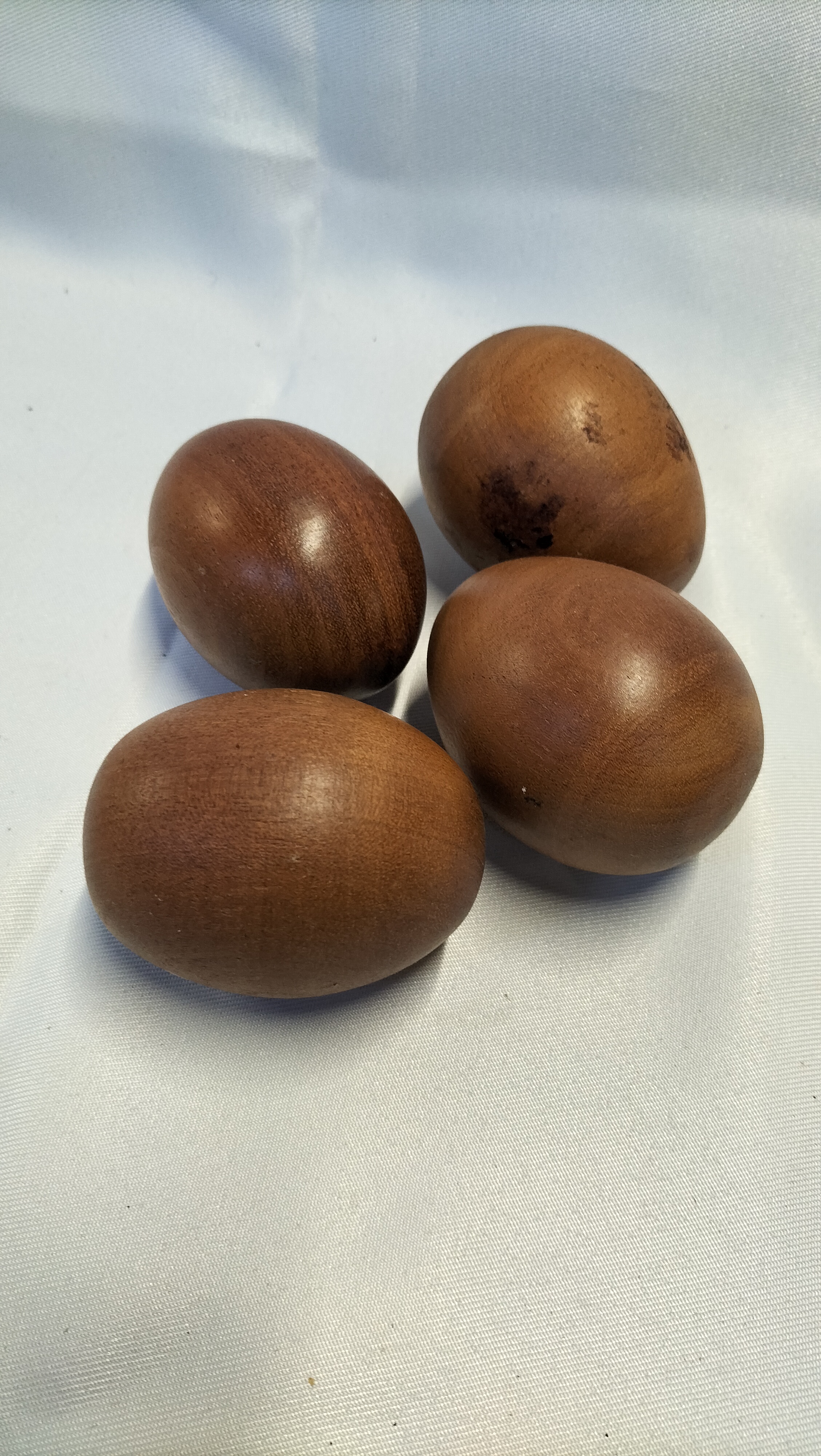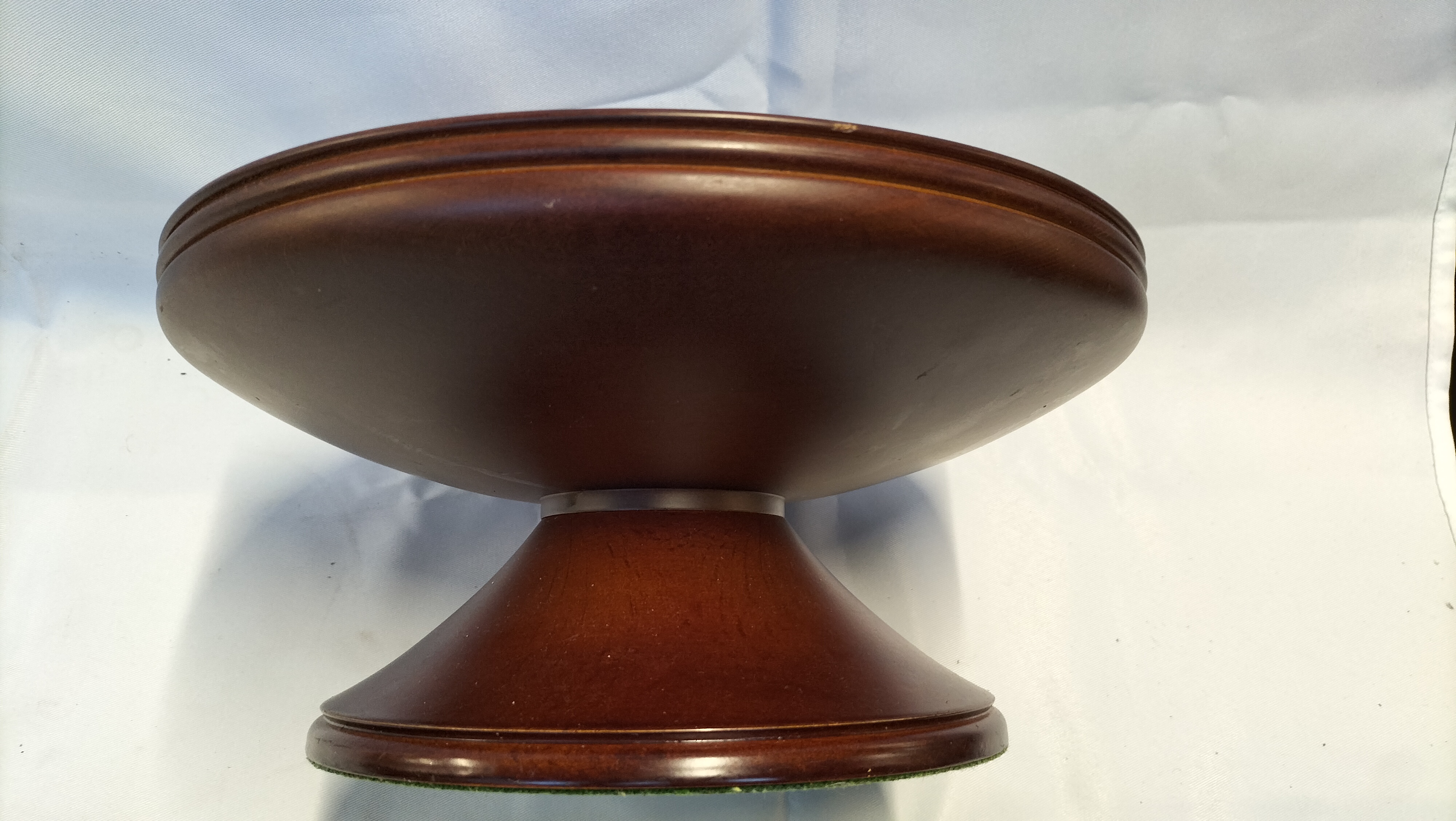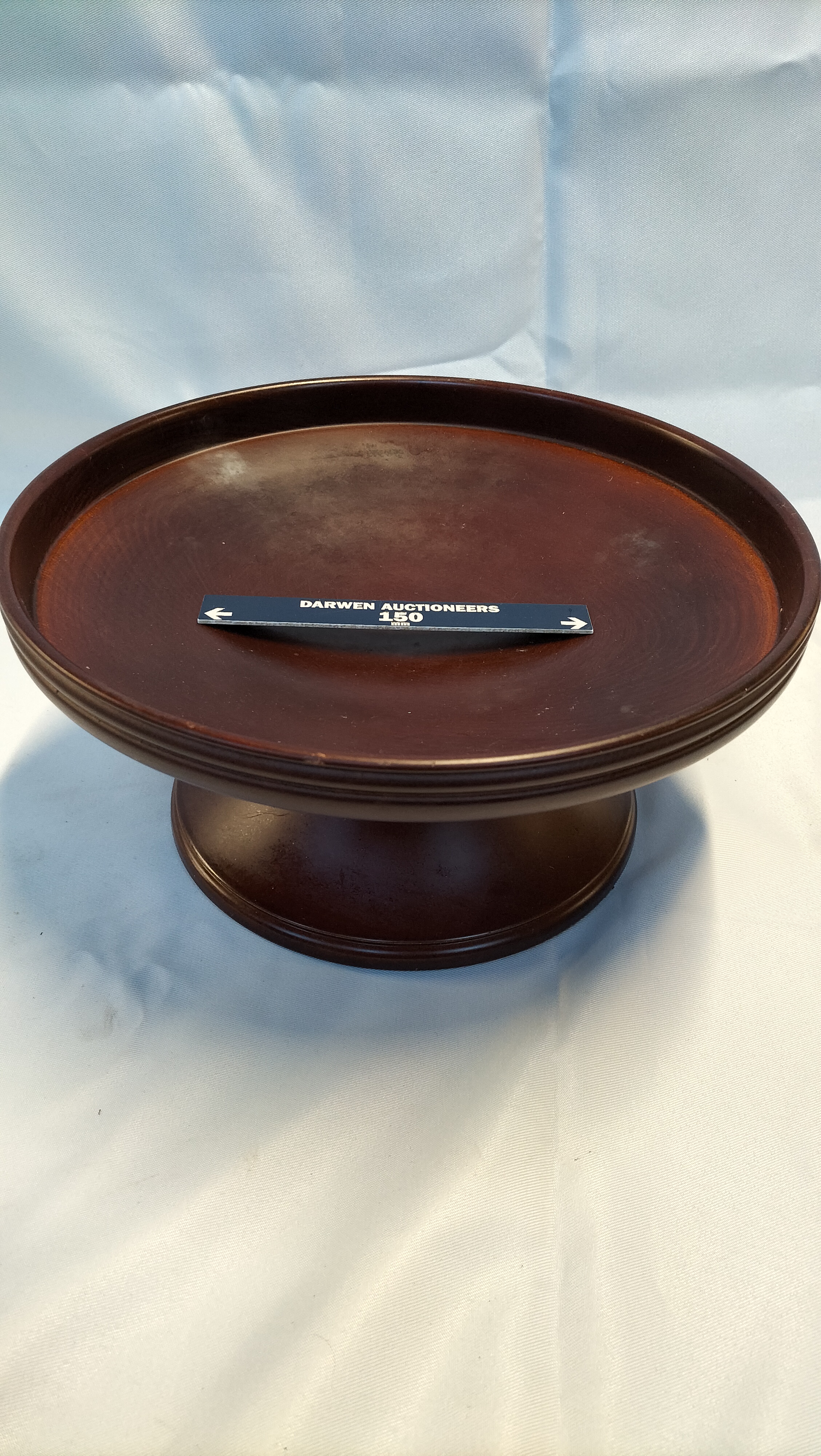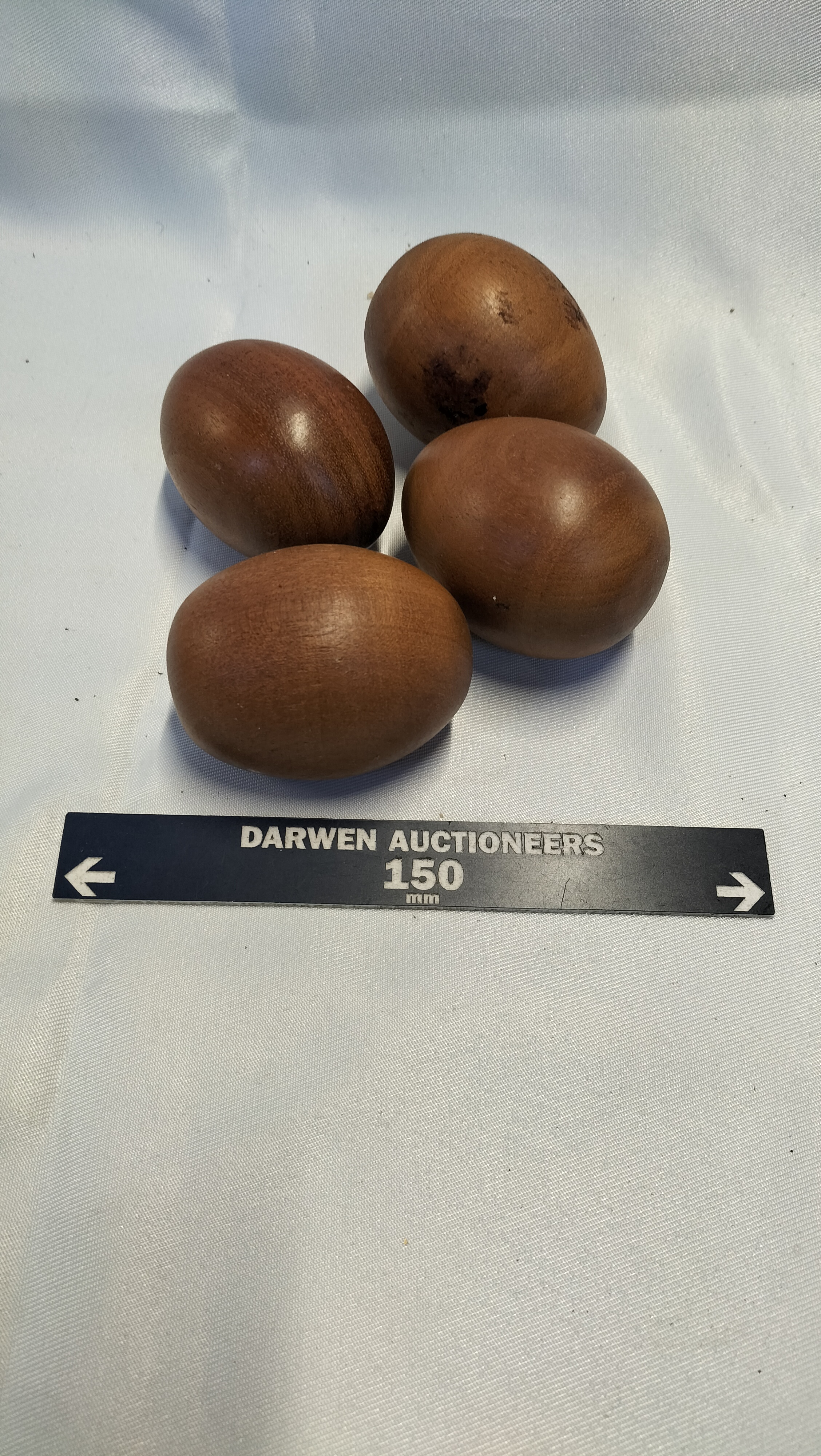 A collection of turned wood decorative and functional items. The group includes a revolving pedestal tray, commonly known as a Lazy Susan, featuring a wide, shallow dish with a moulded rim on a spreading conical base. Accompanying this is a taller pedestal bowl with a circular dish atop a baluster-turned stem and domed foot. The group also contains several turned wood eggs, possibly for darning or decorative use, showing a range of natural grain patterns and a polished, mahogany-toned finish. All items are lathe-turned with a smooth, lacquered surface. No maker’s marks are visible.