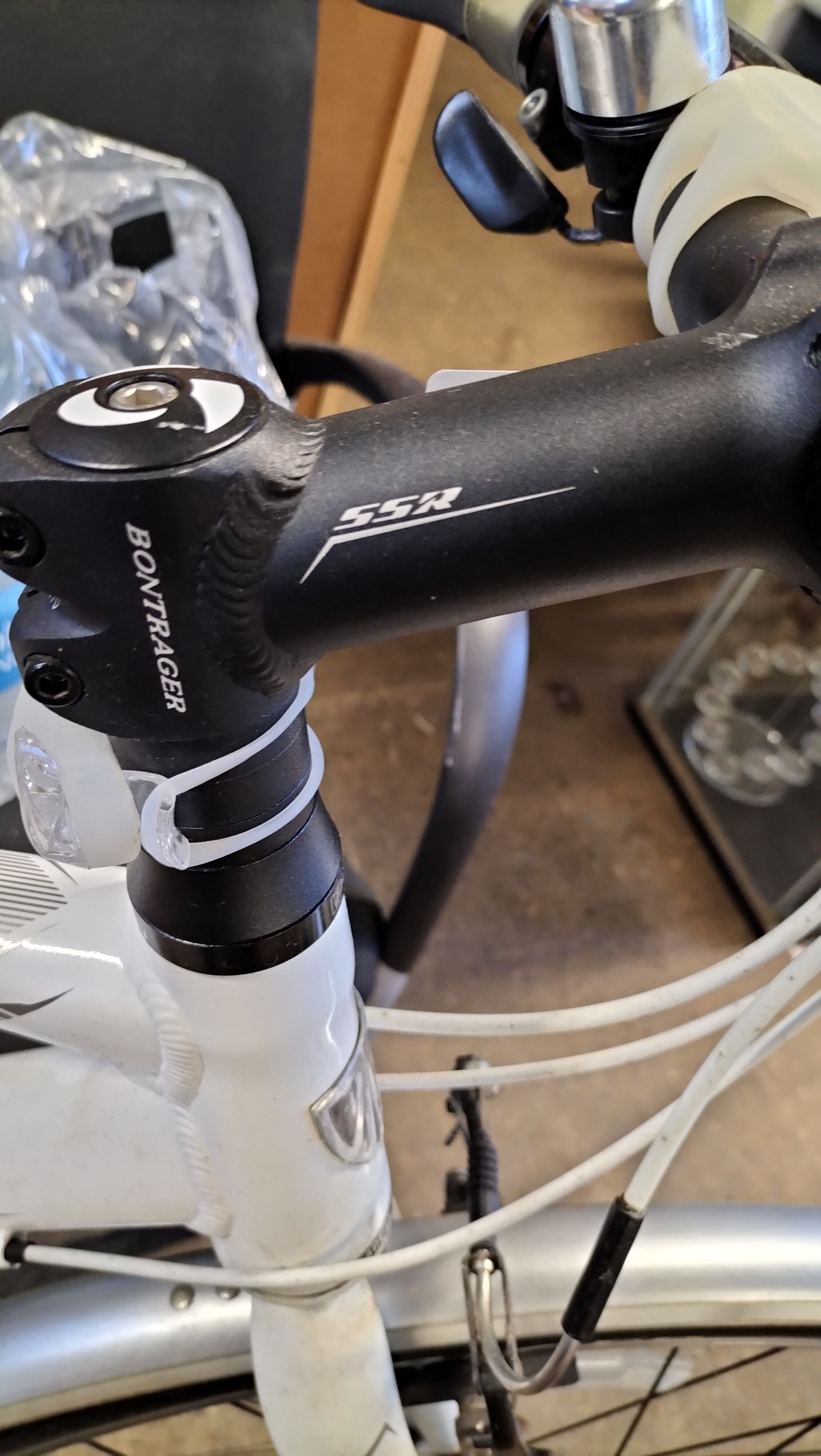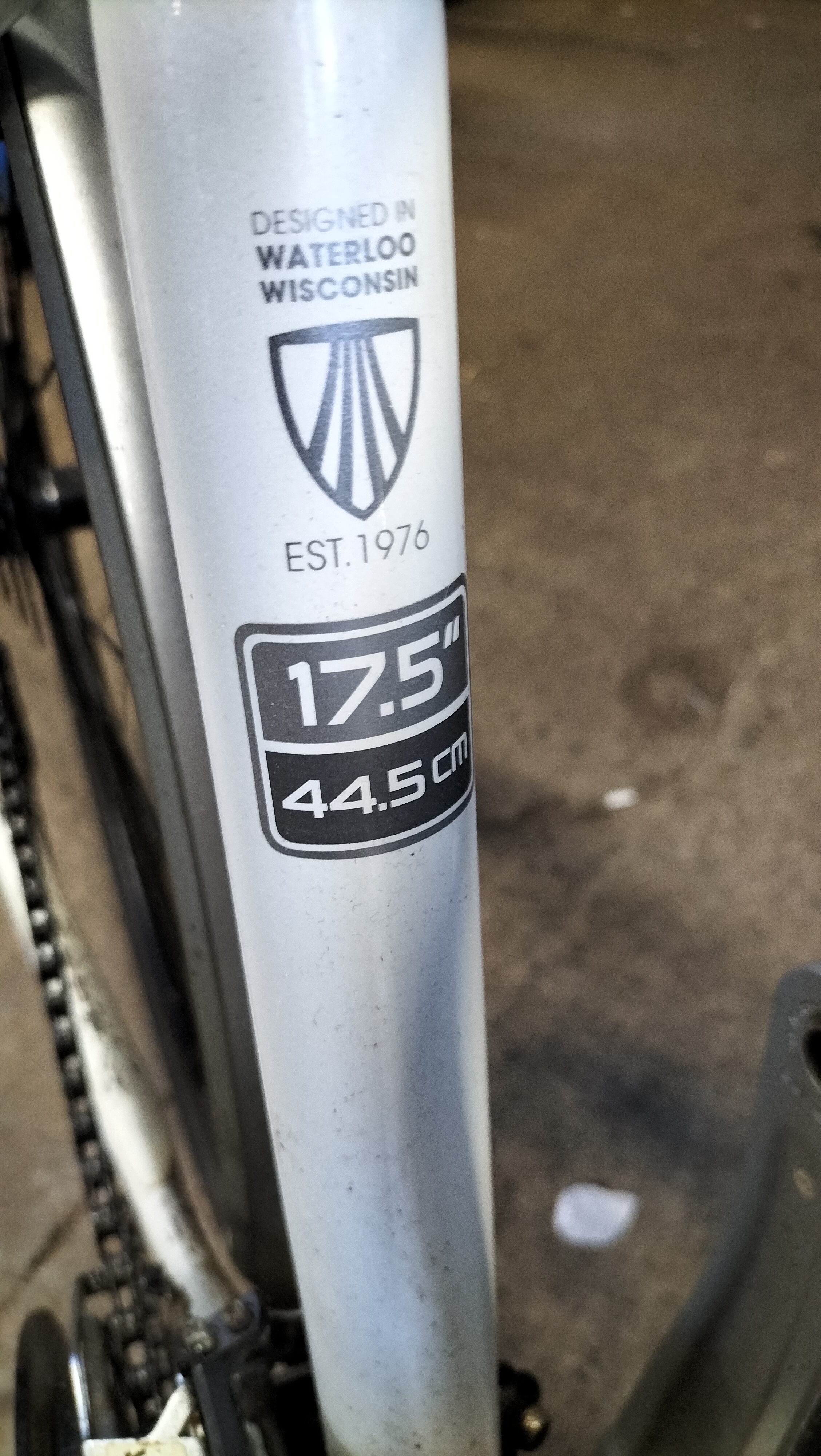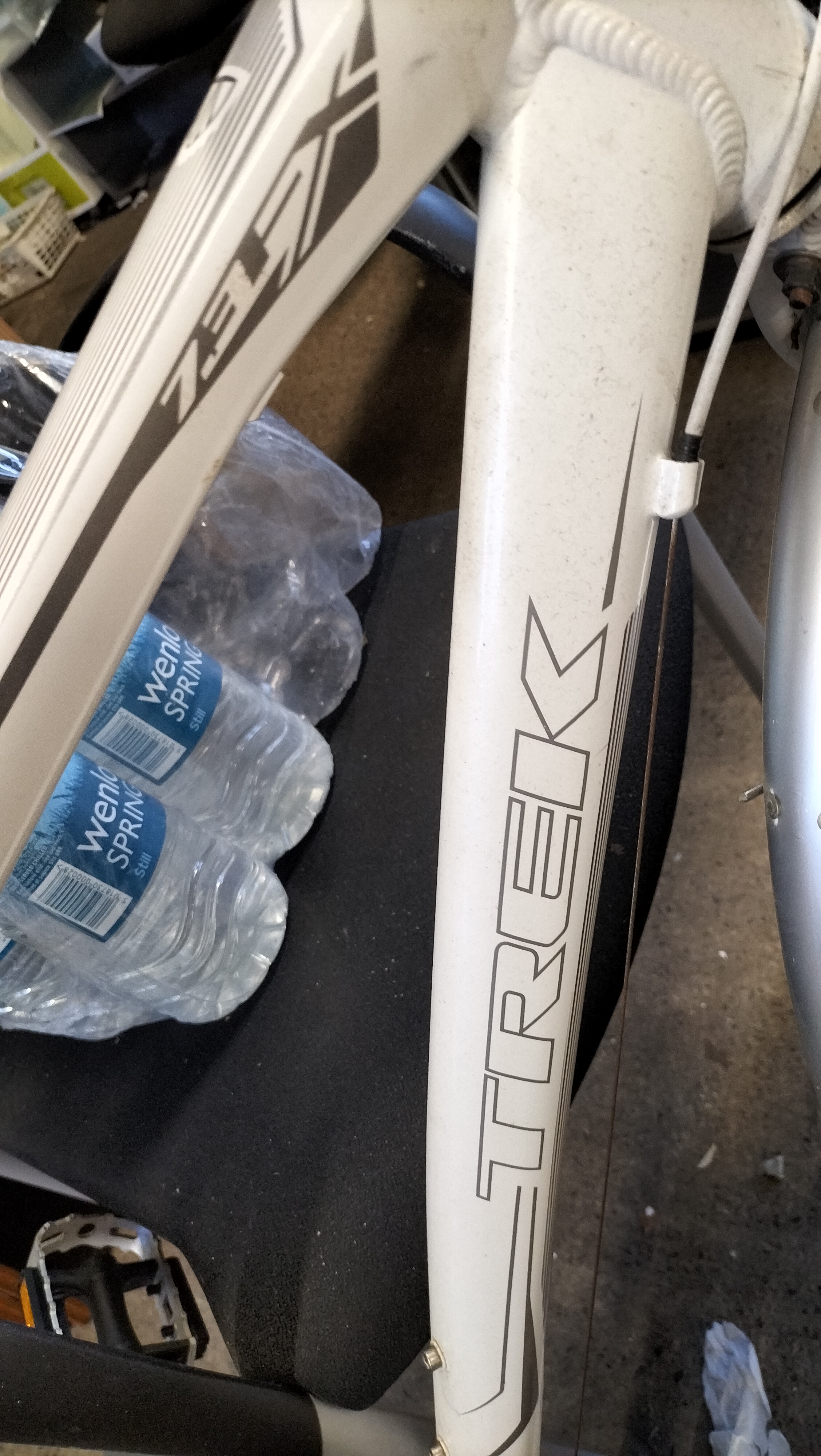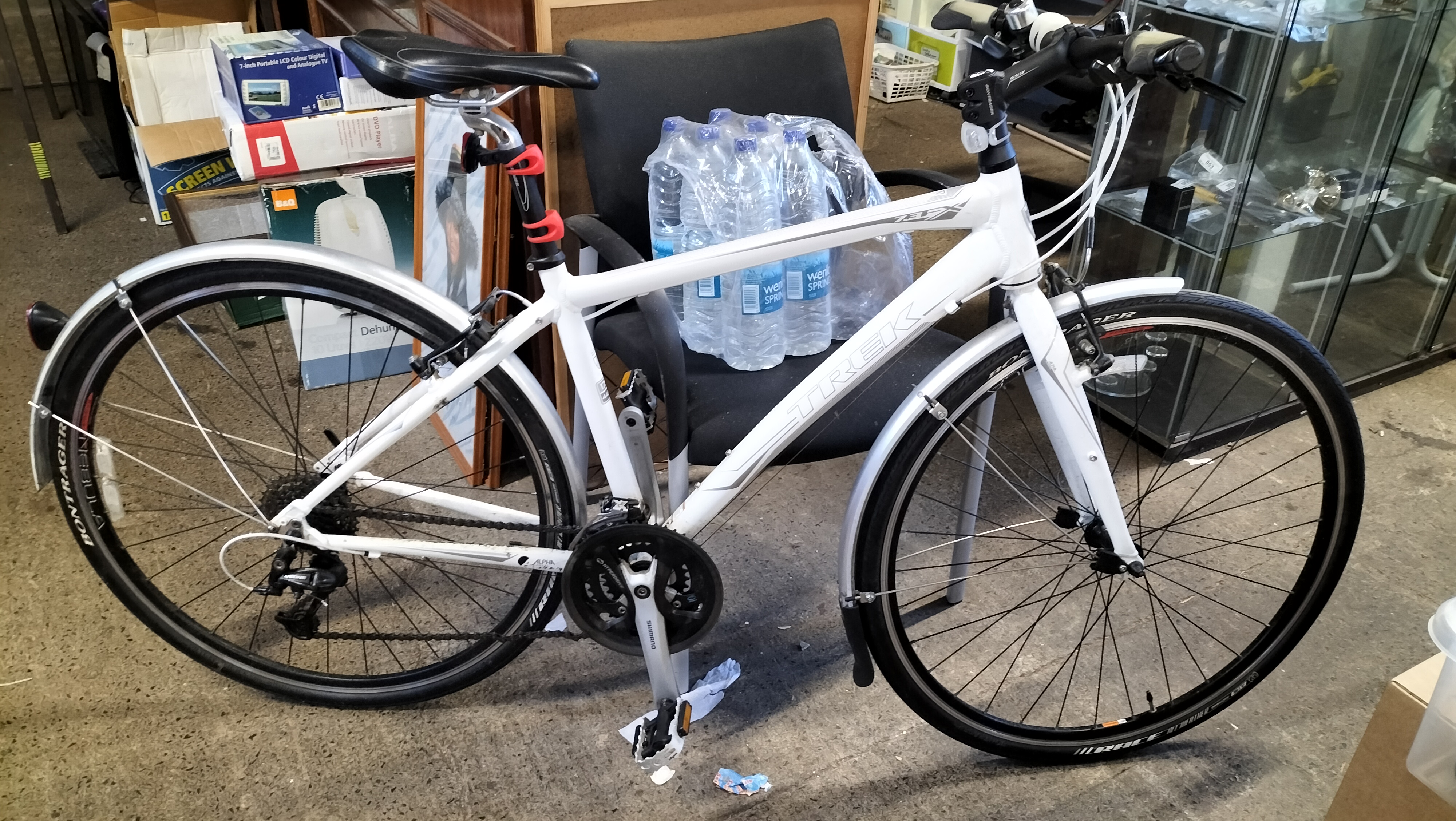 A Trek 7.3 FX WSD hybrid bicycle featuring a white-painted Alpha Aluminium frame. The frame is marked as size 17.5 inches (44.5 cm) and includes the manufacturer’s branding on the down tube and model designation on the top tube. Inscriptions on the frame state Designed in Waterloo Wisconsin Est. 1976 and Made in Taiwan. The bicycle is equipped with a Shimano drivetrain comprising a Deore rear derailleur, a Shimano Hyperdrive crankset, and Shimano integrated shifters with optical gear displays. Braking is provided by Avid Single Digit rim brakes. The bicycle features Bontrager branded components including the wheels, tyres, SSR stem, and handlebars fitted with inForm Satellite ergonomic grips. Additional equipment includes full-length silver-tone mudguards and a handlebar-mounted bell.