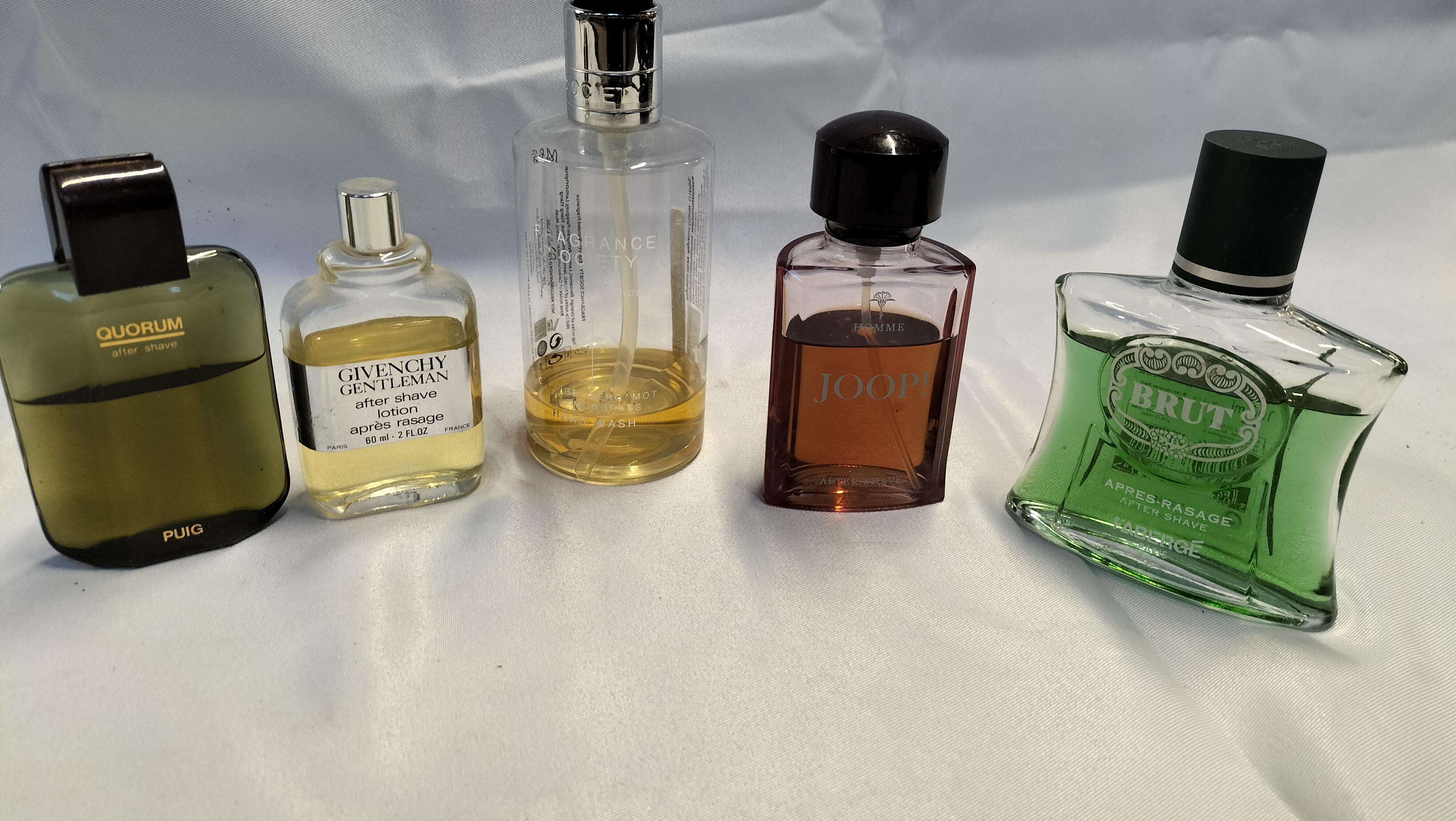An assortment of men’s grooming products comprising aftershave lotions and a hand wash. The collection includes a dark green glass bottle of Quorum aftershave by Puig; a clear glass bottle of Givenchy Gentleman aftershave lotion, labelled as 60ml; a clear bottle with a black pump dispenser for Fragrance Society hand wash; a rectangular purple-toned glass bottle of Joop! Homme aftershave; and a curved clear glass bottle containing green liquid for Brut by Fabergé. The containers are constructed from glass and plastic with various screw caps and a pump mechanism. Visible markings include brand names and product specifications printed directly on the bottles or on applied labels.