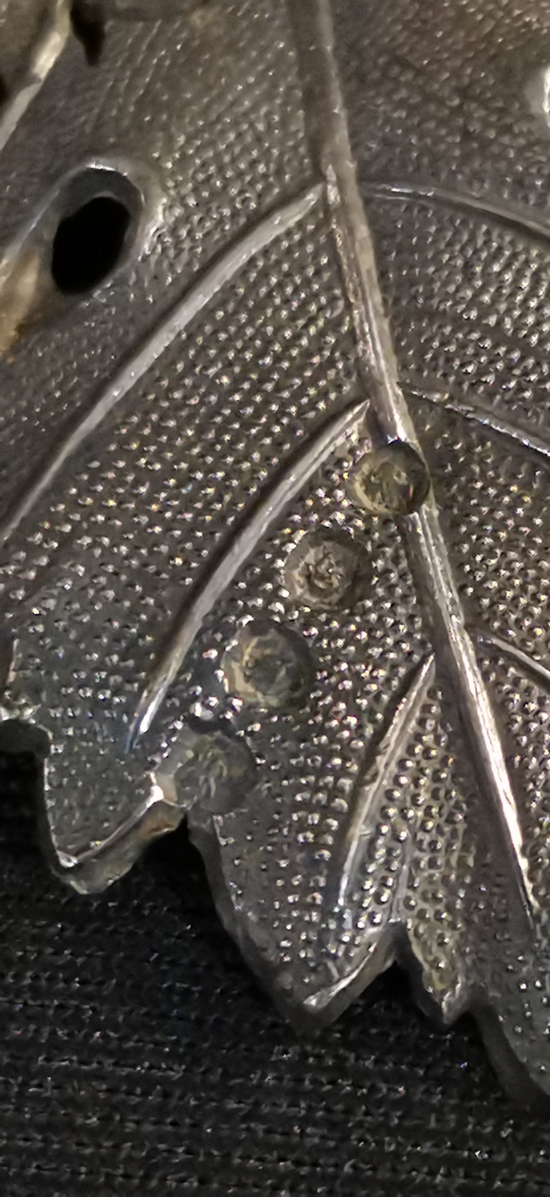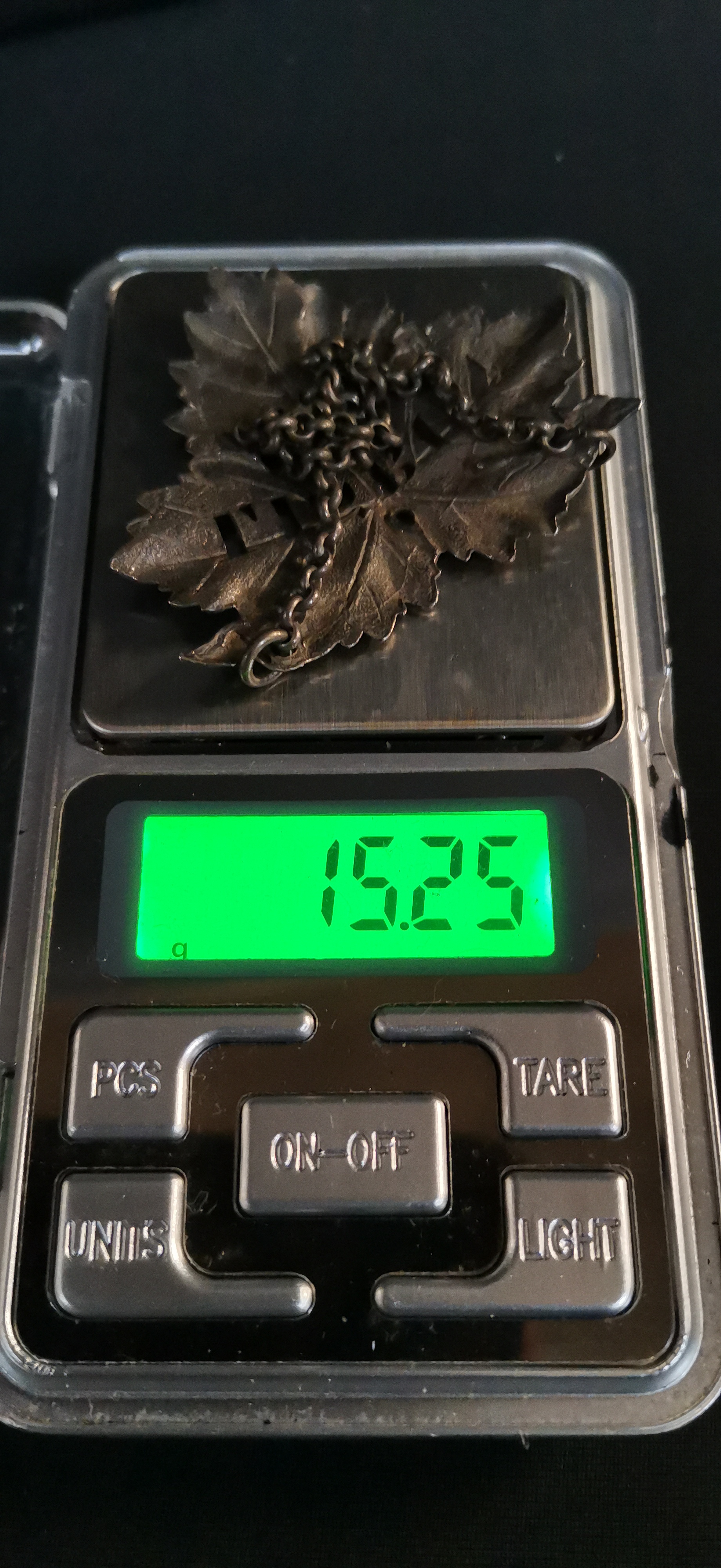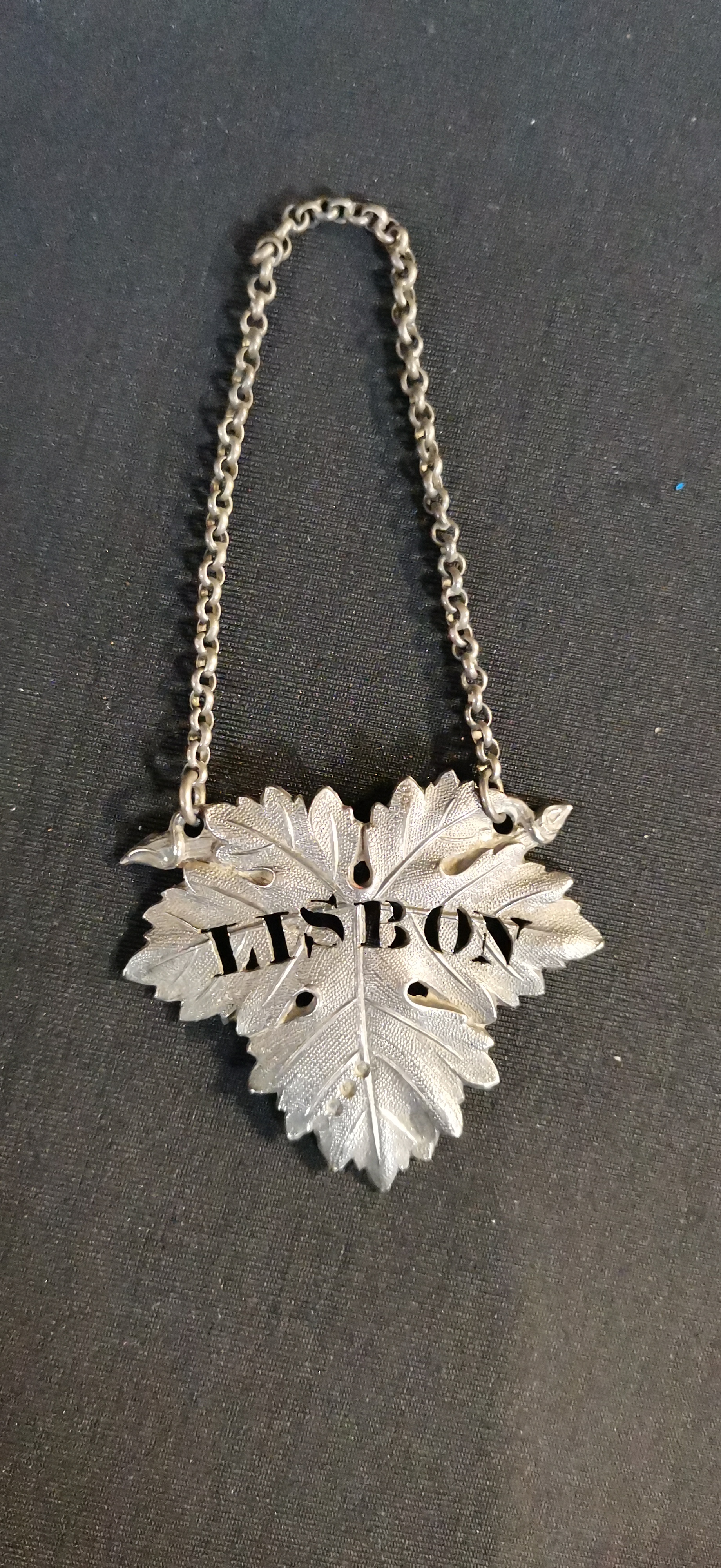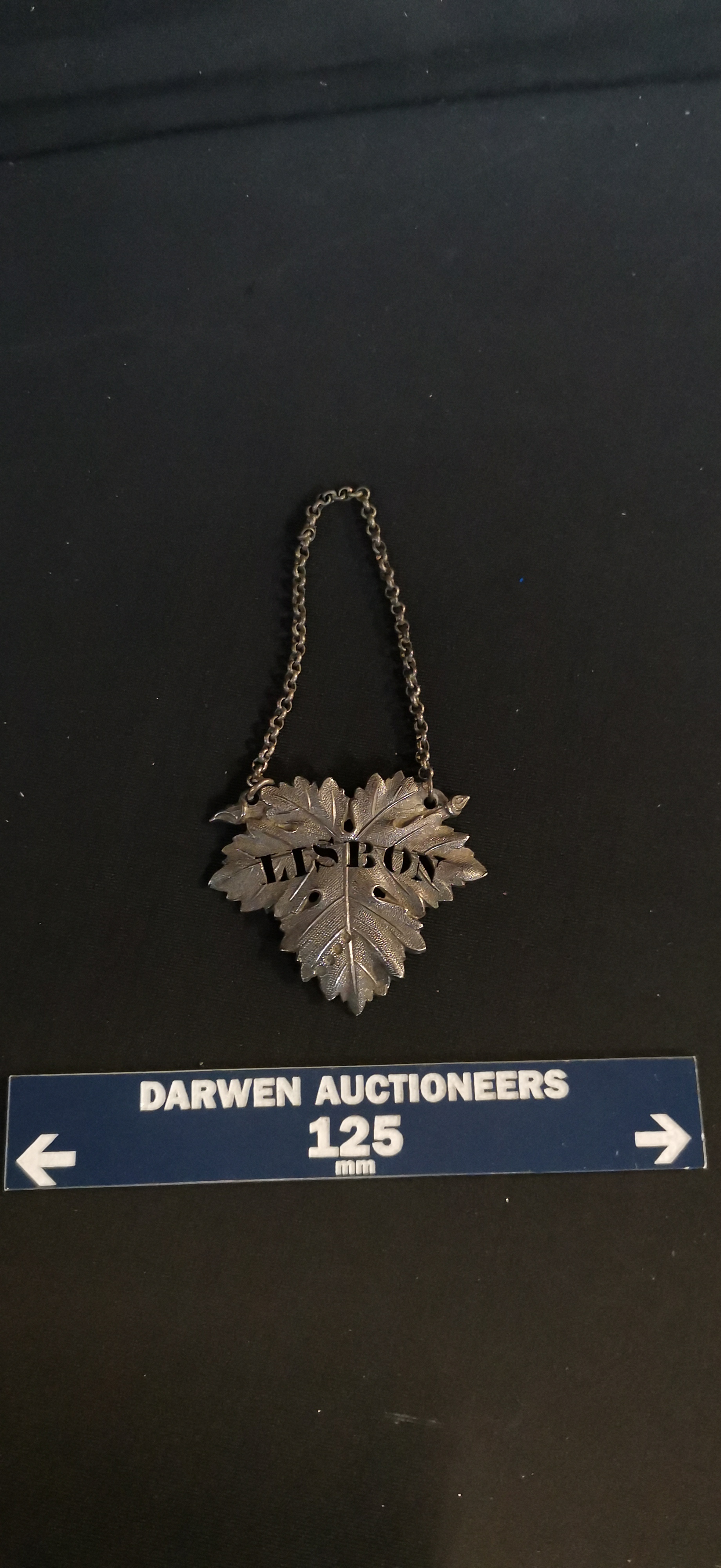 A silver vine leaf-shaped decanter label featuring cutout Lisbon text and an attached suspension chain, with a total weight of 15.25 g.