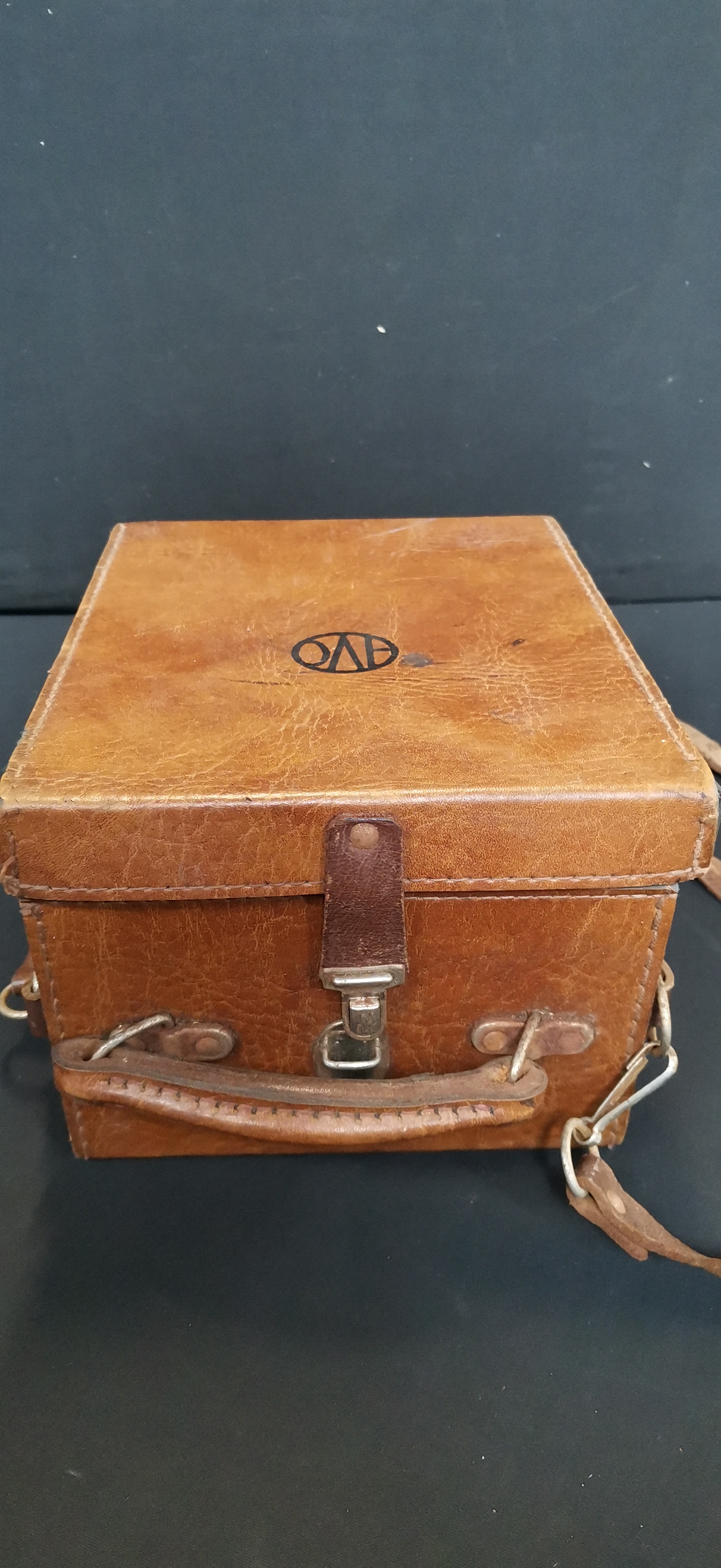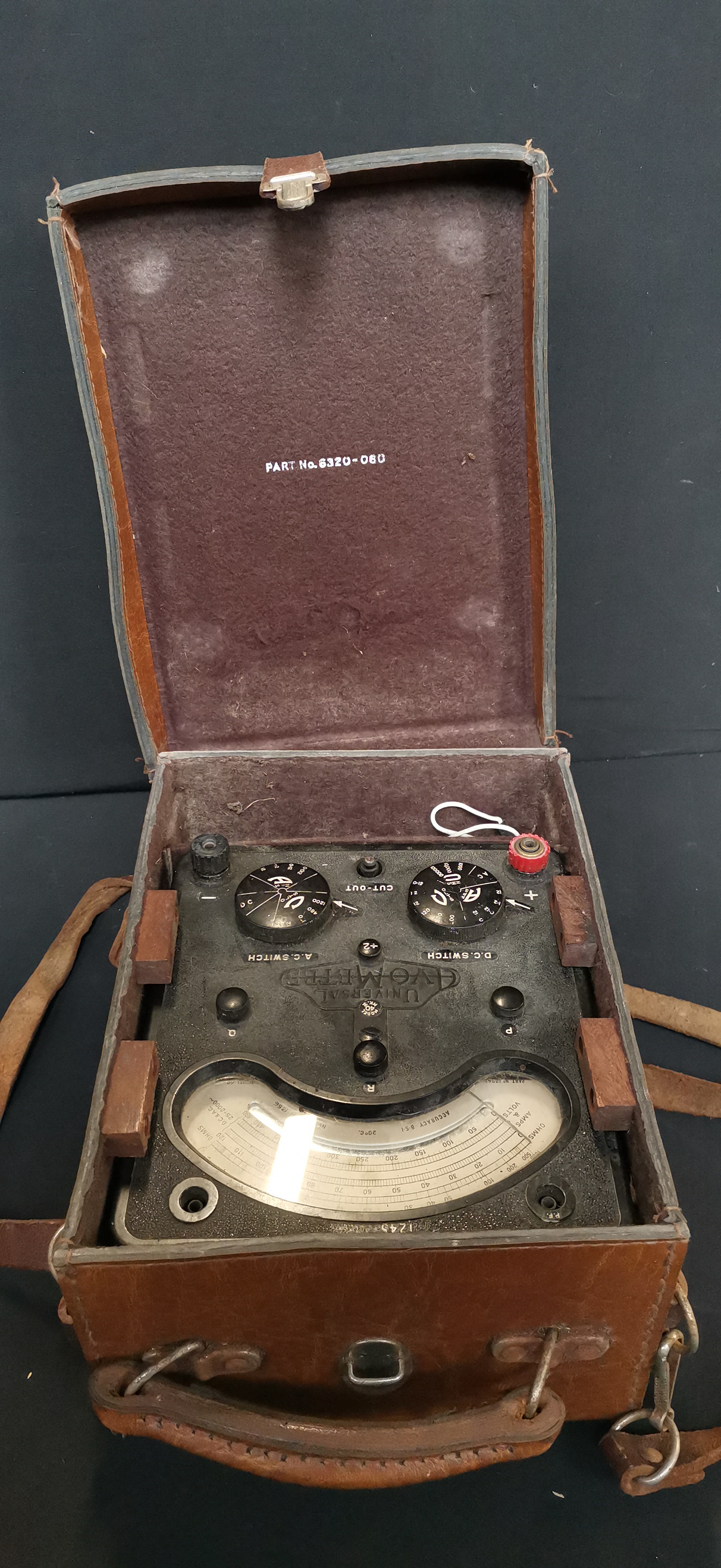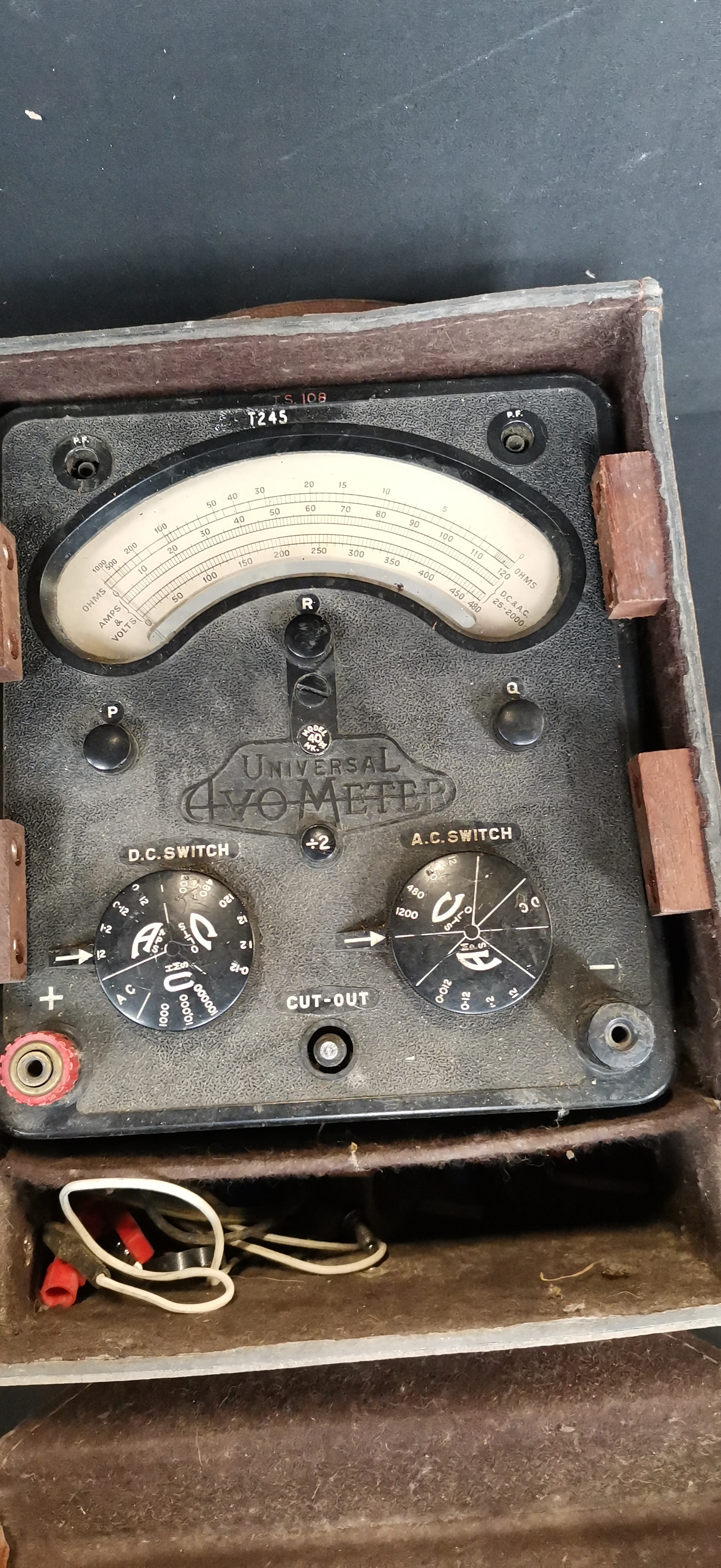 A black Universal Avometer Model 40 Mk. II electrical multimeter marked T.S. 108 and T245, housed in a branded brown leather carrying case.