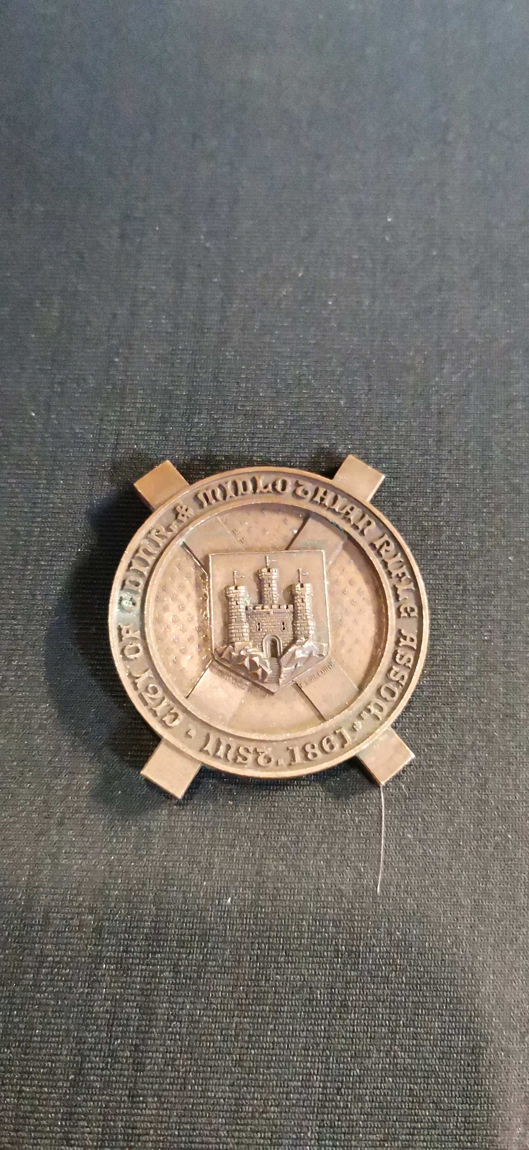 A bronze-coloured medallion featuring a crowned shield with a rampant lion for the Caledonian Challenge Shield and the City of Edinburgh and Midlothian Rifle Association, measuring approximately 45mm in diameter.