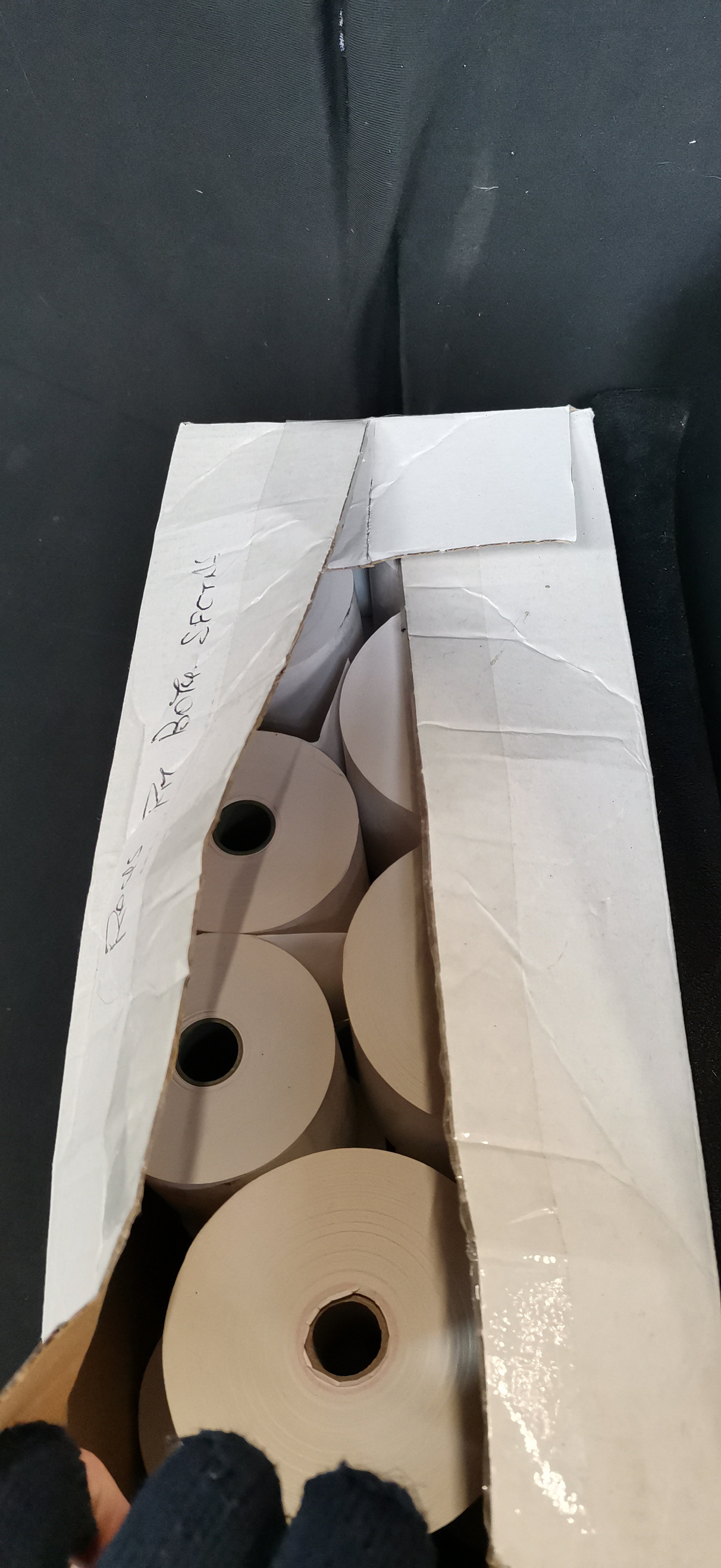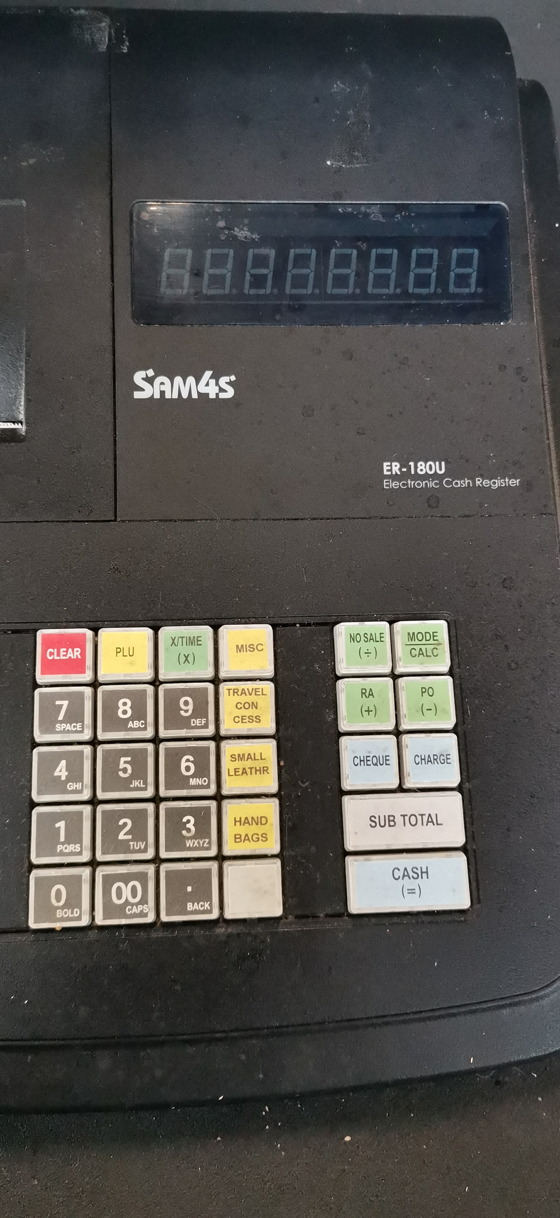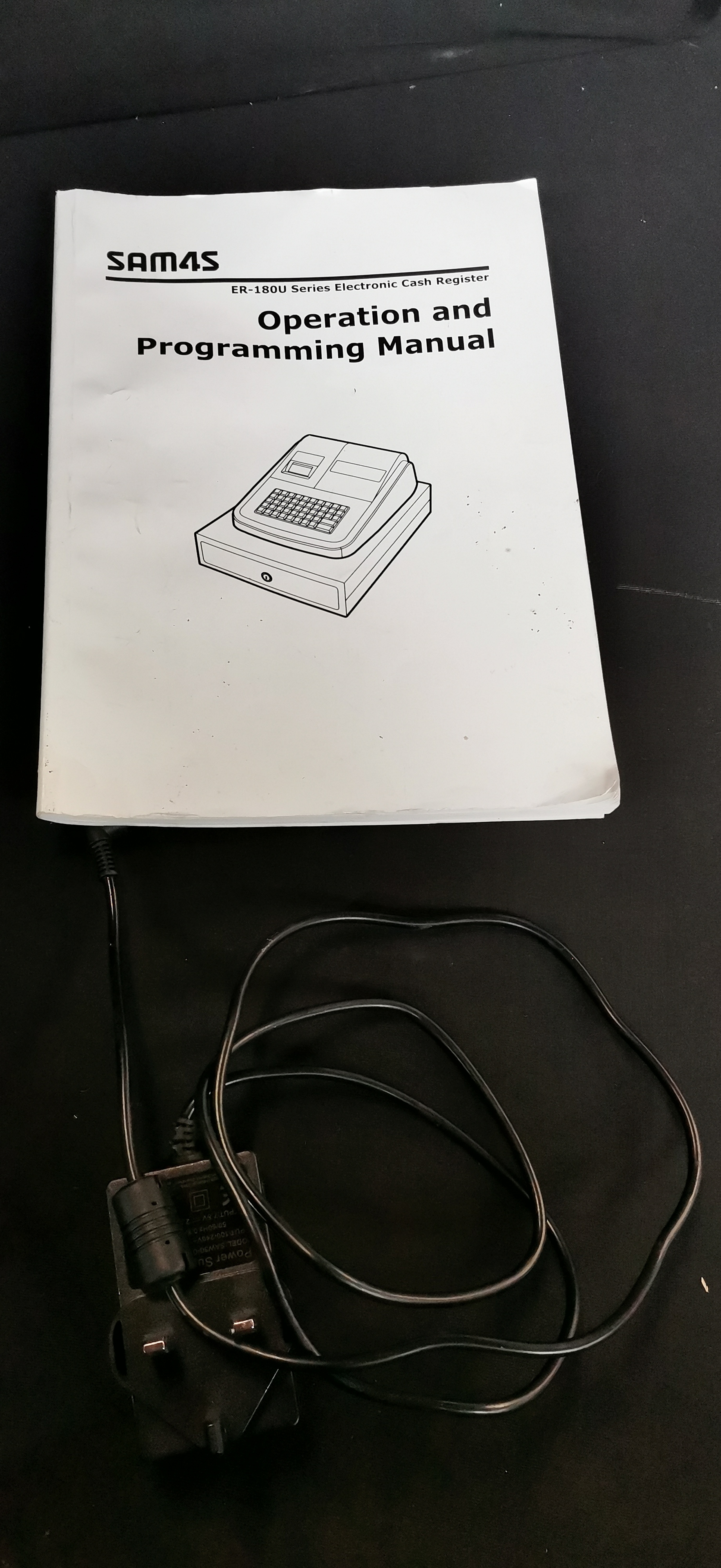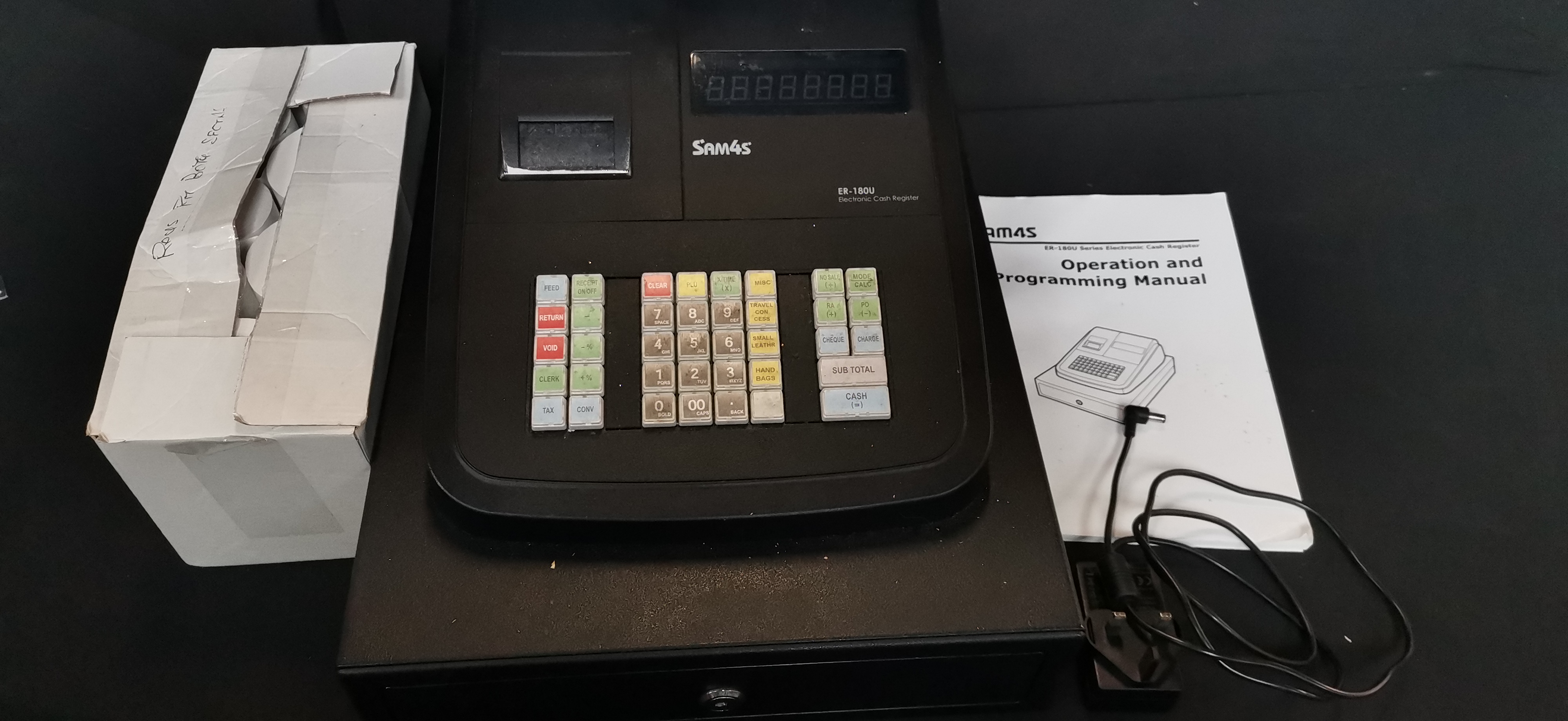 A black SAM4S ER-180U electronic cash register accompanied by a power adapter, operation manual, and a collection of paper rolls.