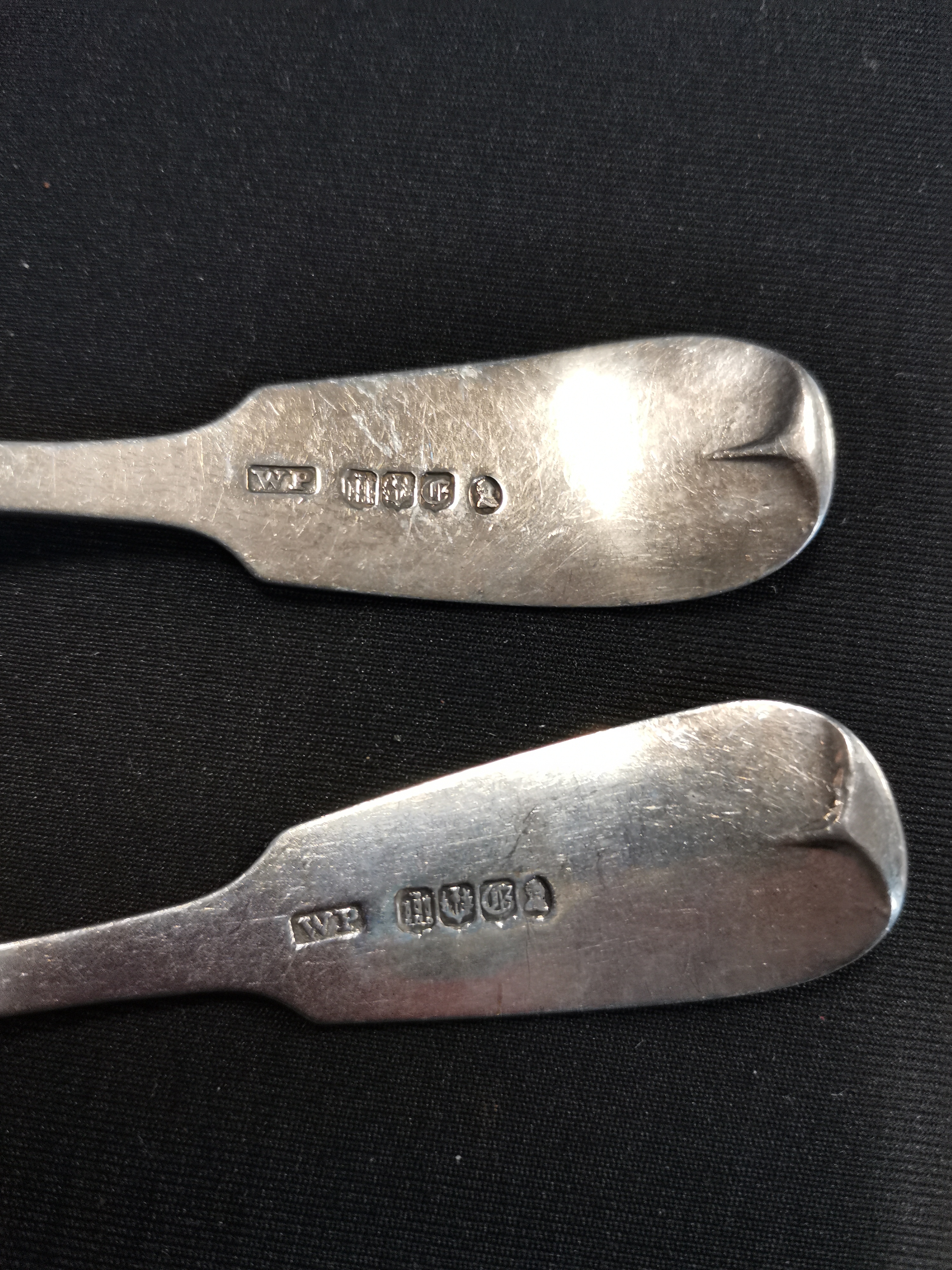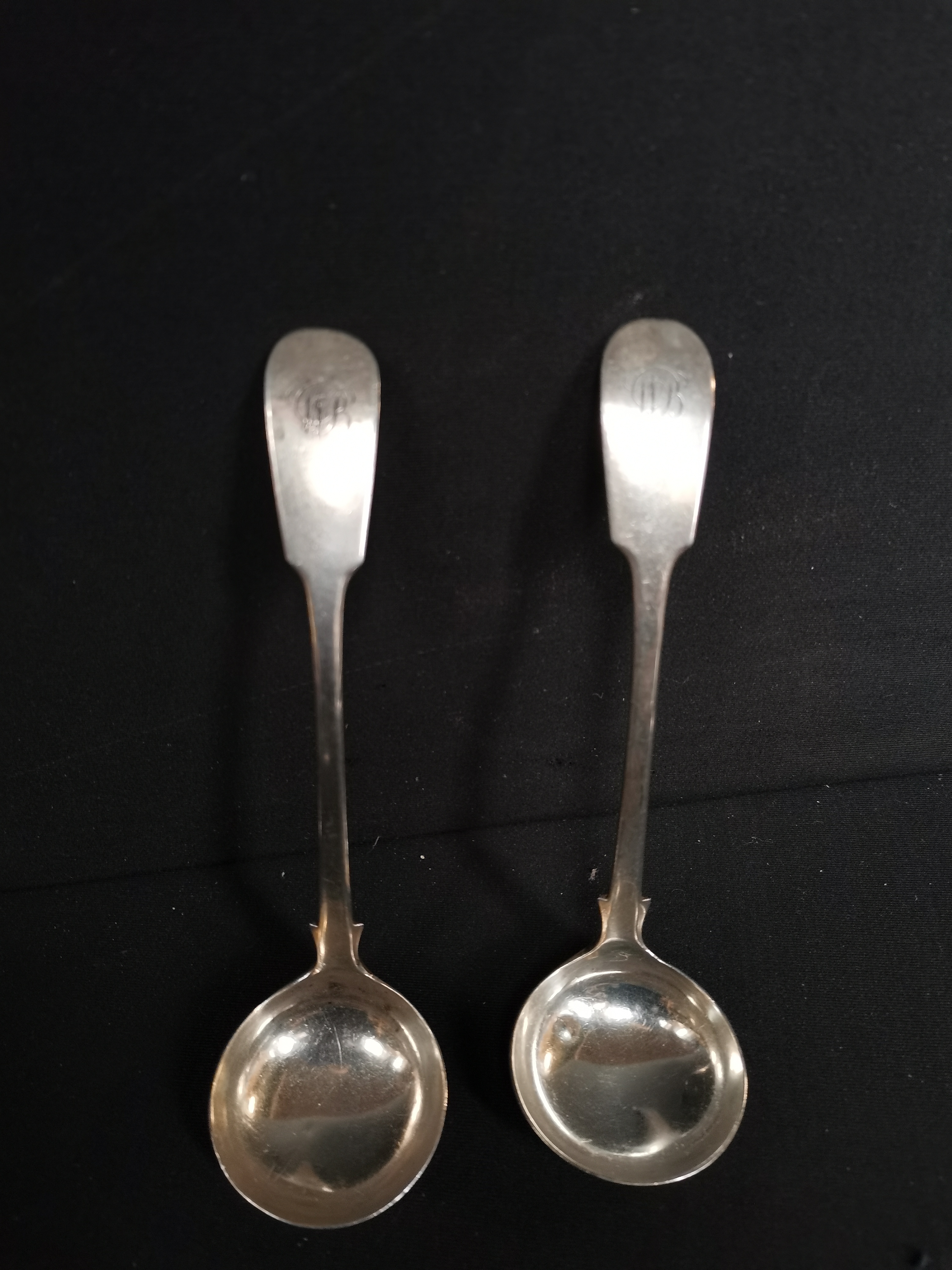 A pair of sterling silver fiddle pattern sauce ladles with monograms JER and MB and maker mark WP, weighing 65g total.