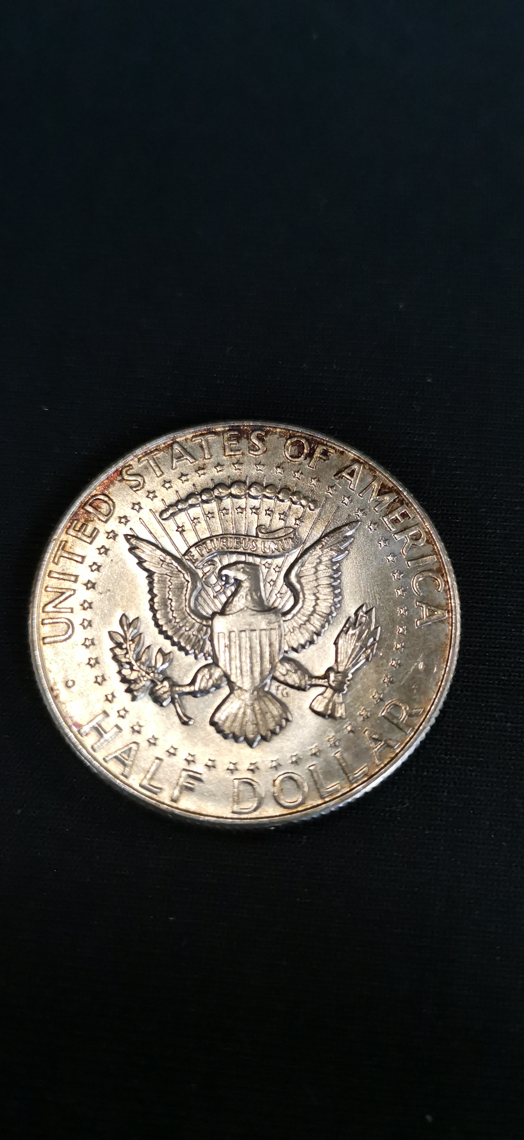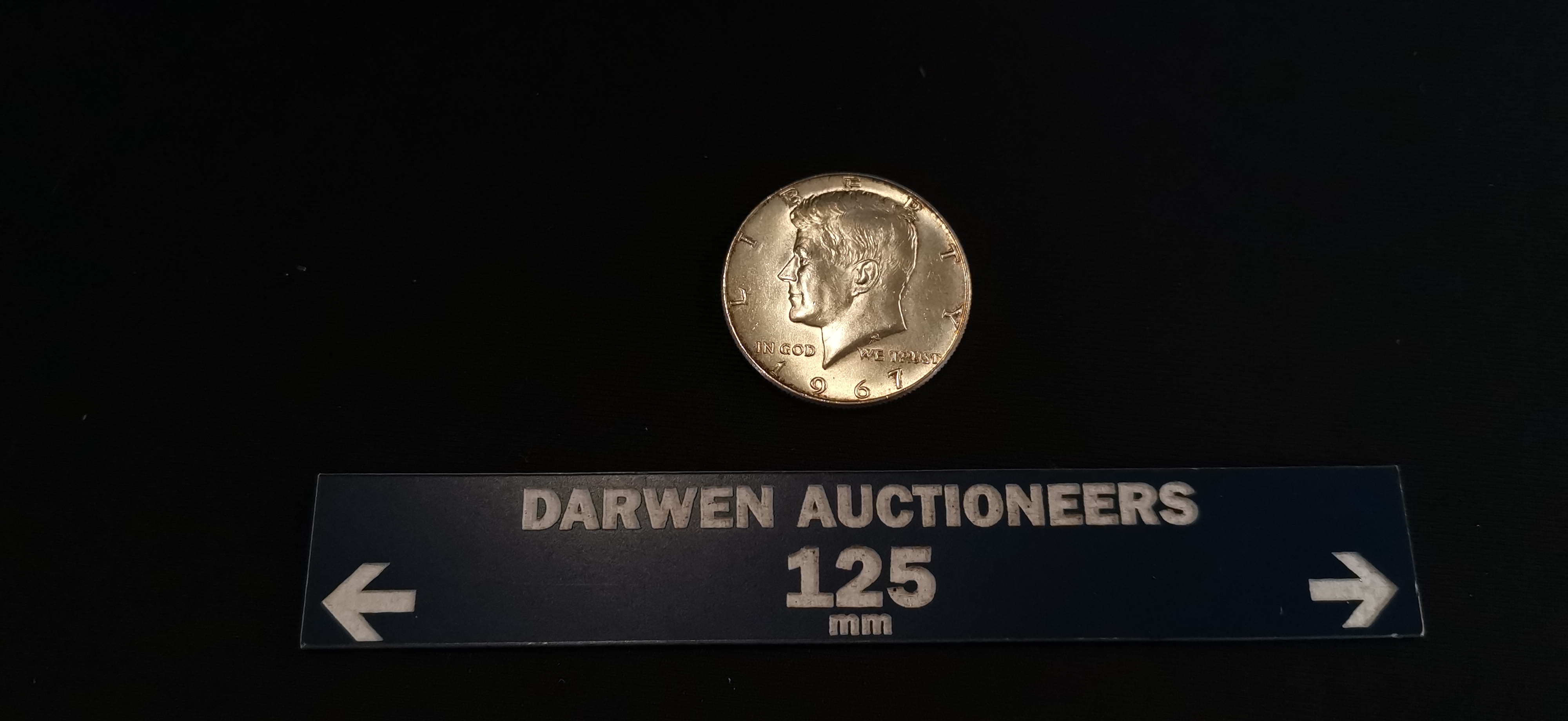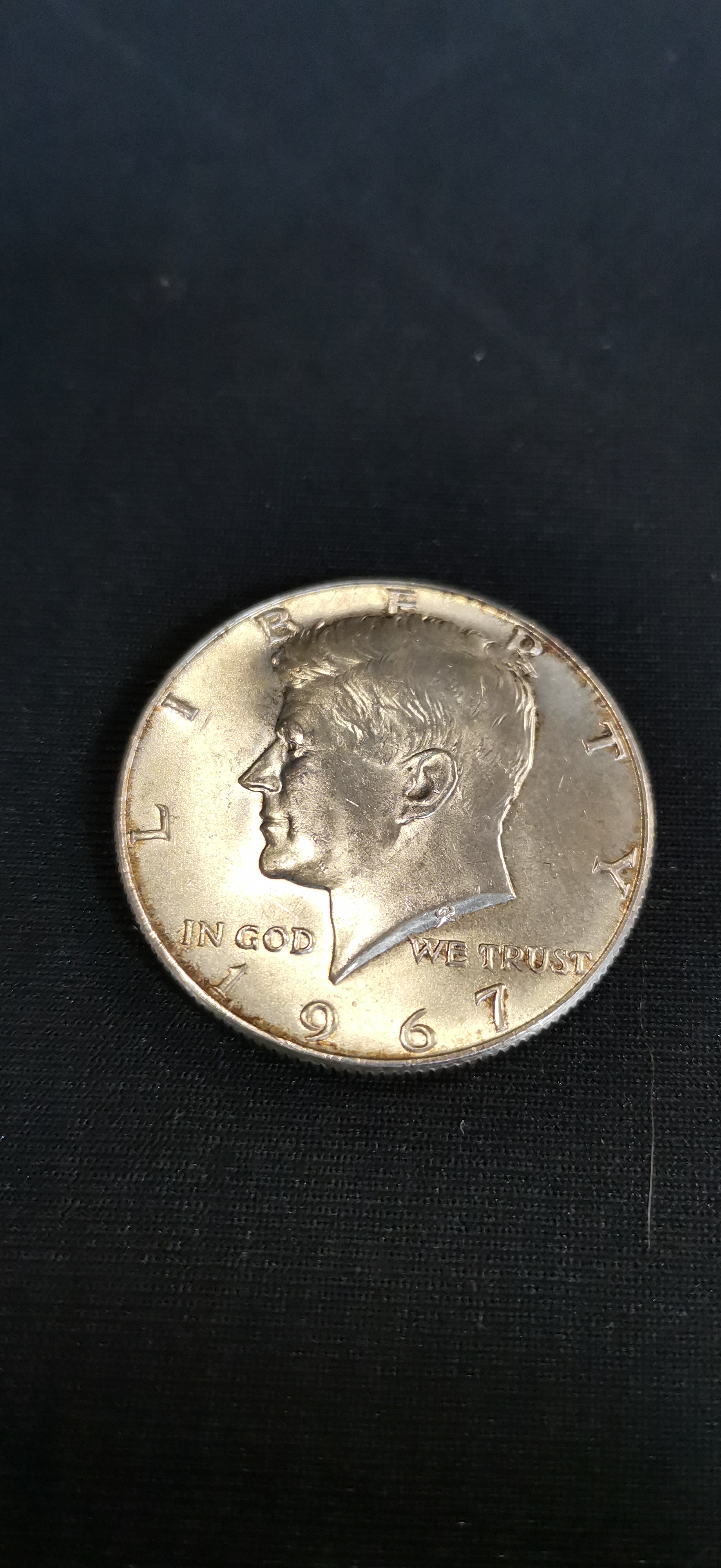 A 1967 United States Kennedy half dollar coin composed of 40 percent silver featuring the profile of John F. Kennedy on the obverse and the presidential seal on the reverse.
