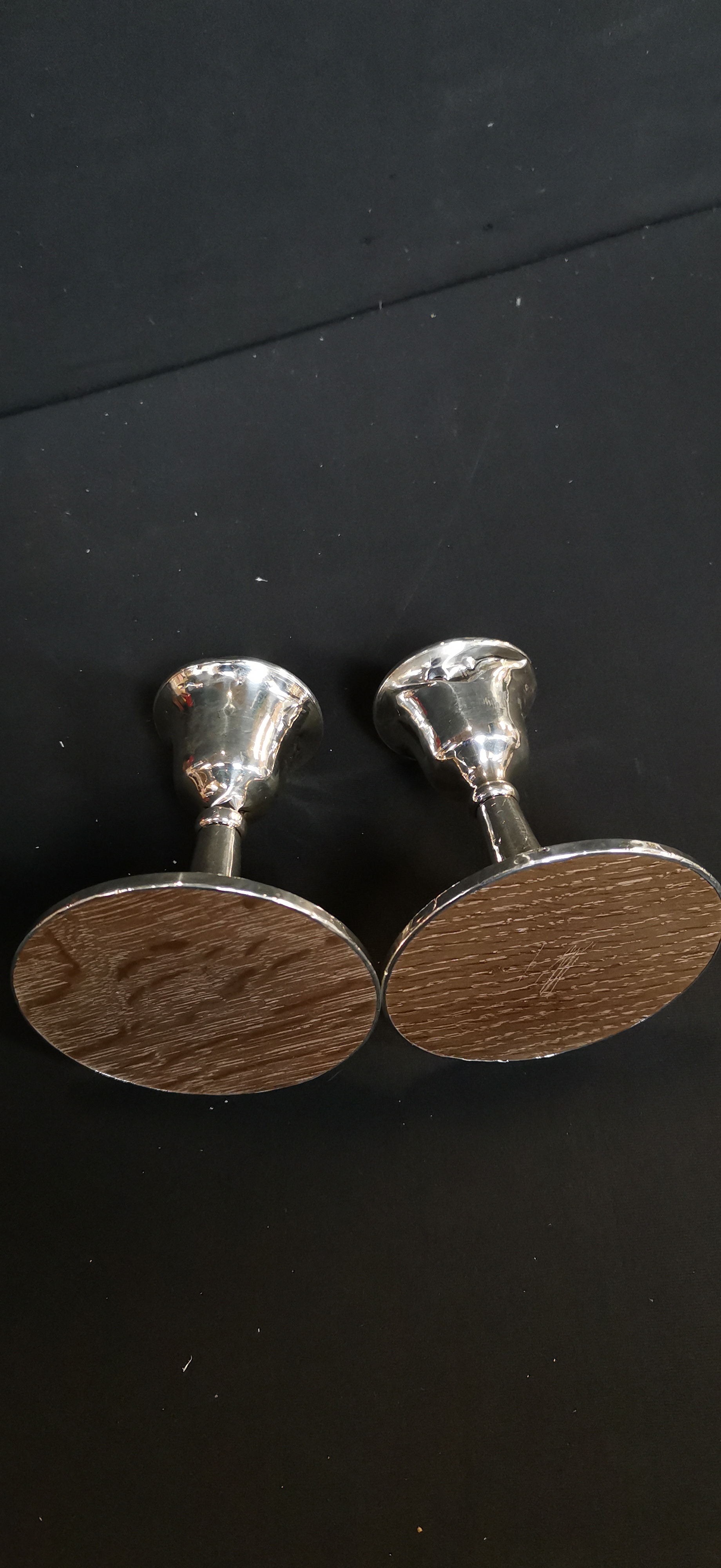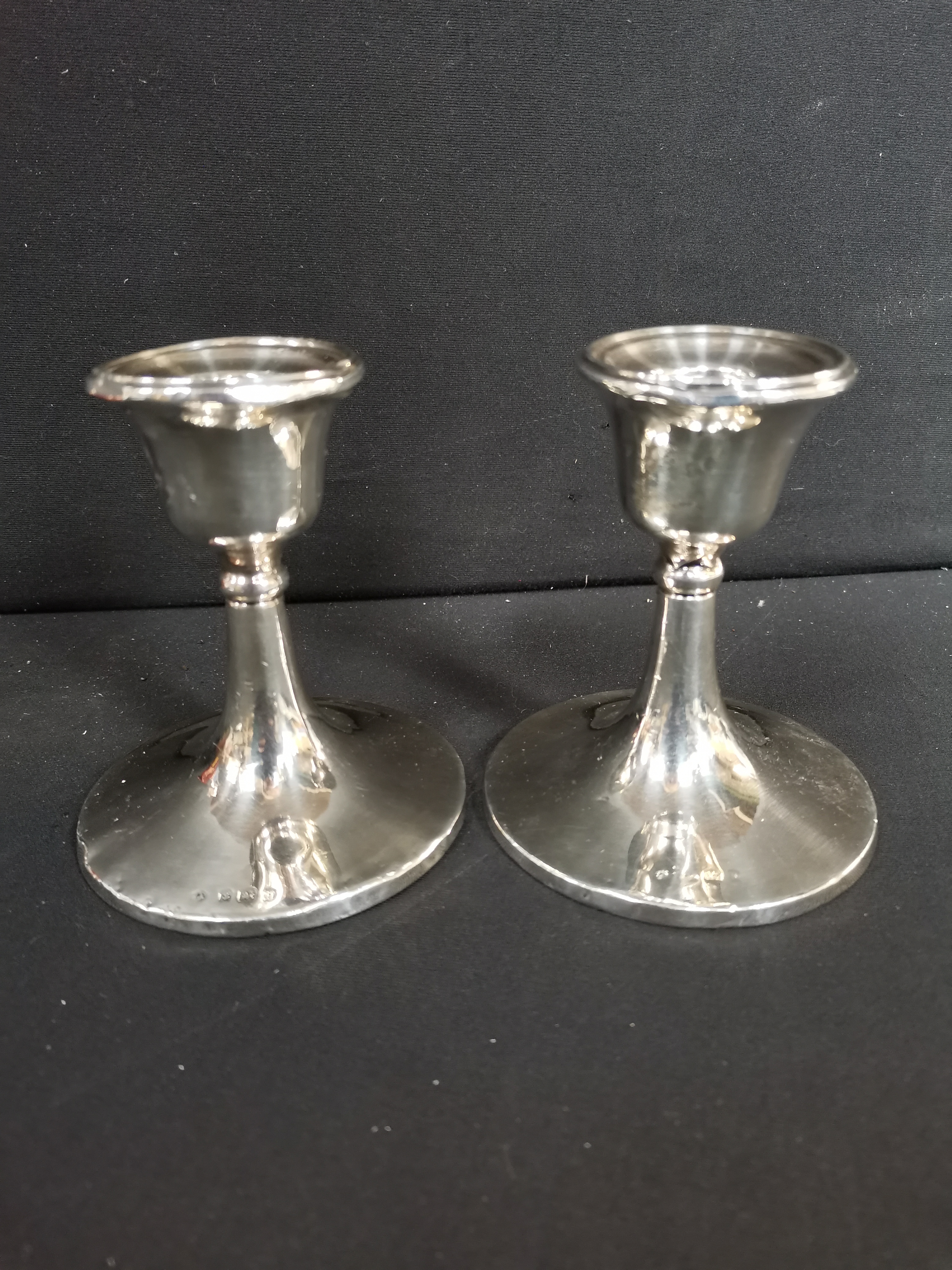 A pair of sterling silver weighted candlesticks featuring Birmingham hallmarks including the lion passant and anchor, designed in a minimalist Art Deco style.