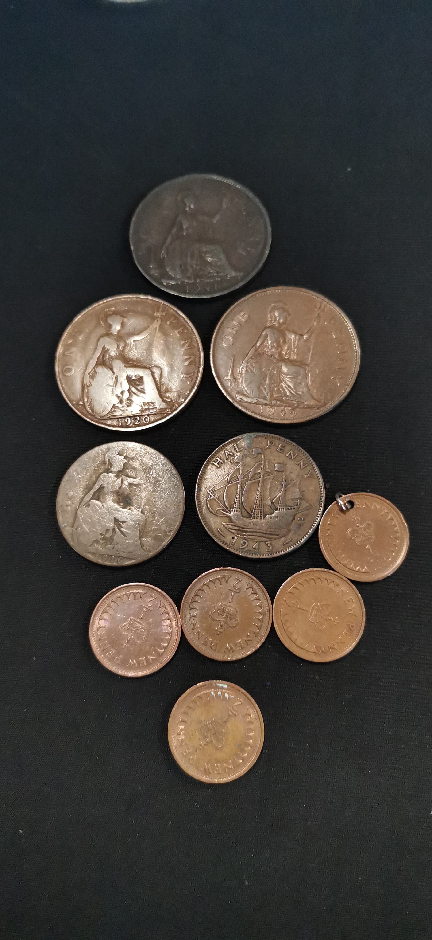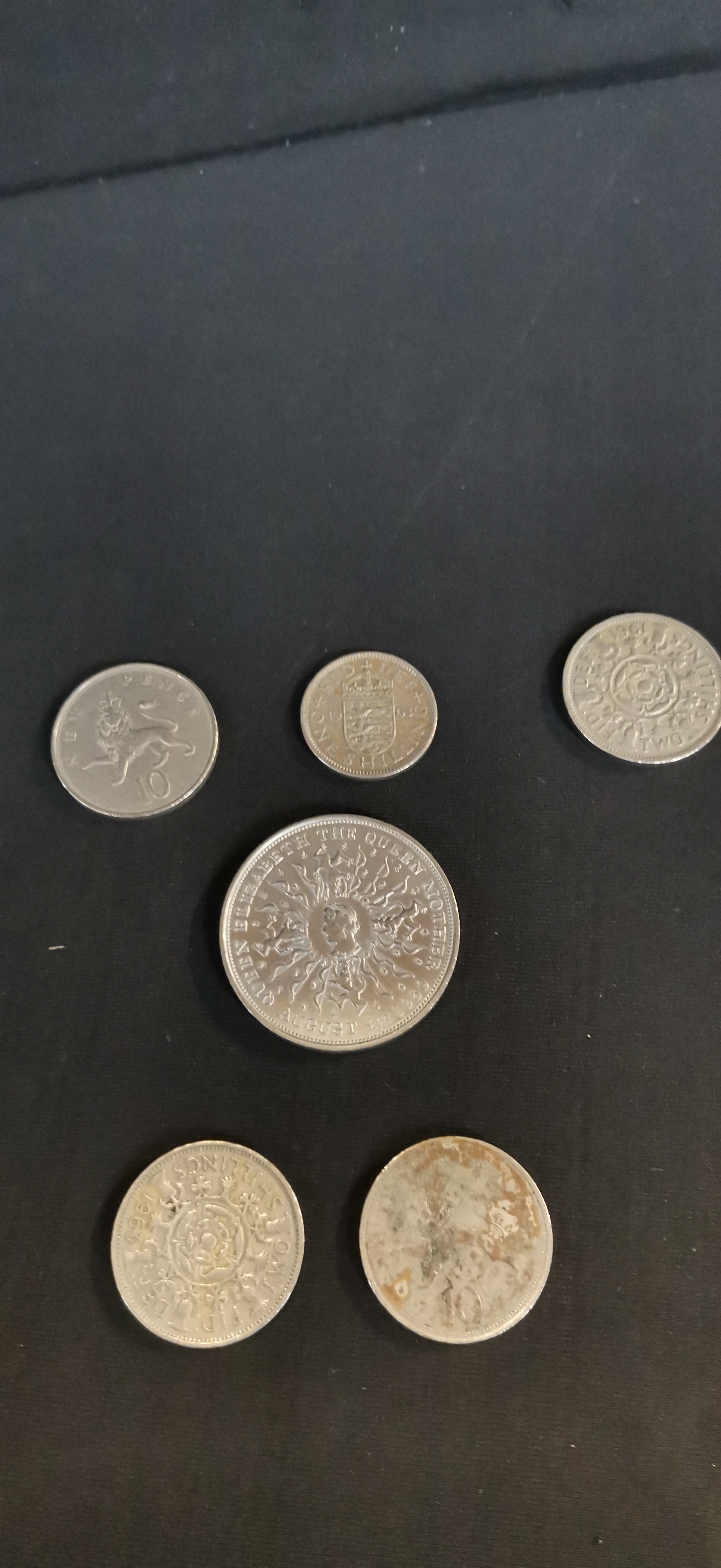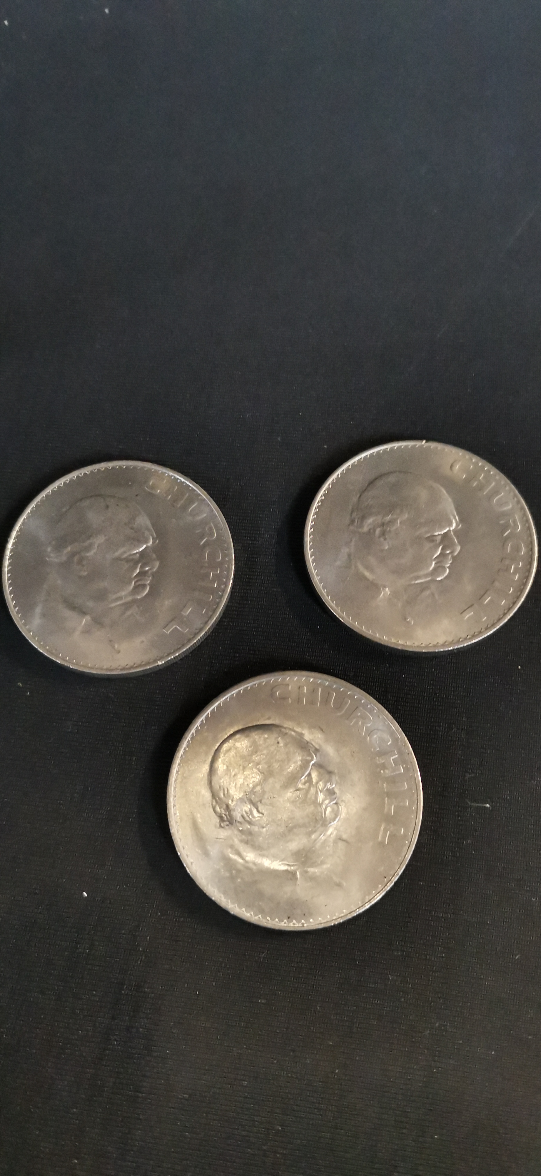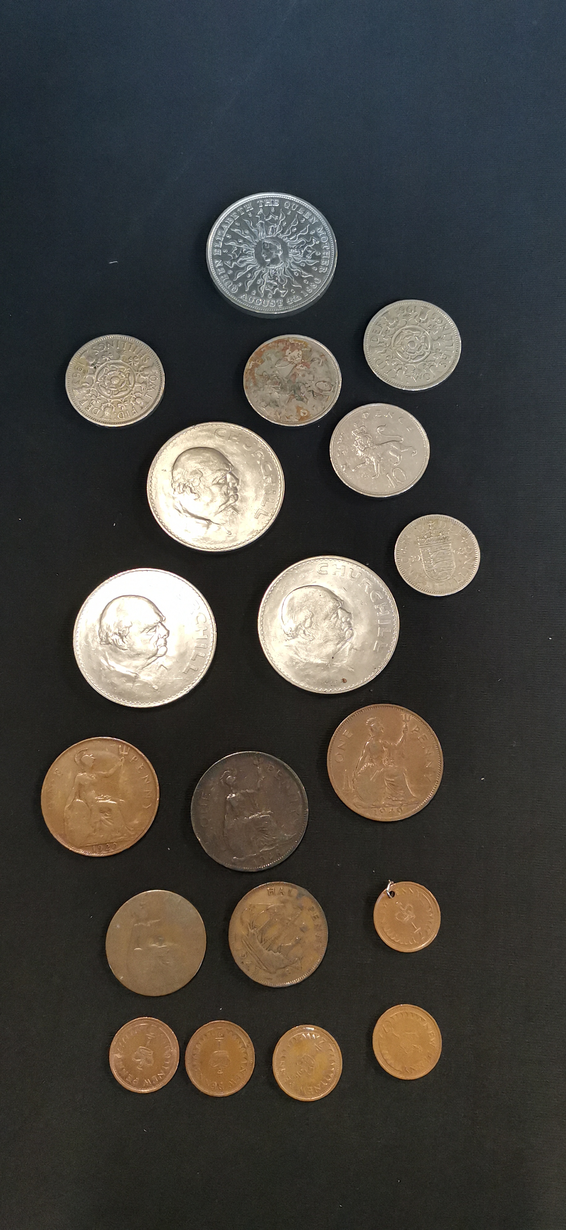 A collection of silver-coloured and copper-toned British and Commonwealth coins featuring commemorative Churchill crowns, a 1980 Queen Mother coin, and various denominations including pennies, shillings, and new pence.