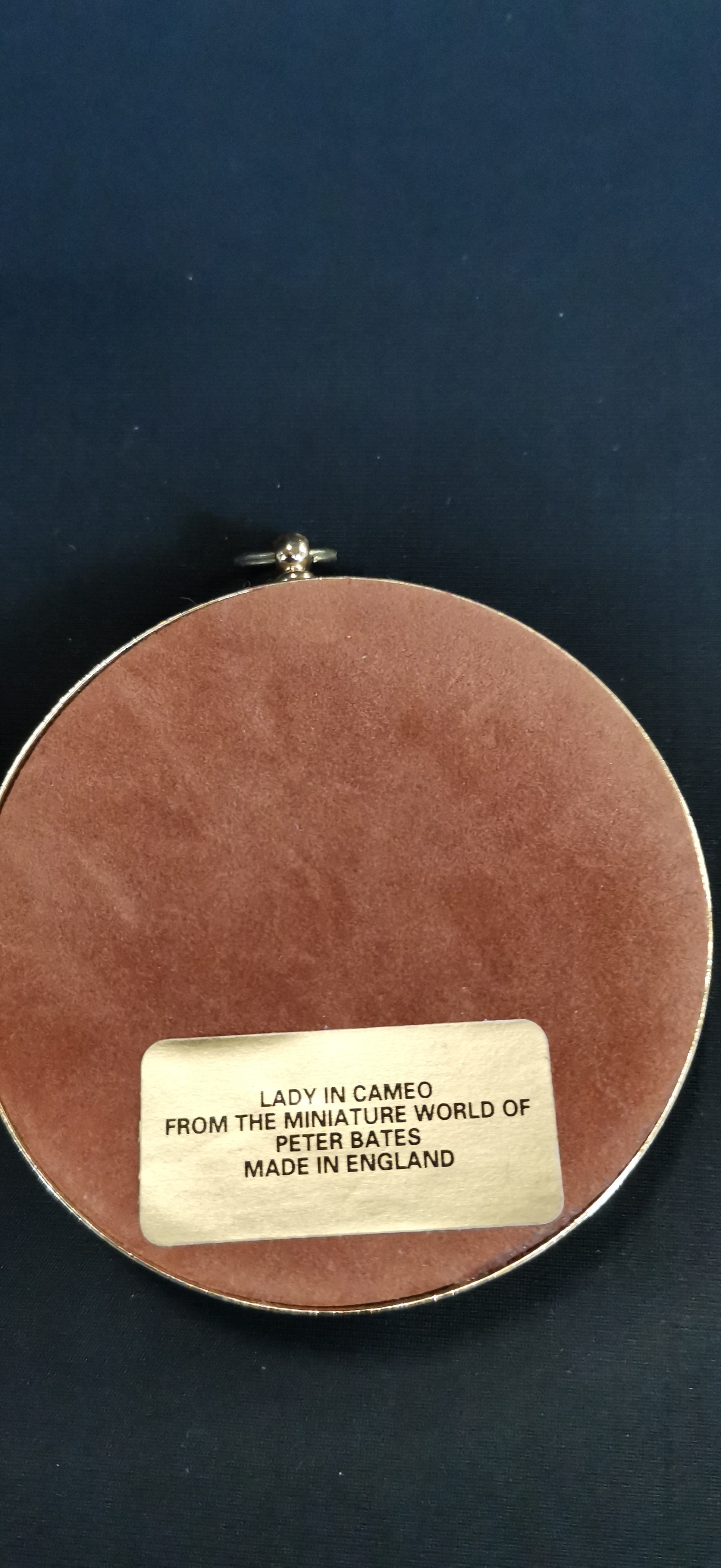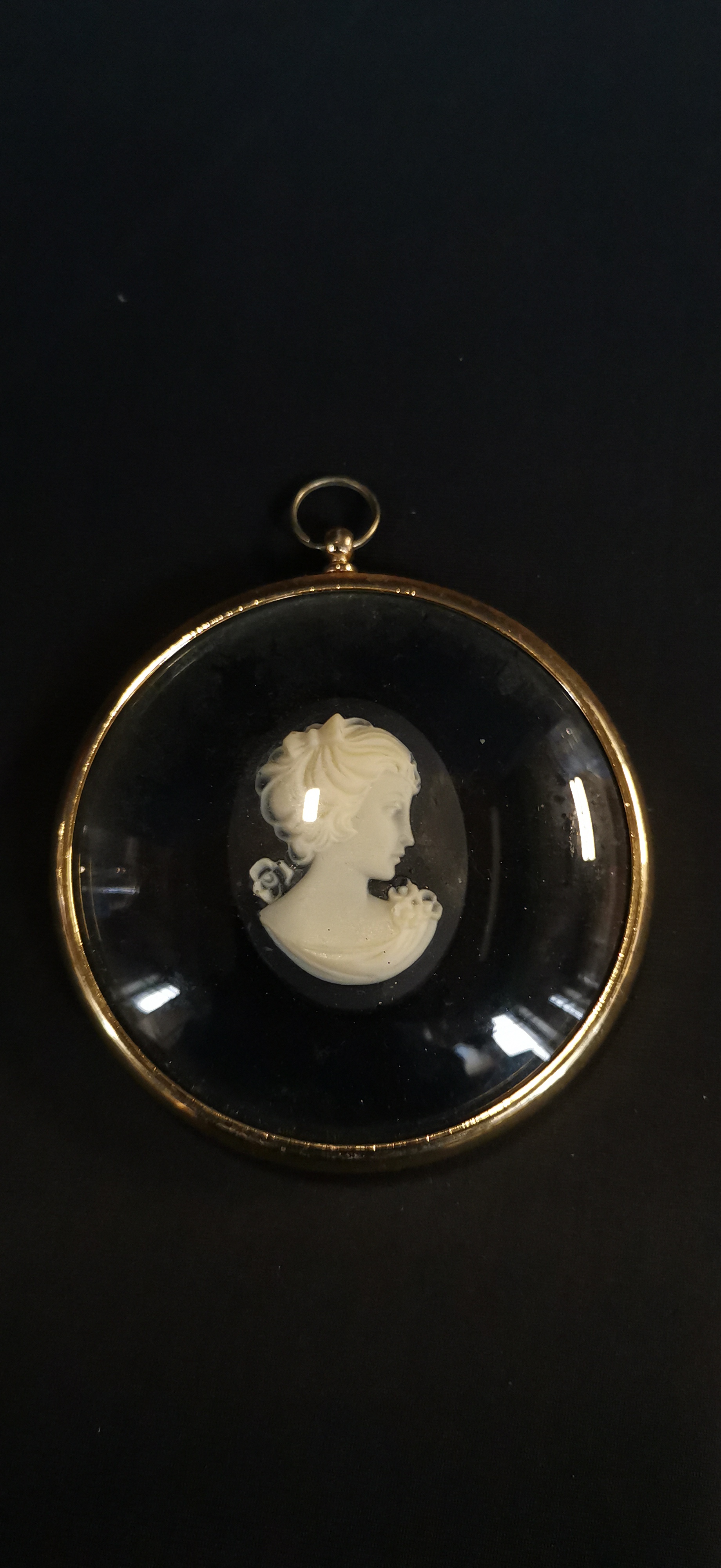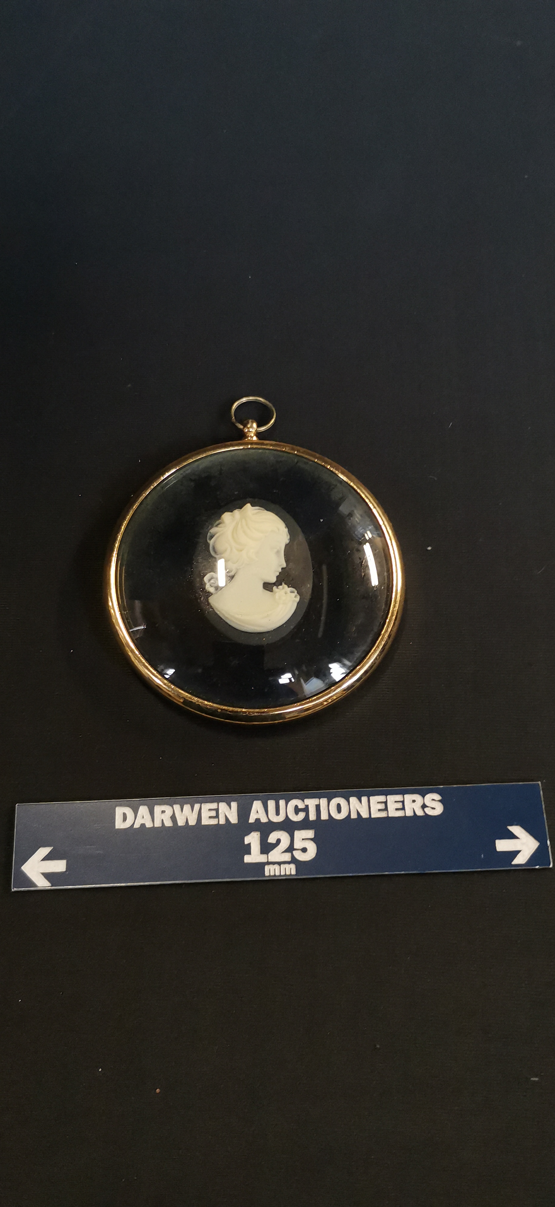 A circular framed miniature cameo featuring a white profile of a lady on a black ground, measuring approximately 65 mm in diameter.
