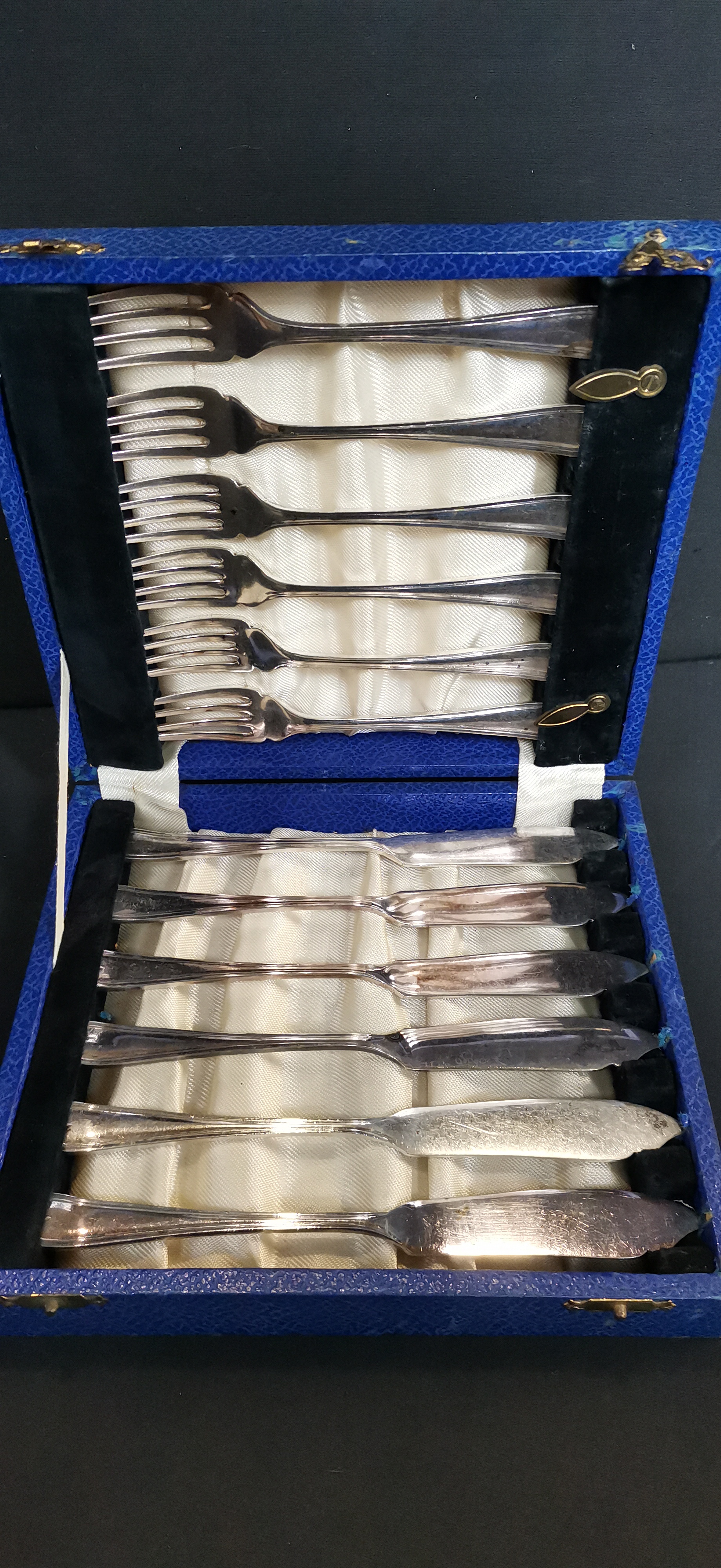 A collection of silverplate forks and knives marked EPNS, presented in a blue case with a cream-coloured lining.