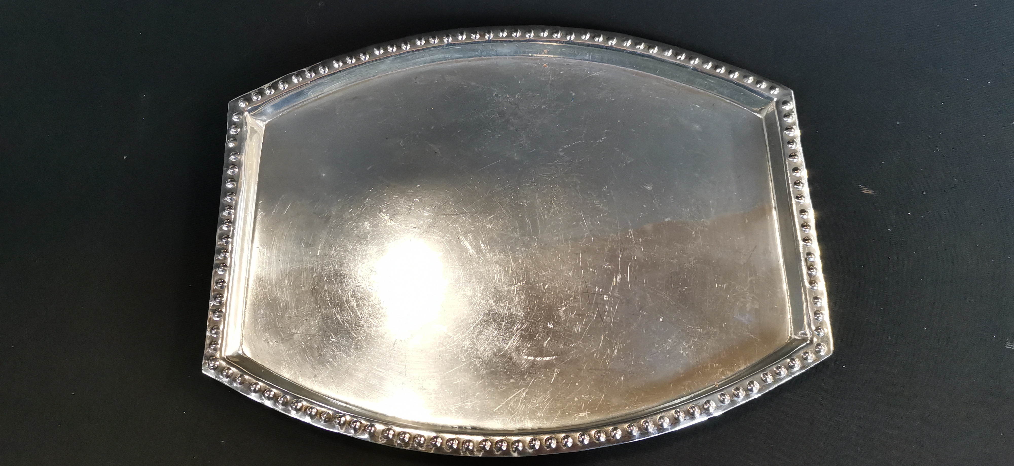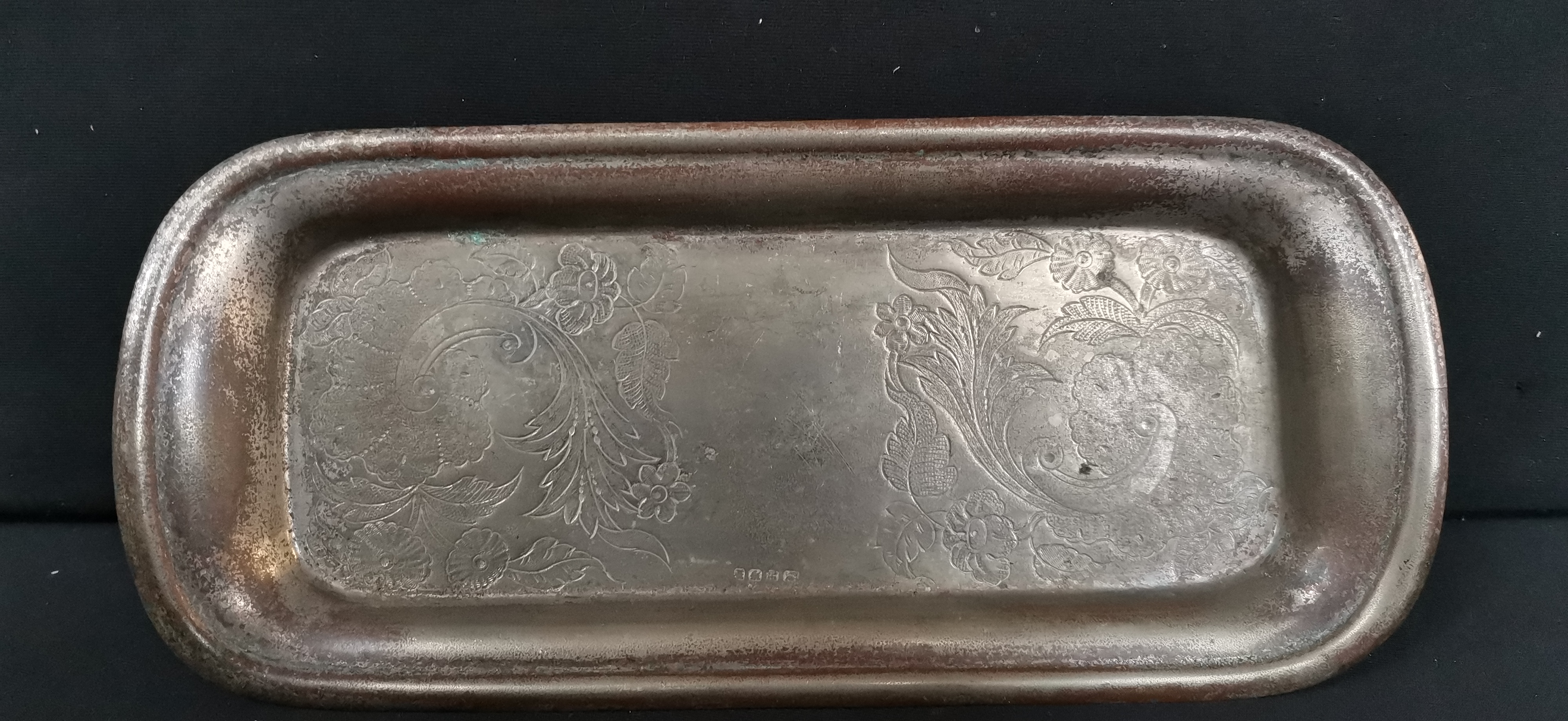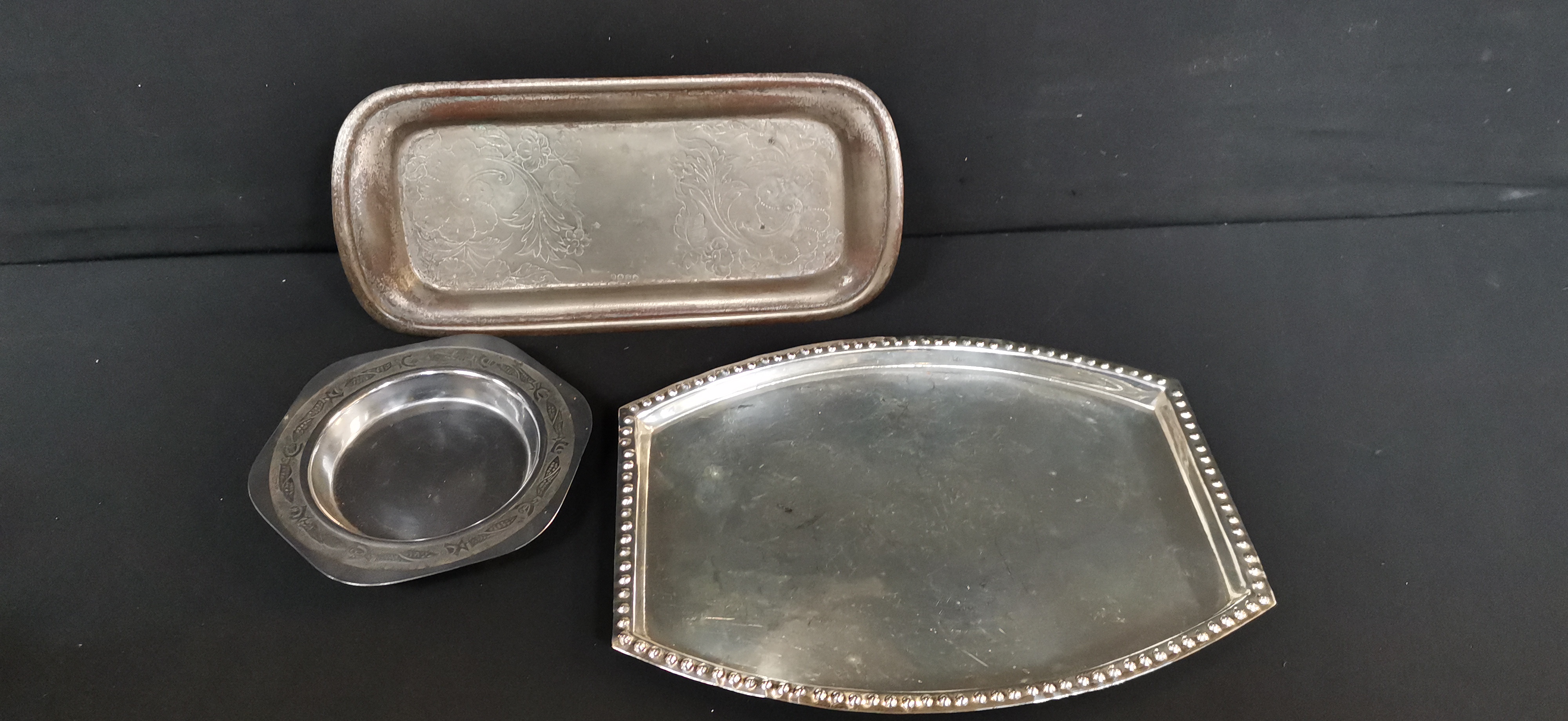 A trio of silver-toned metal items comprising two serving trays and a small dish, including a rectangular engraved tray featuring hallmarks for a silver Plated tray