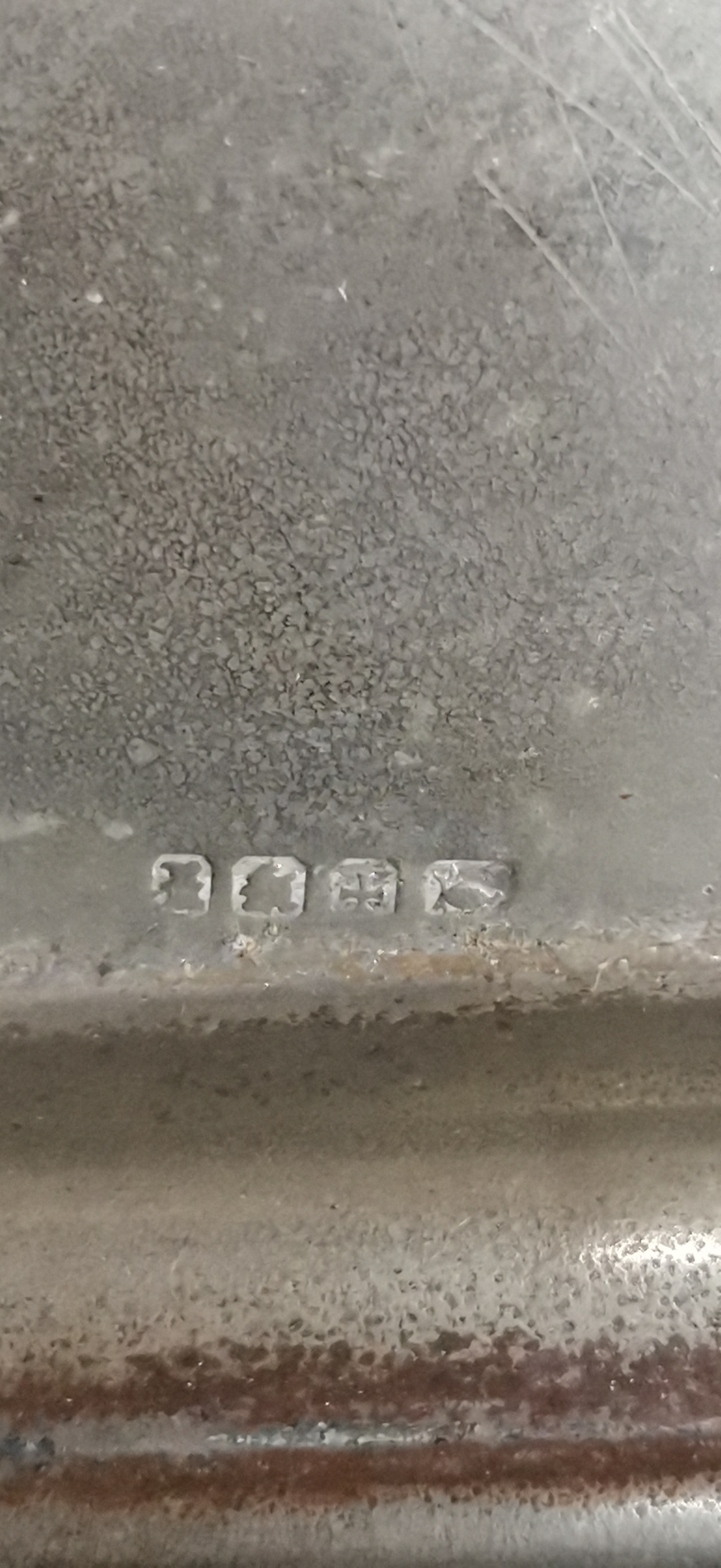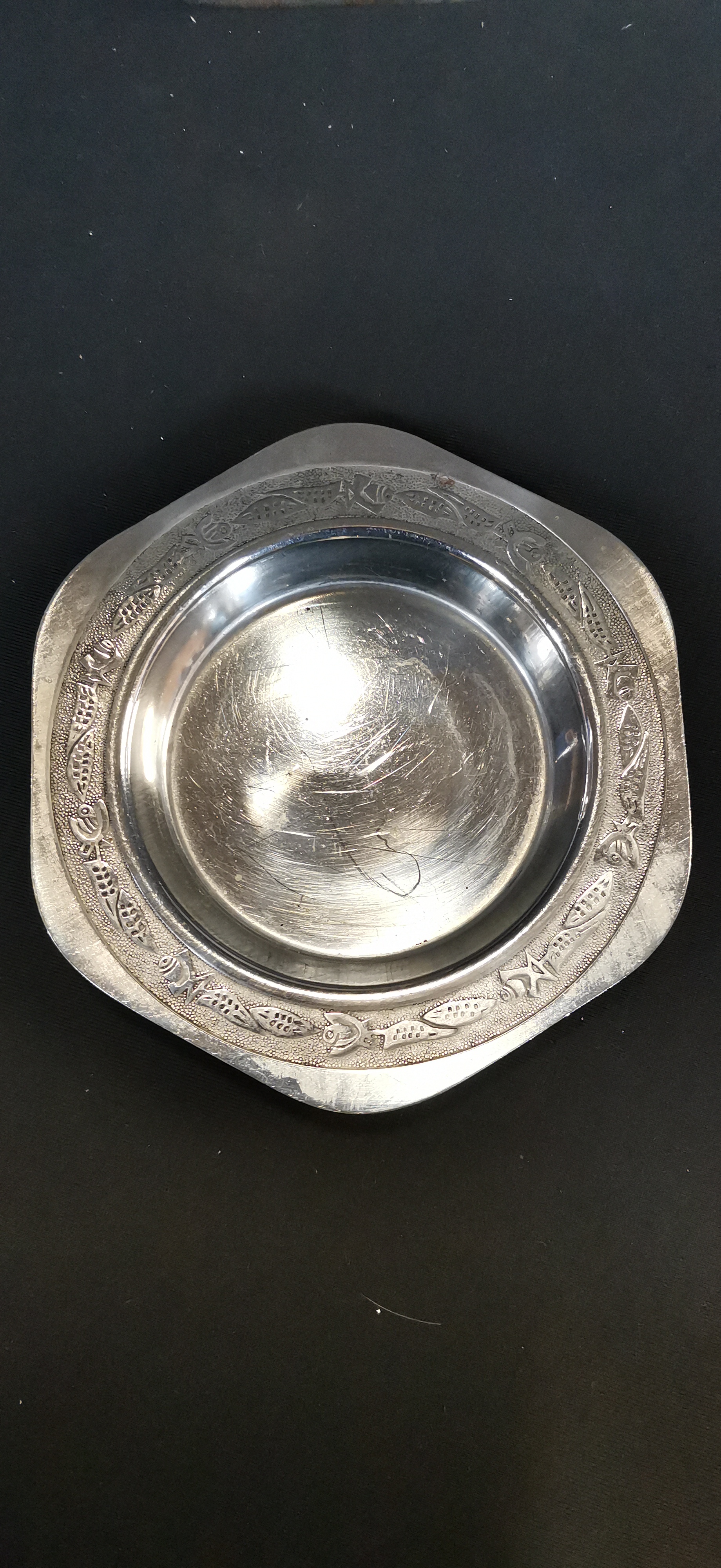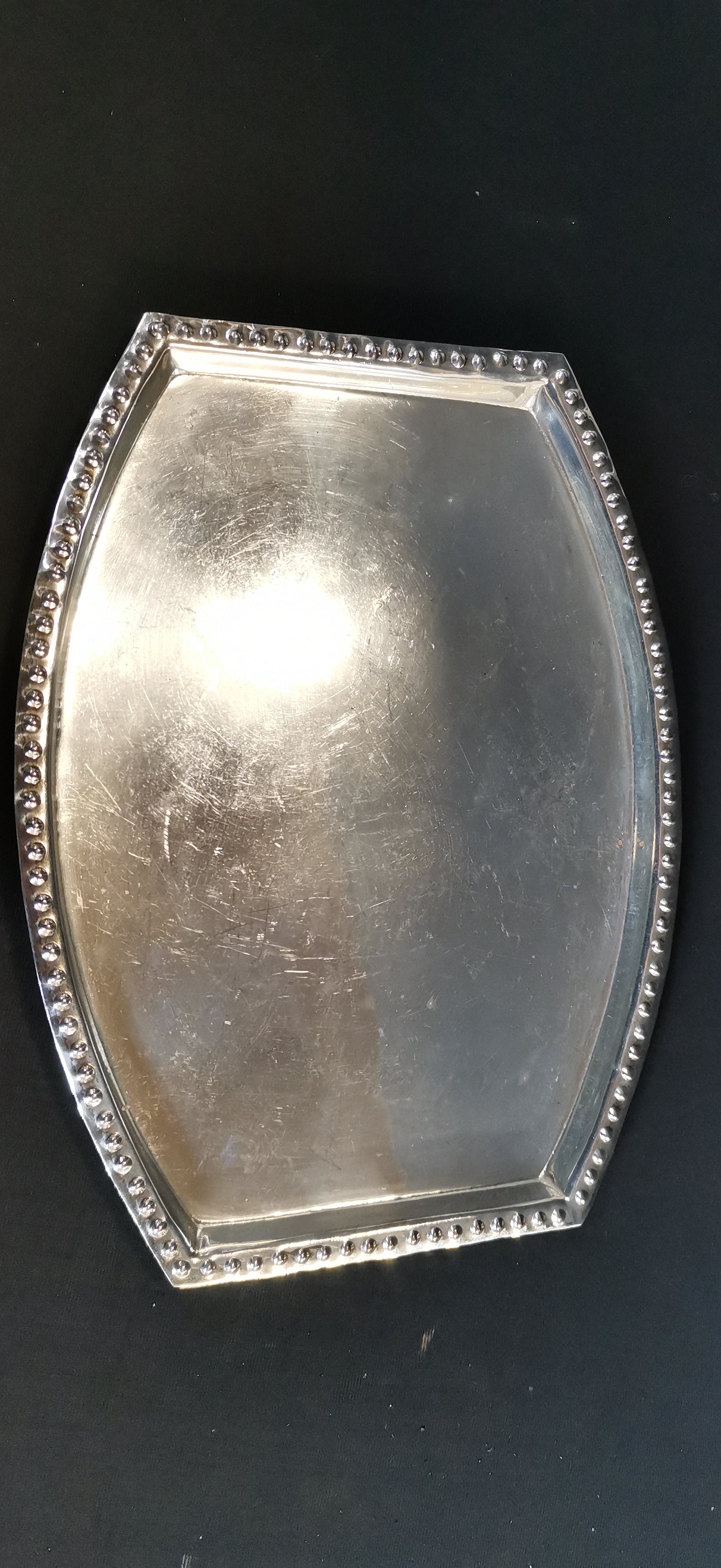 A trio of silver-toned metal items comprising two serving trays and a small dish, including a rectangular engraved tray featuring hallmarks for a silver Plated tray