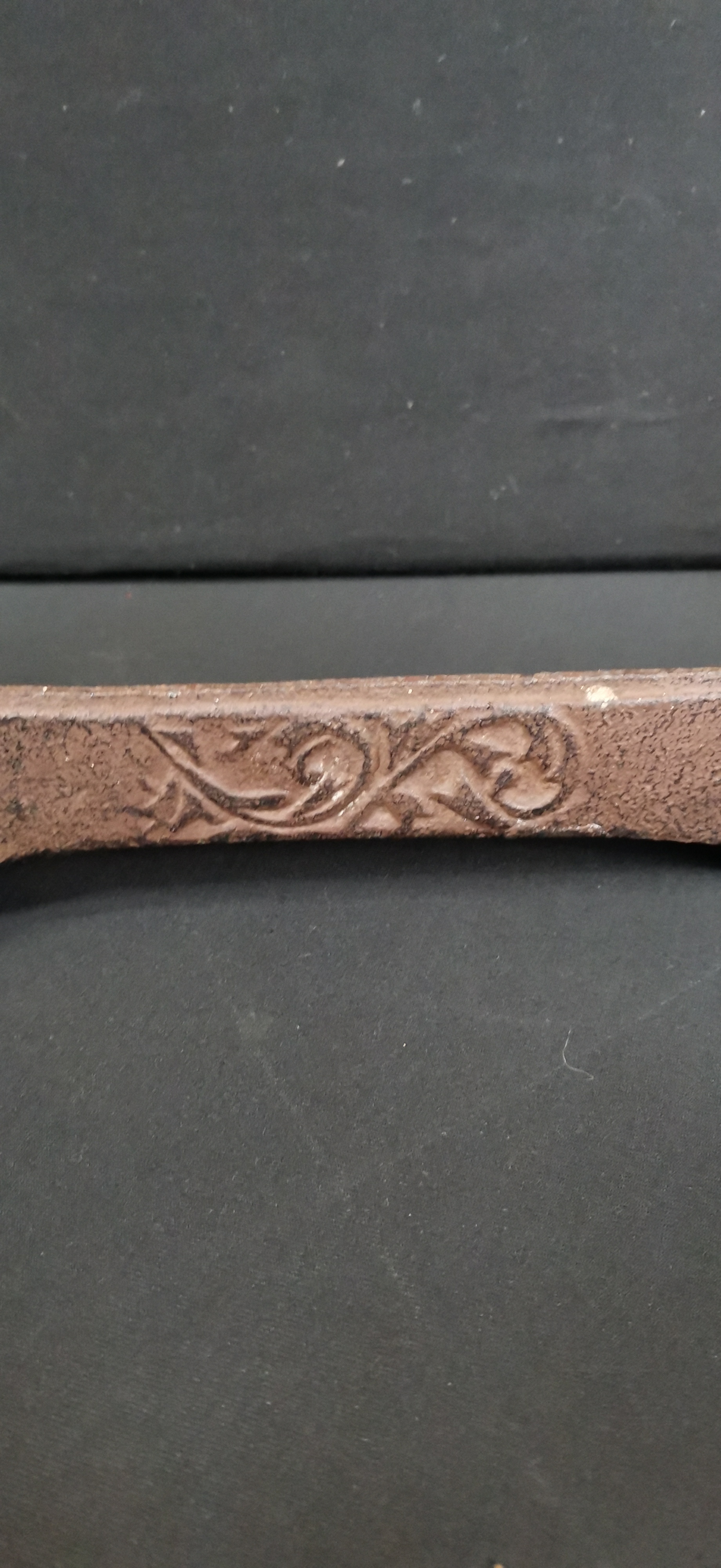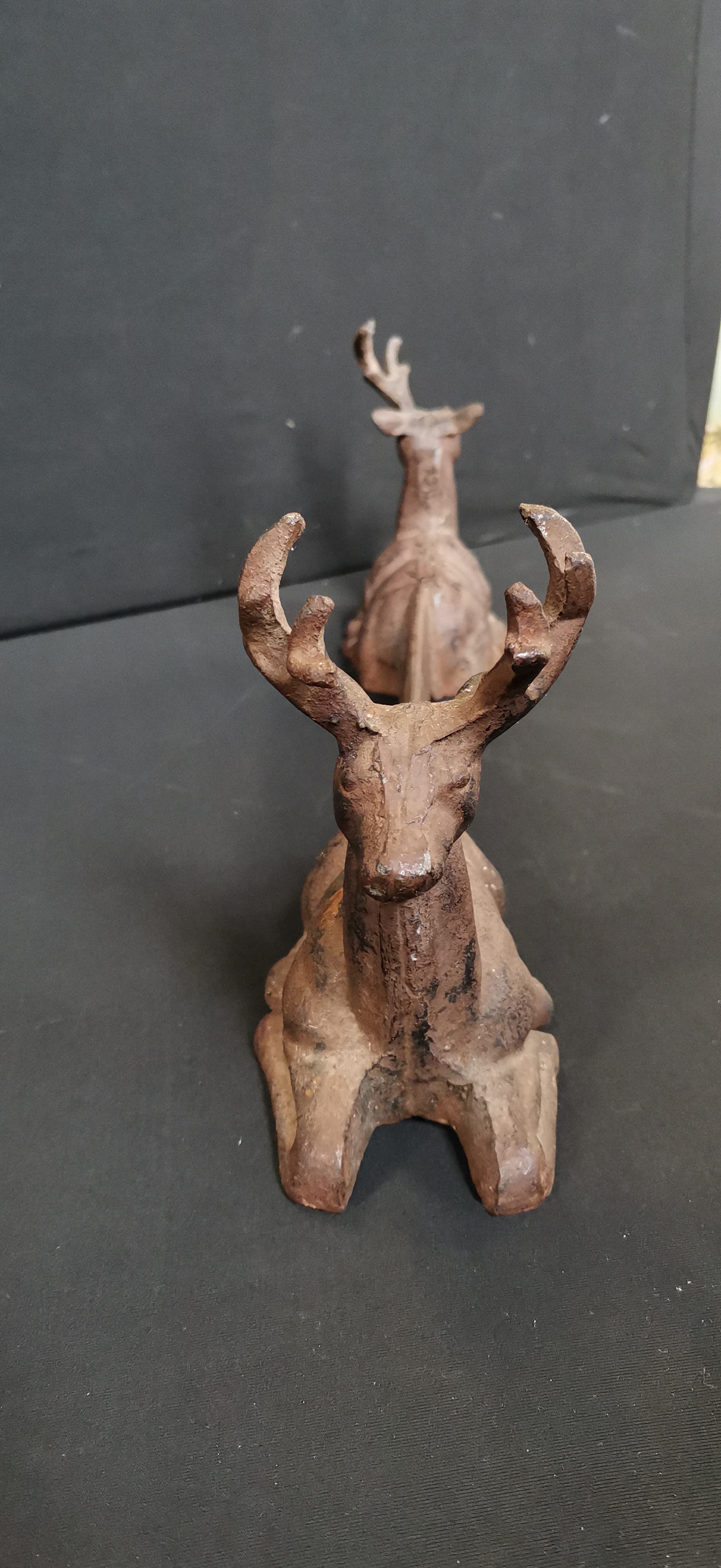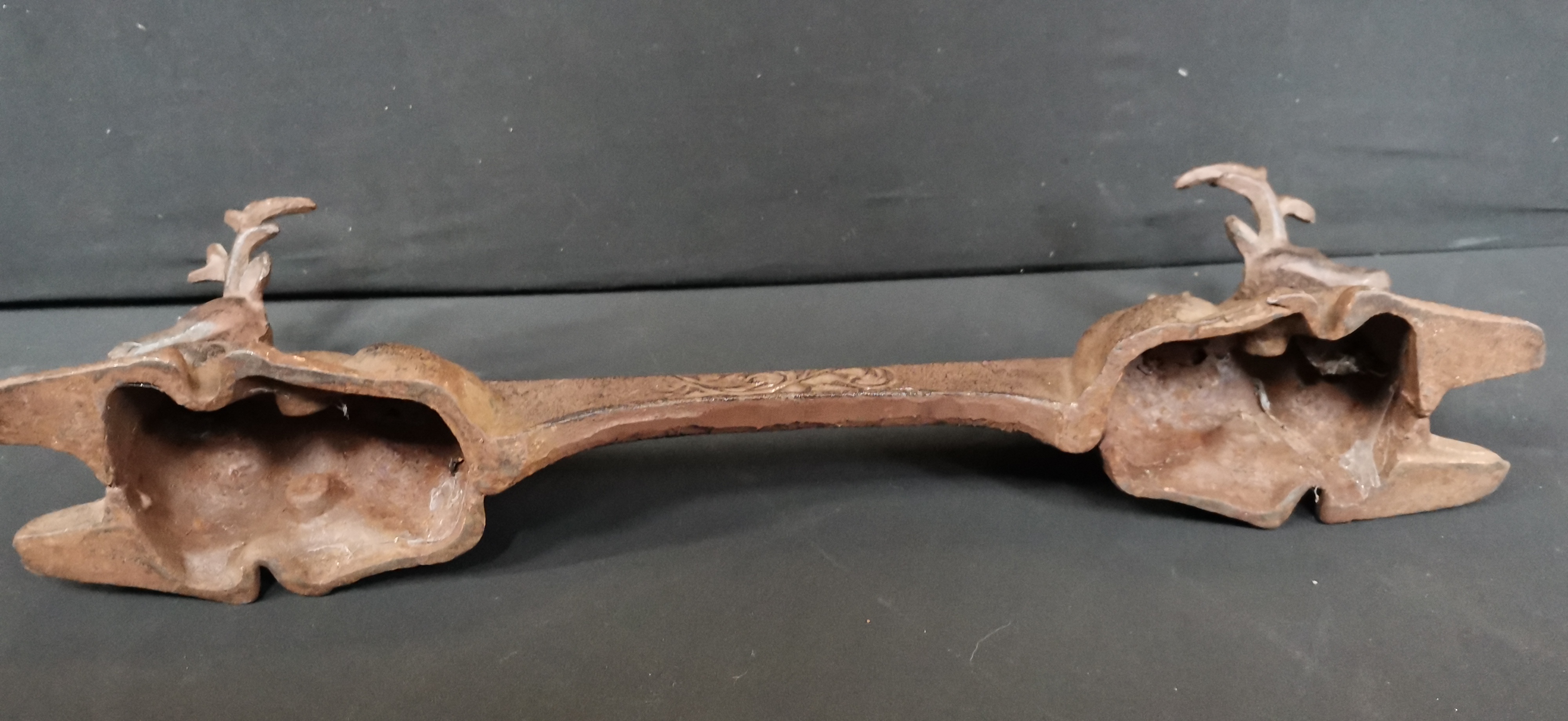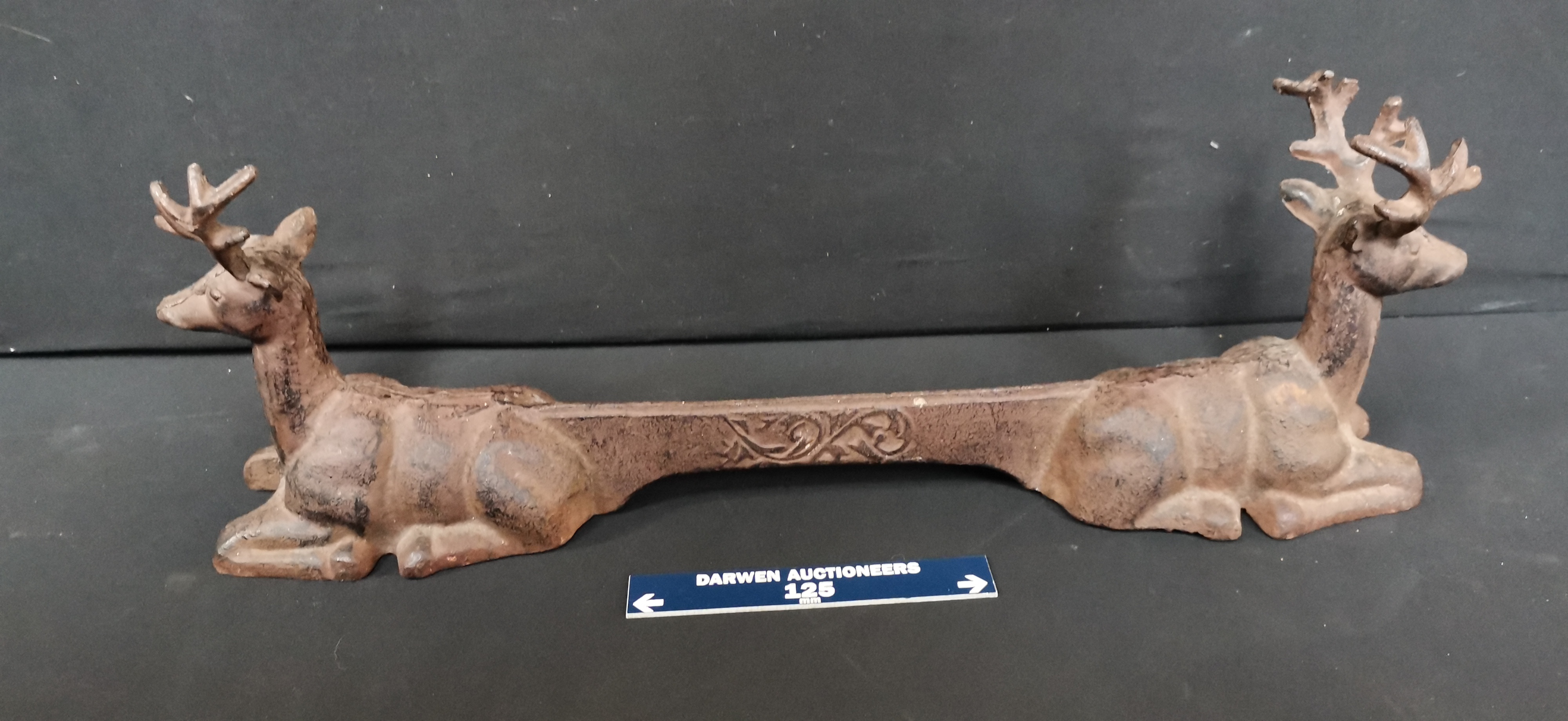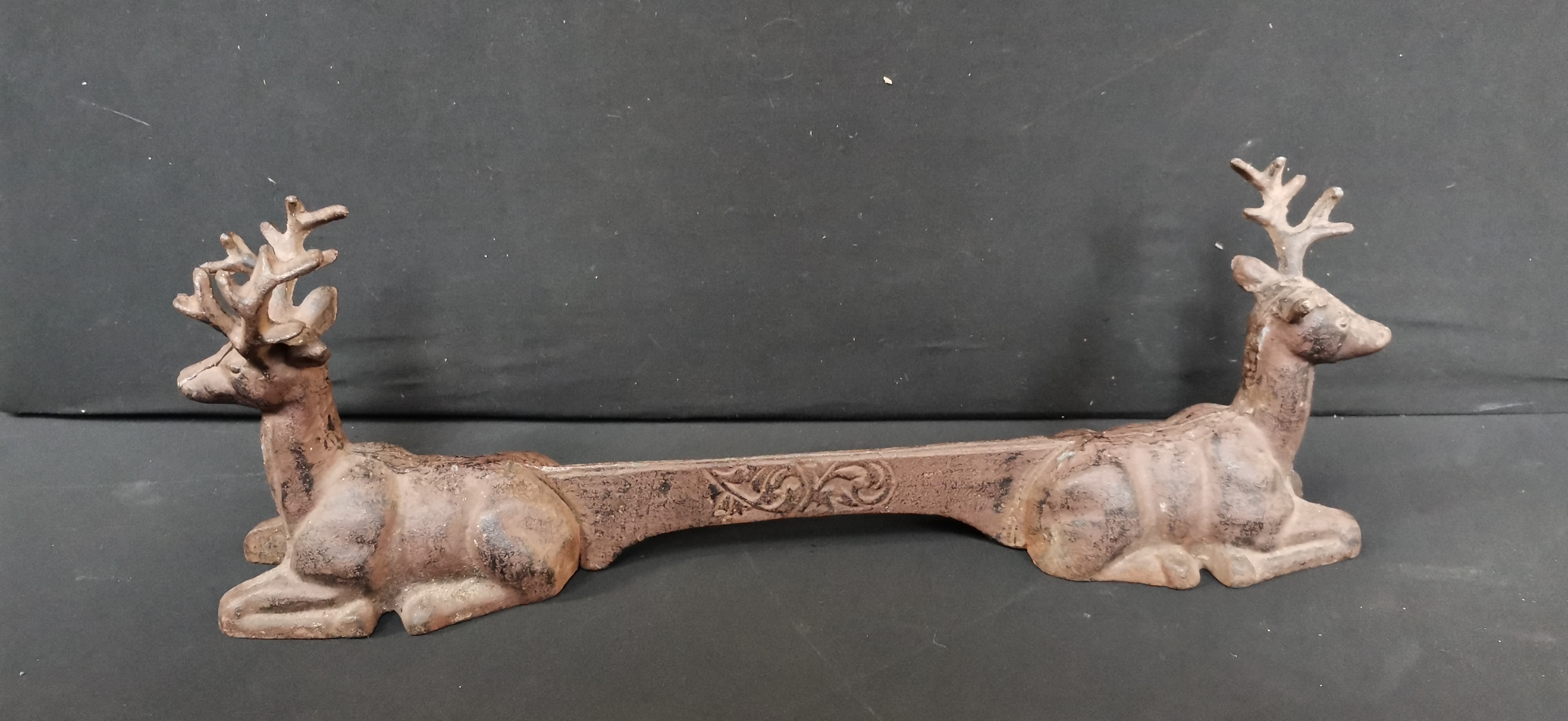 A brown cast iron decorative architectural or fireplace piece featuring two reclining stags connected by a bar with a raised ornate scrollwork design, measuring approximately 440mm in length.