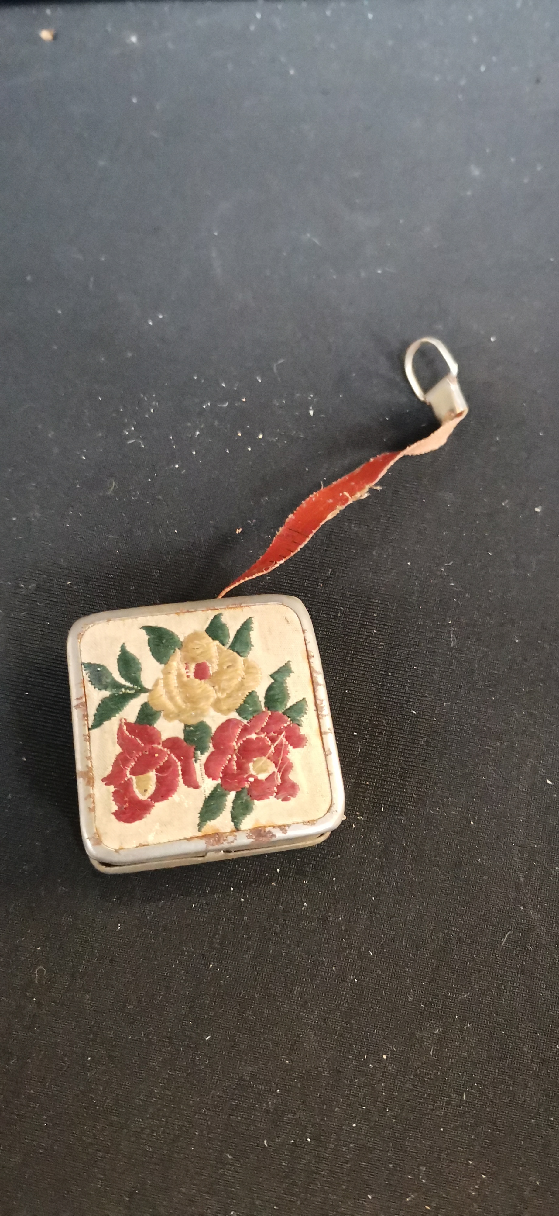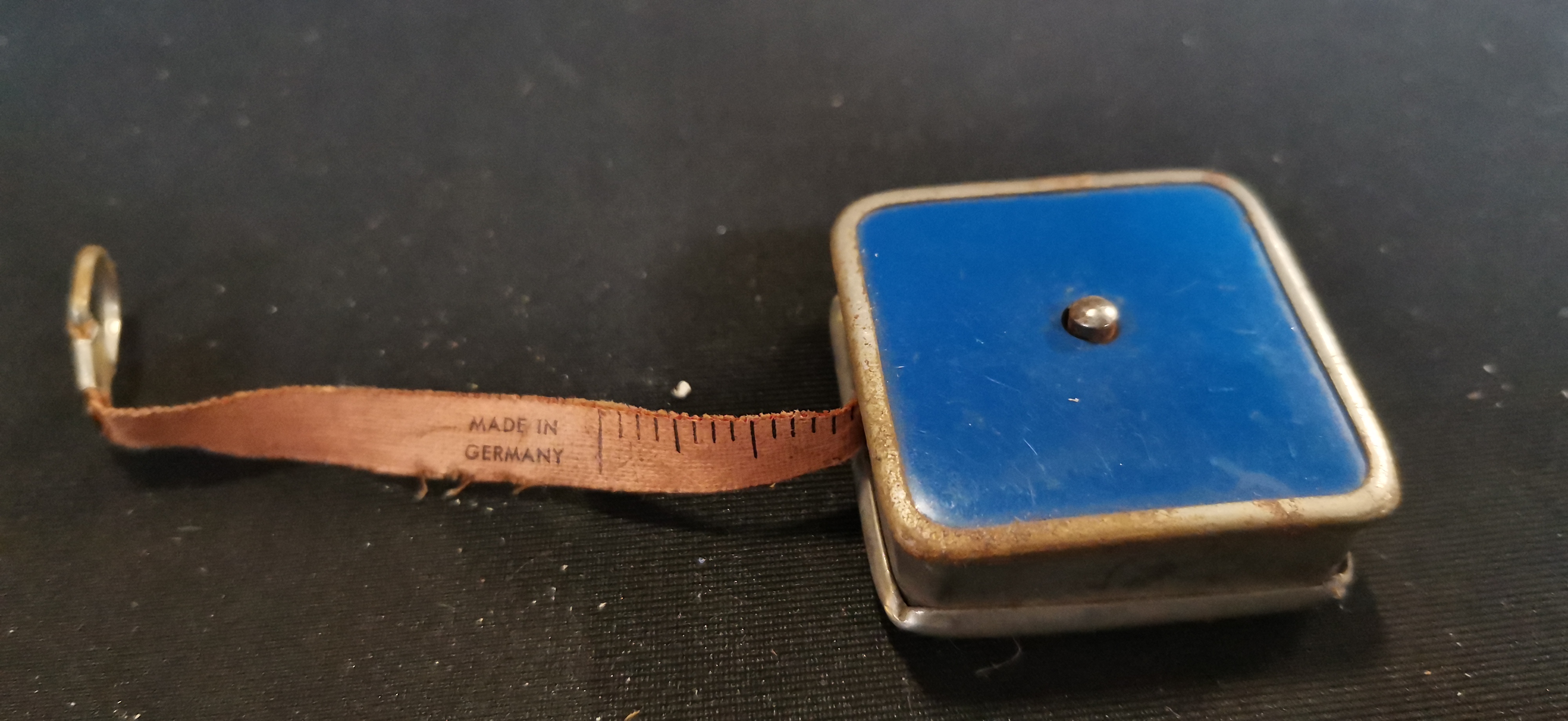 A vintage square retractable tape measure featuring a multi-coloured floral motif on one side and a blue panel on the reverse, with a fabric tape marked Made in Germany.