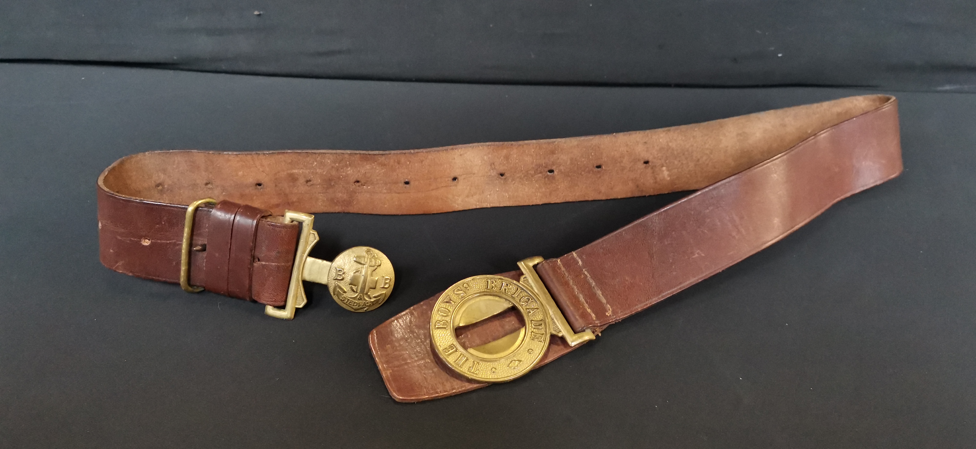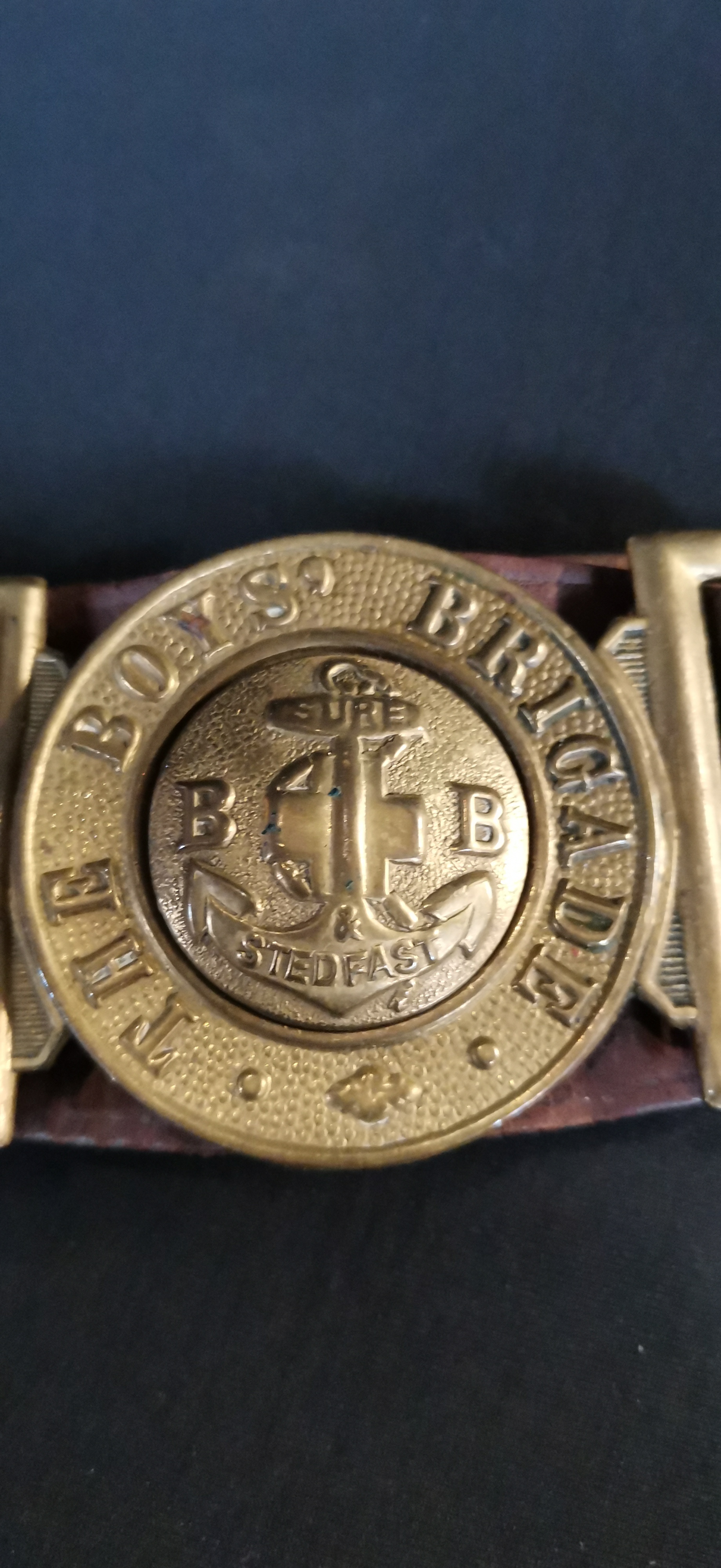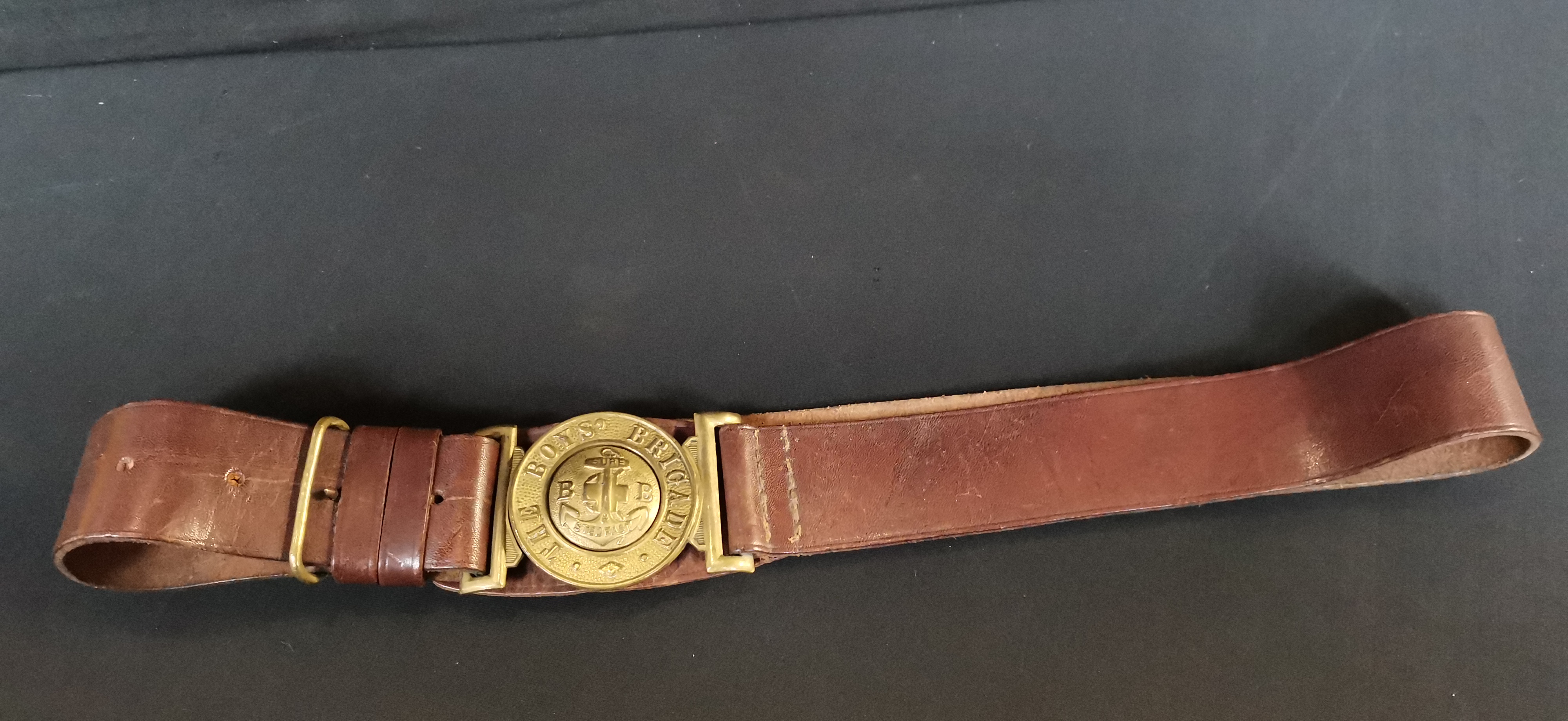 A brown leather belt featuring a circular brass buckle embossed with The Boys Brigade emblem, anchor, and the motto Sure and Stedfast.