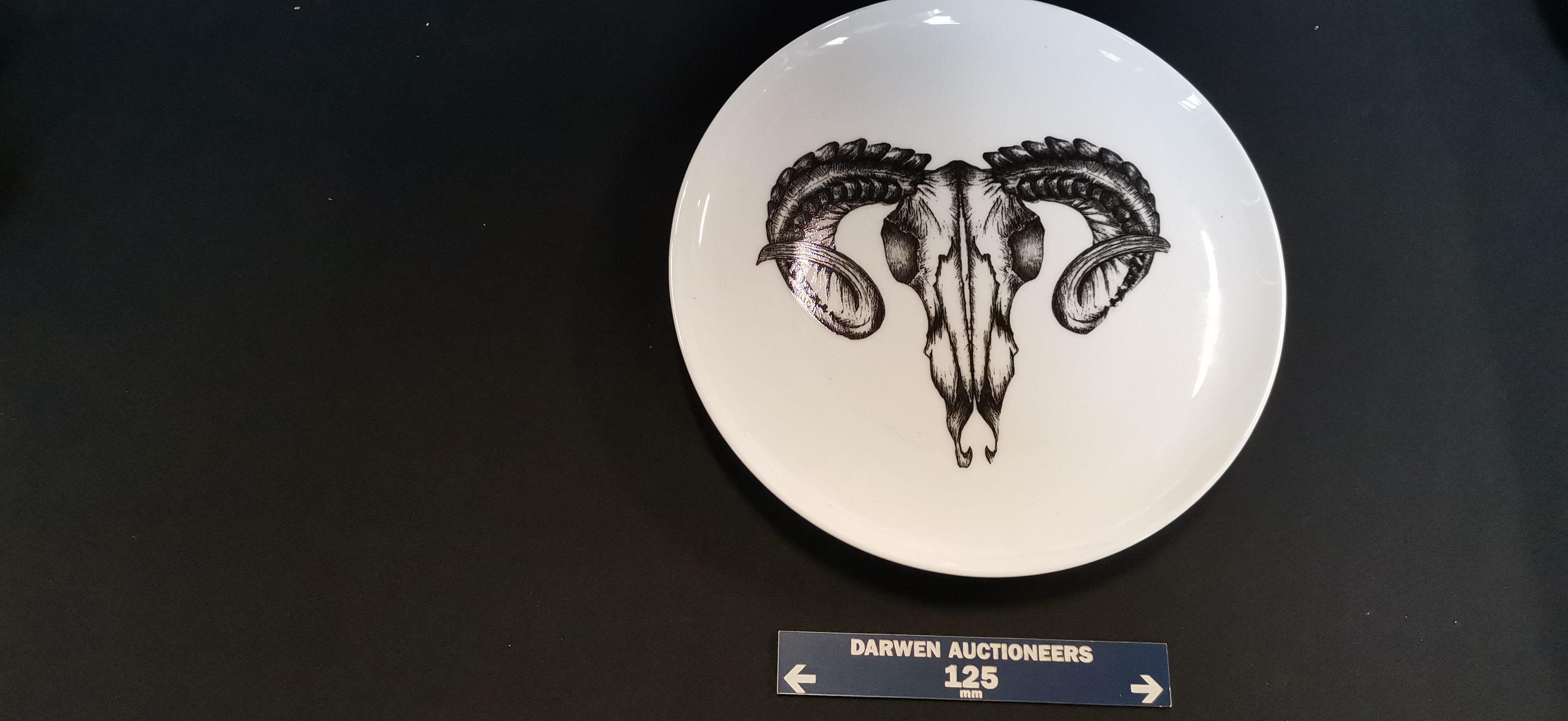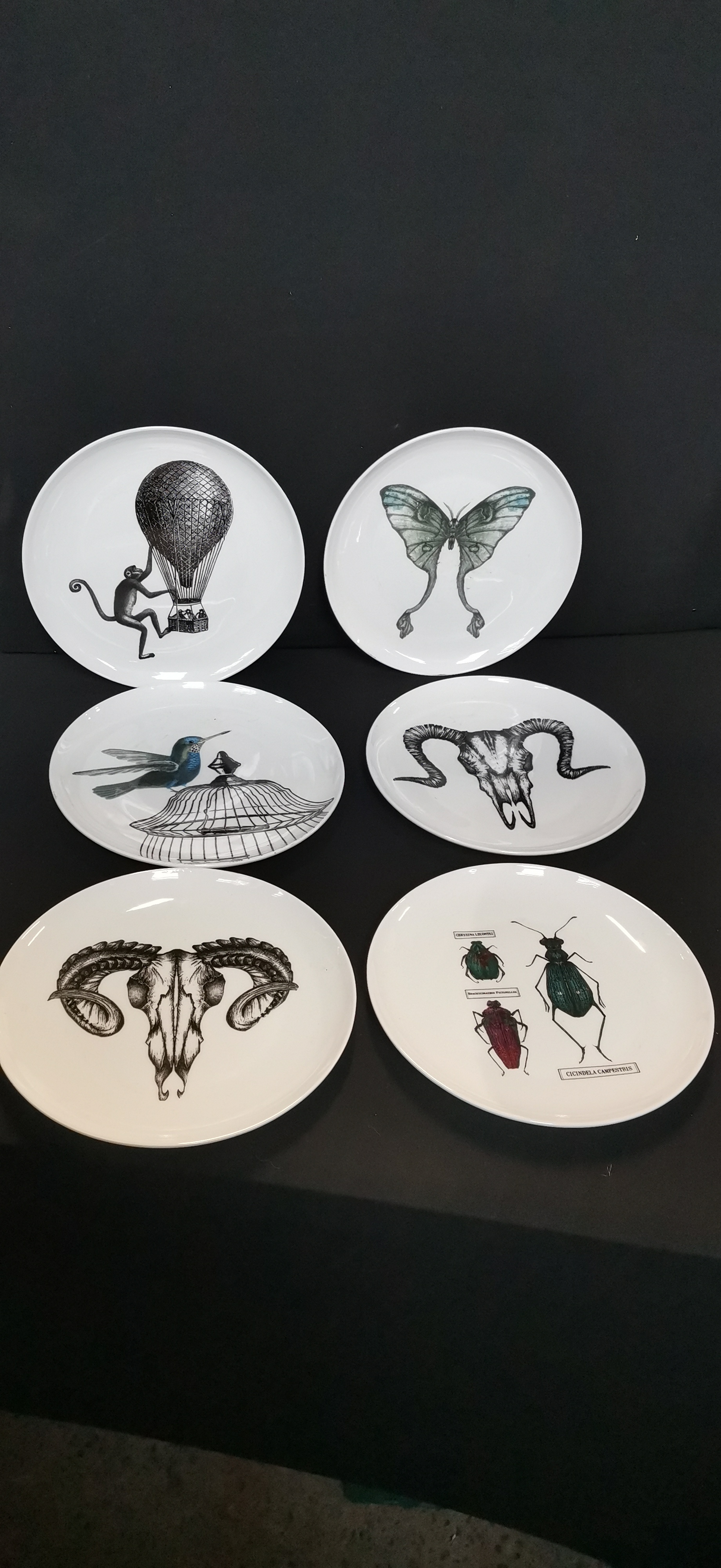 A collection of white ceramic plates featuring various natural history illustrations including insects, skulls, and animals, each measuring approximately 200mm in diameter.