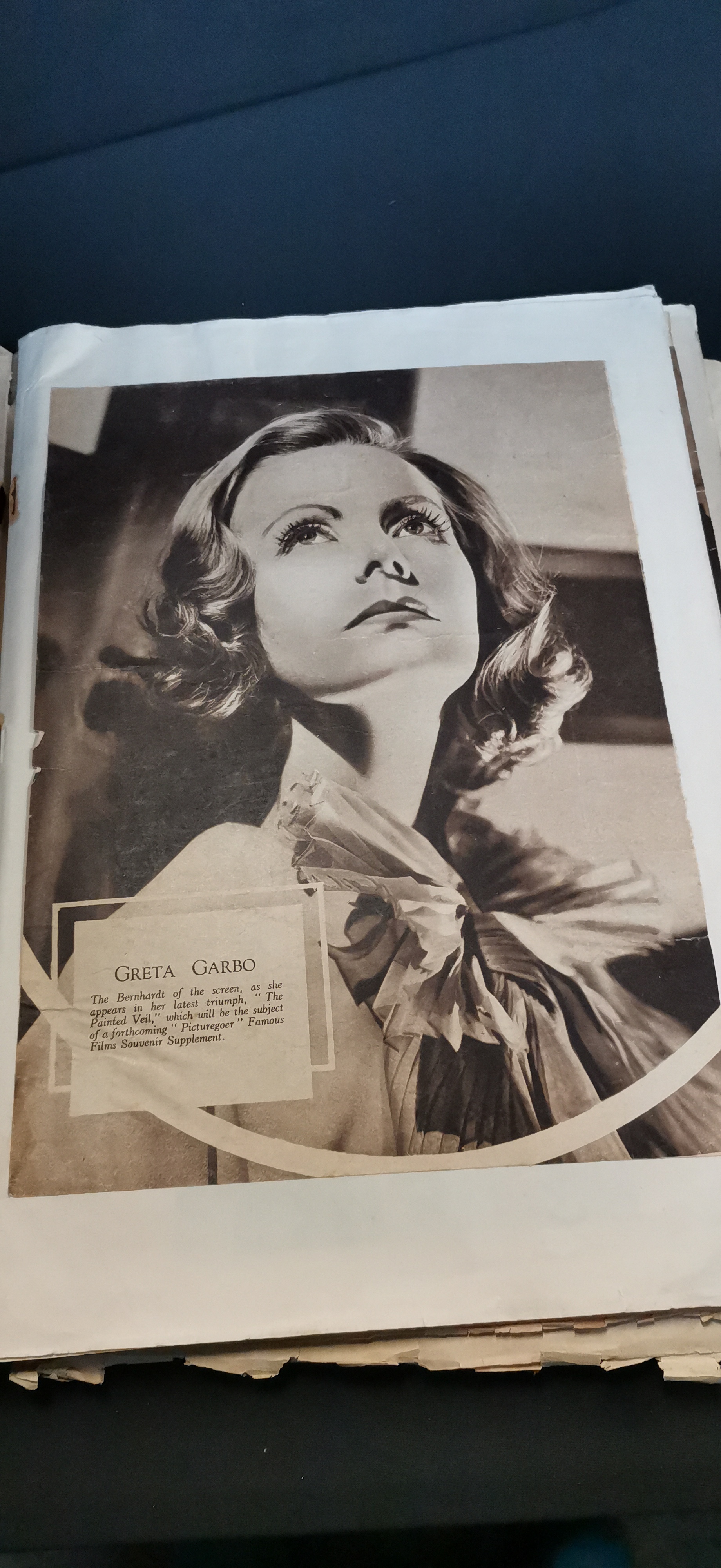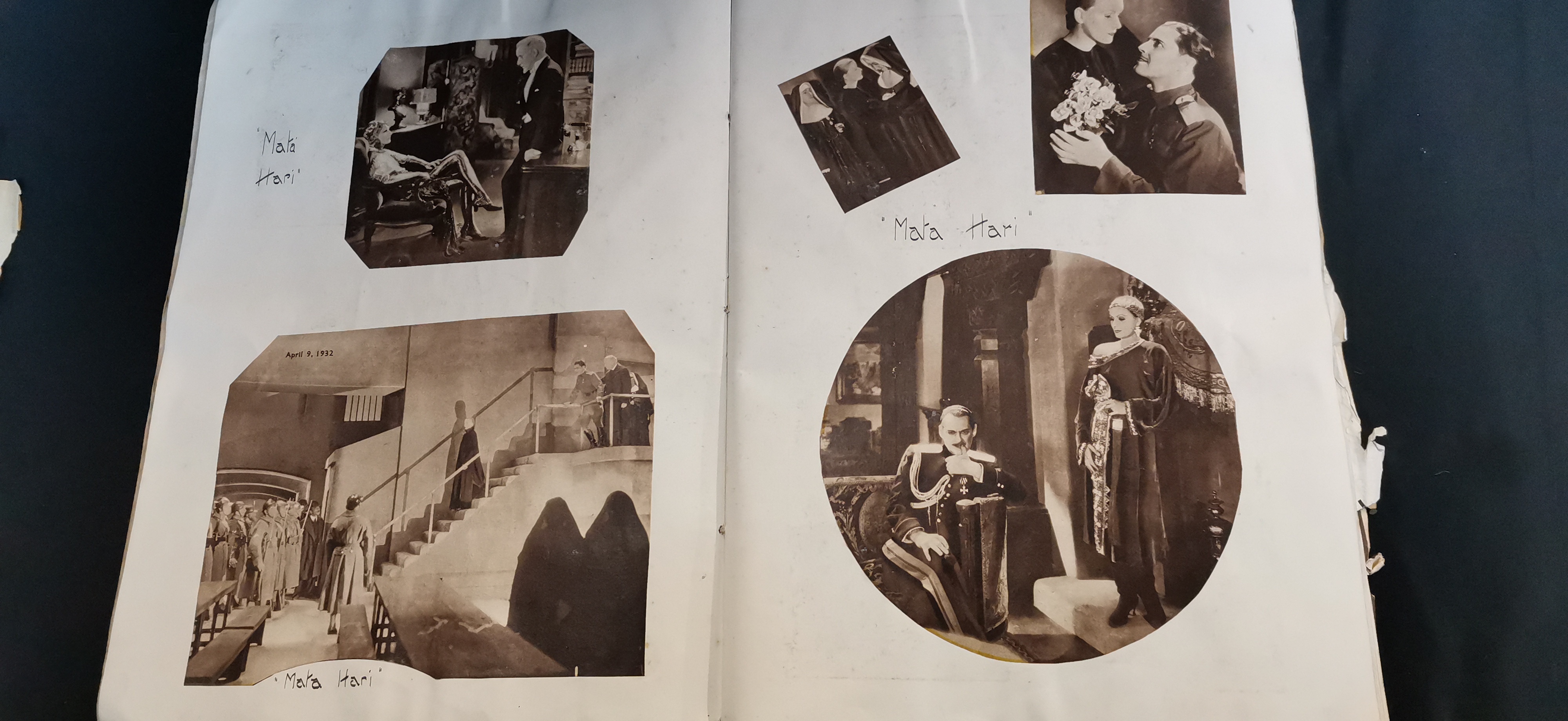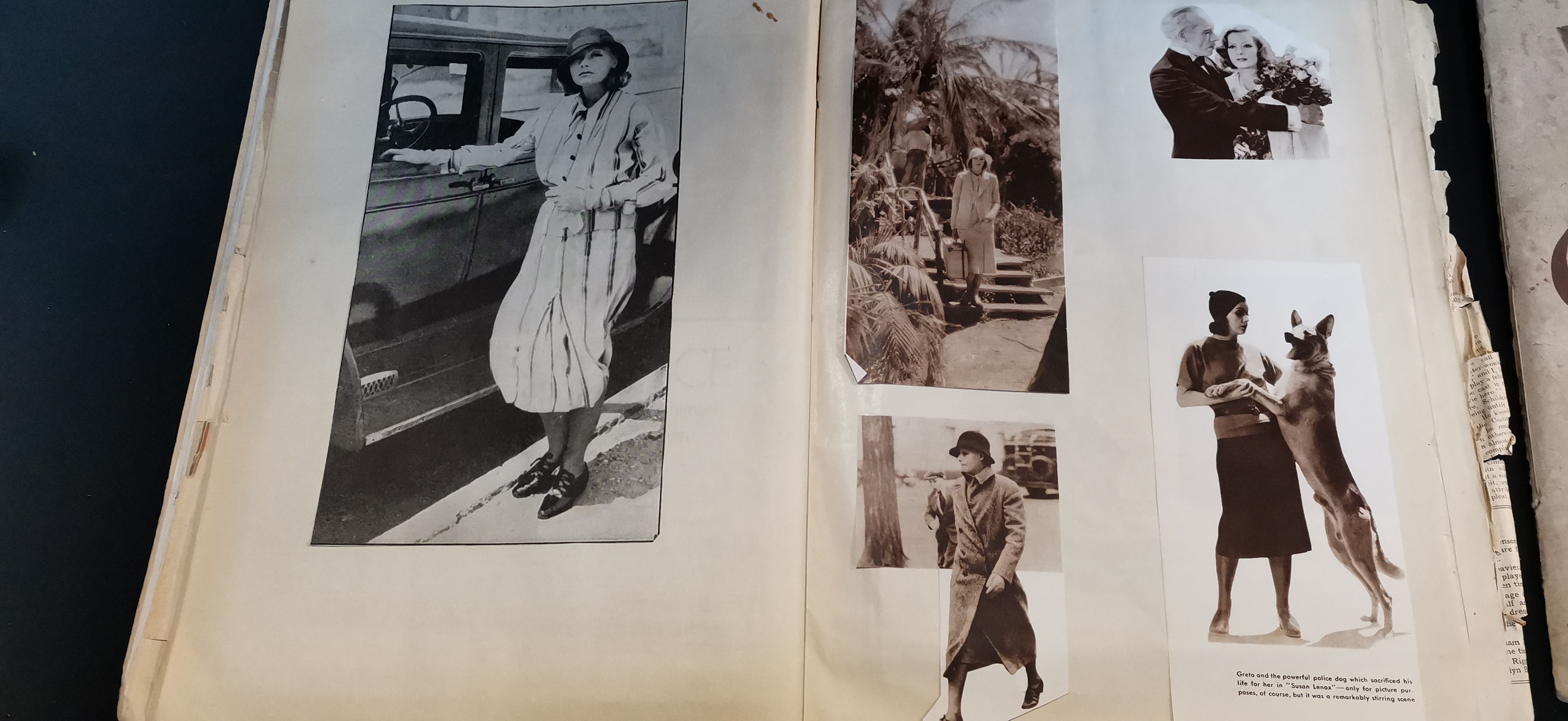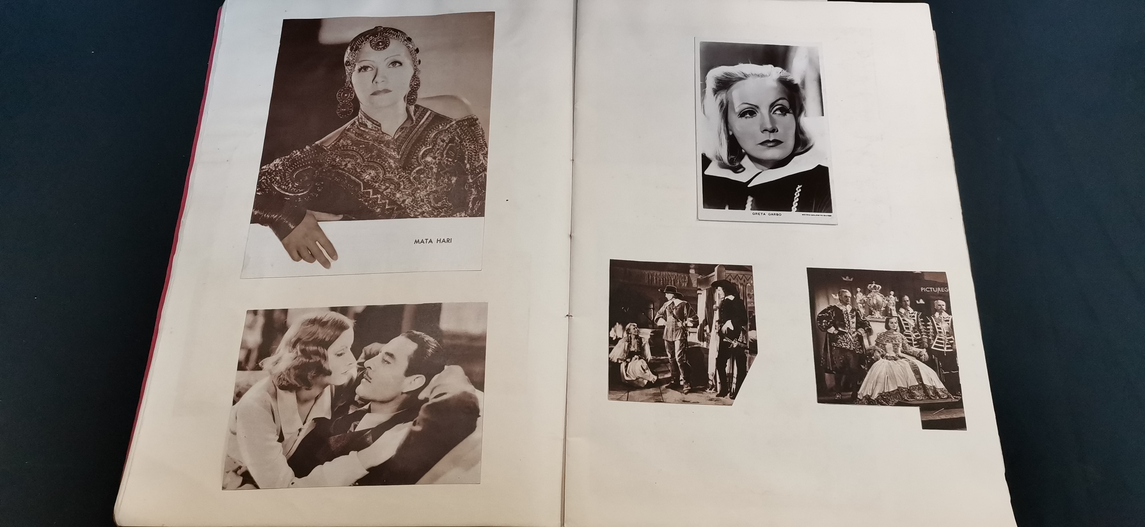A collection of vintage scrapbooks and ephemera featuring actress Greta Garbo, including cream and red covers with photographic portraits and various newspaper clippings.