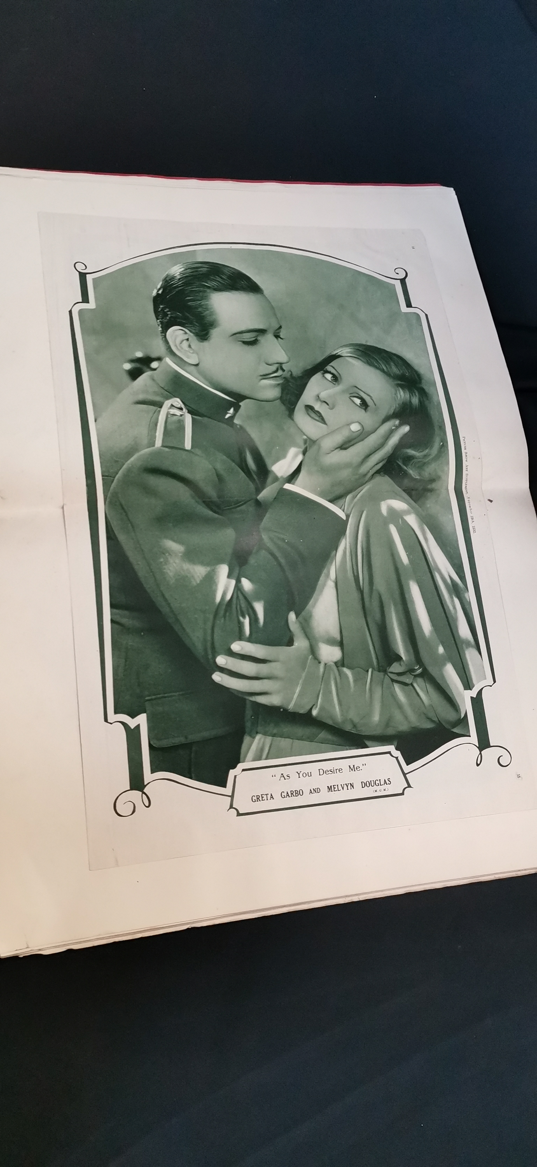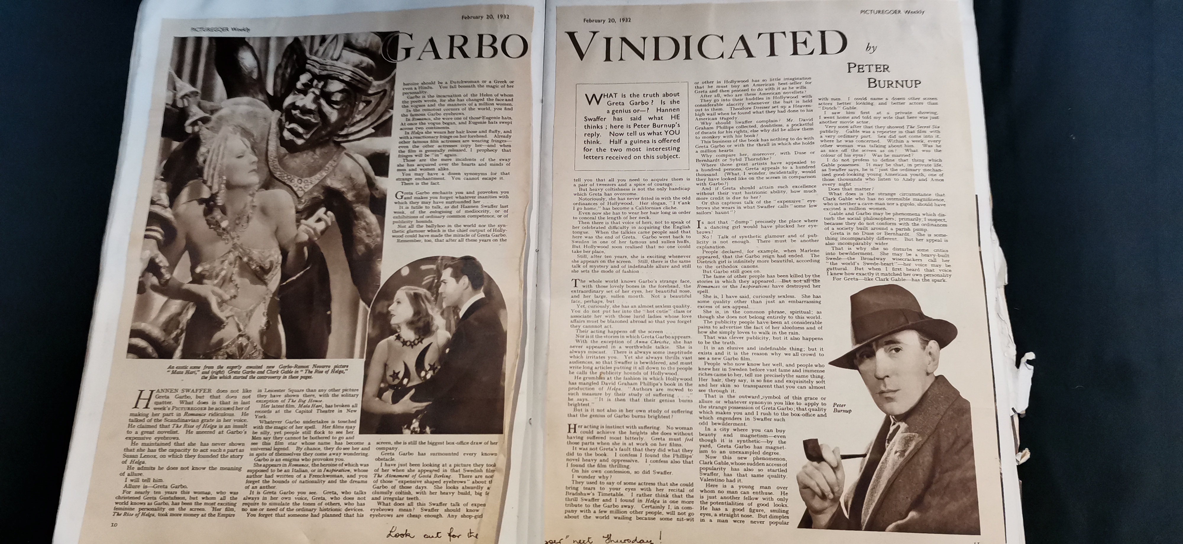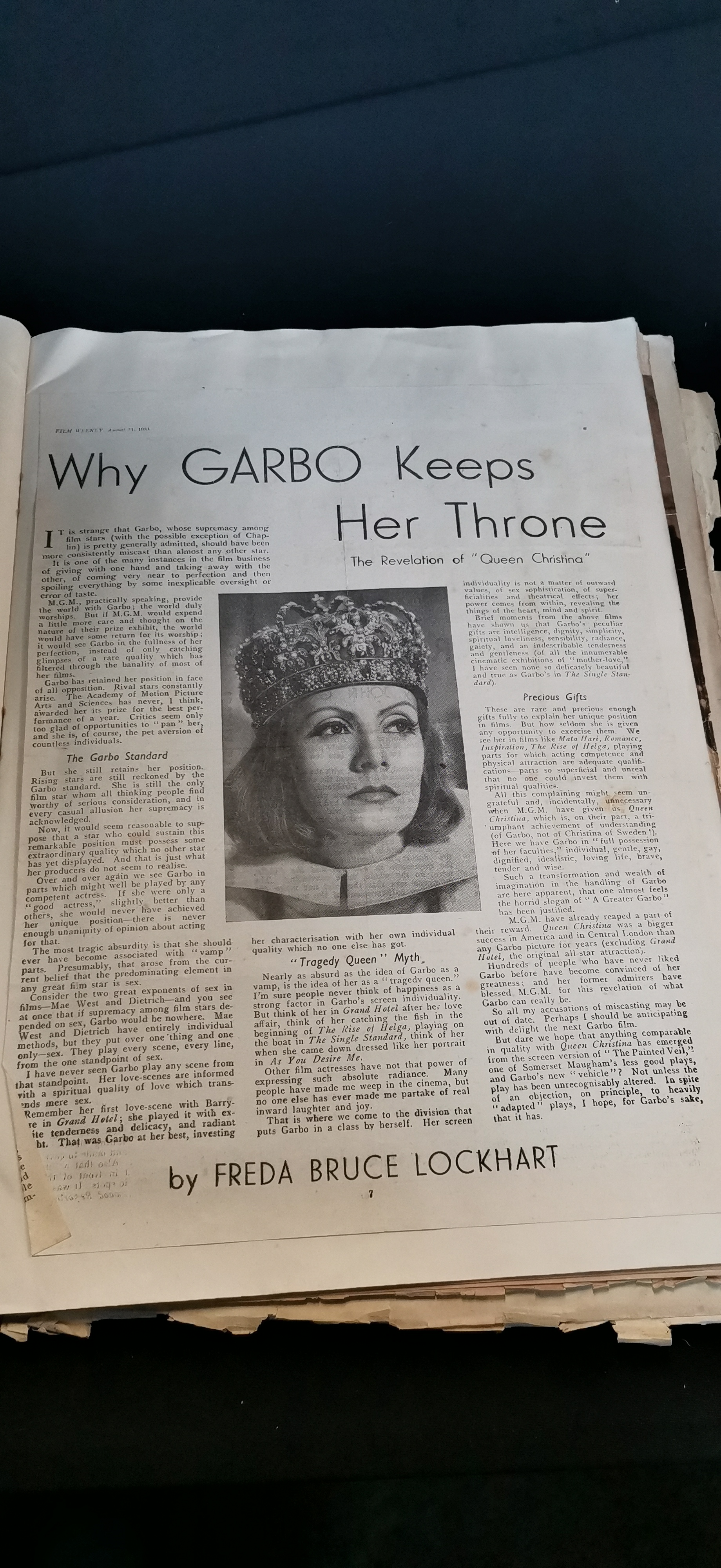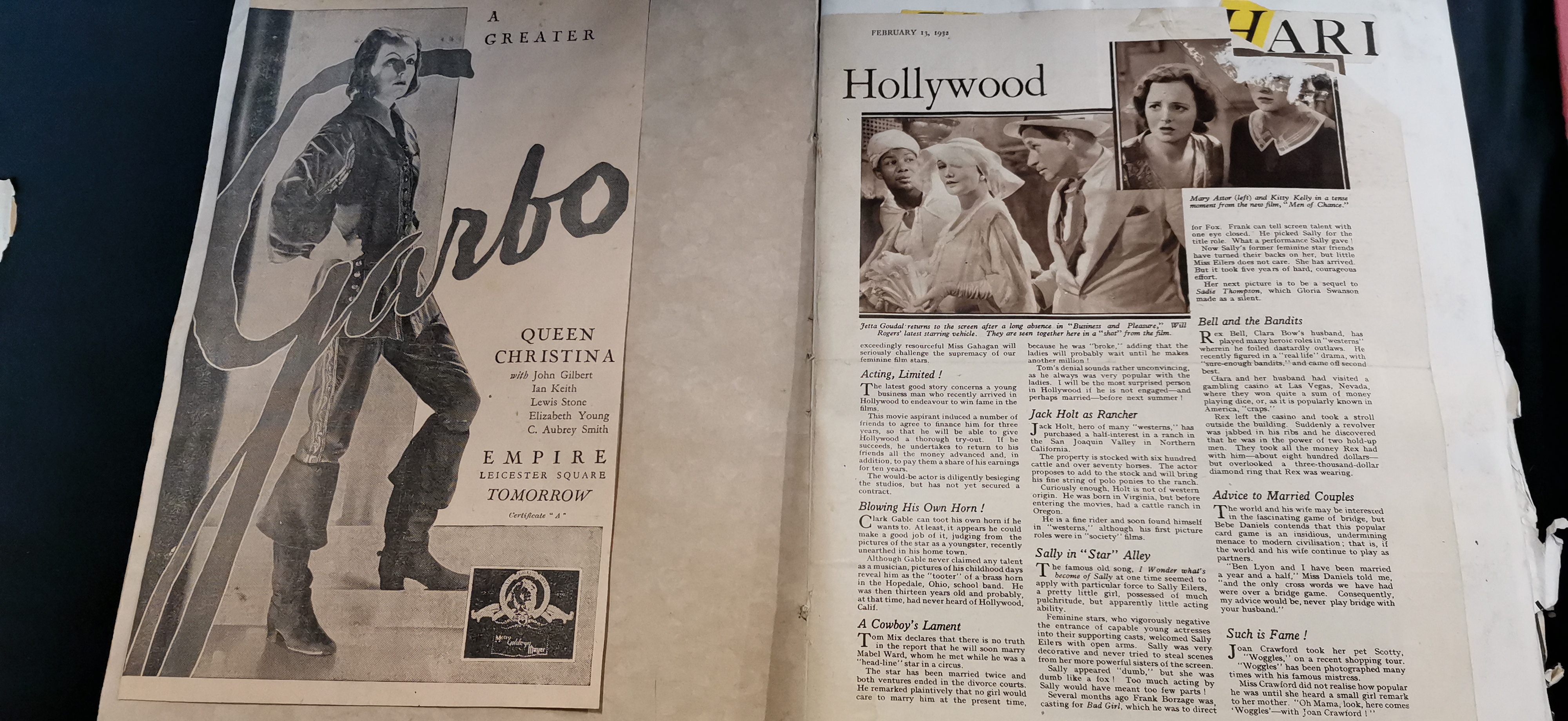 A collection of vintage scrapbooks and ephemera featuring actress Greta Garbo, including cream and red covers with photographic portraits and various newspaper clippings.